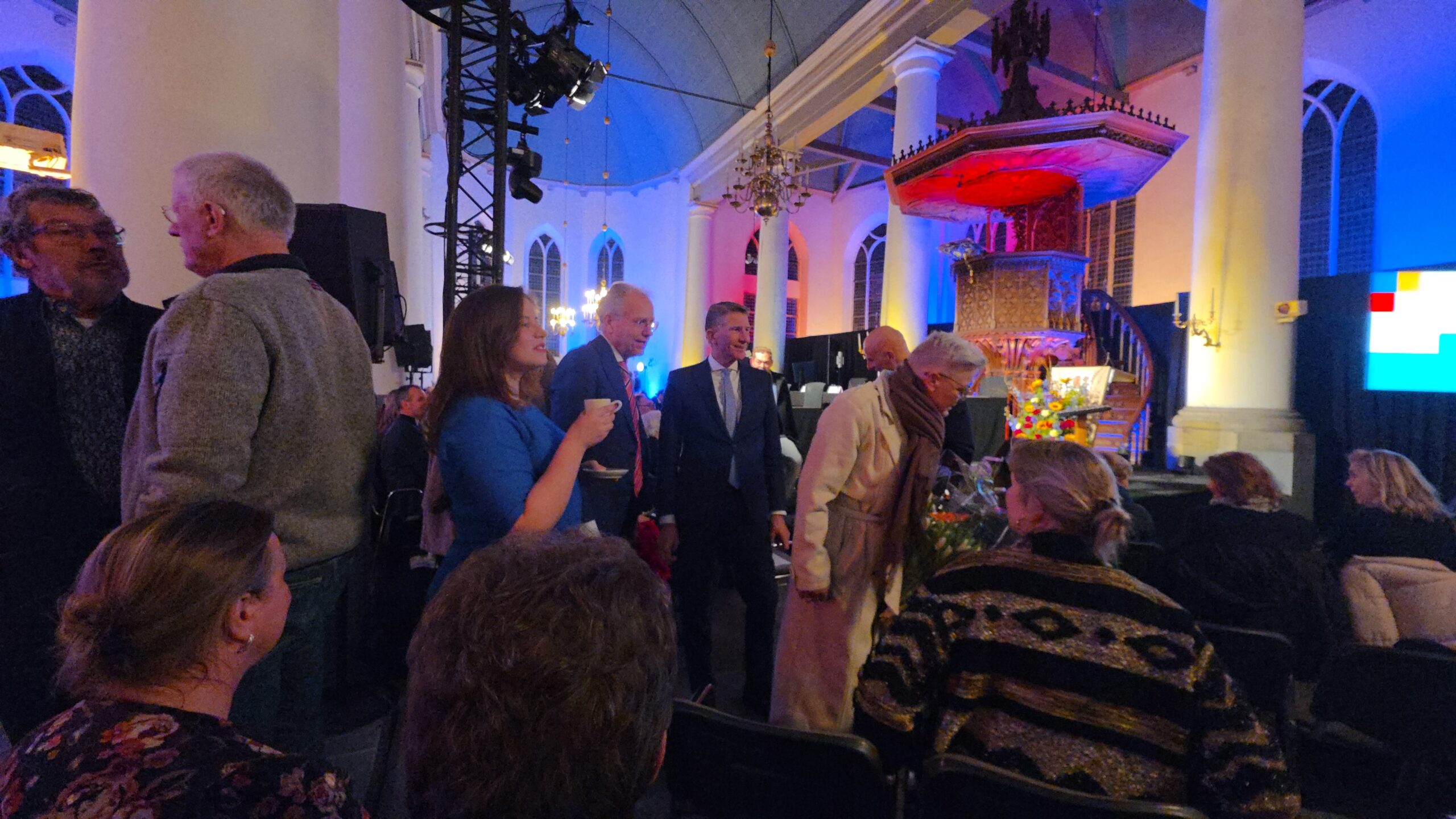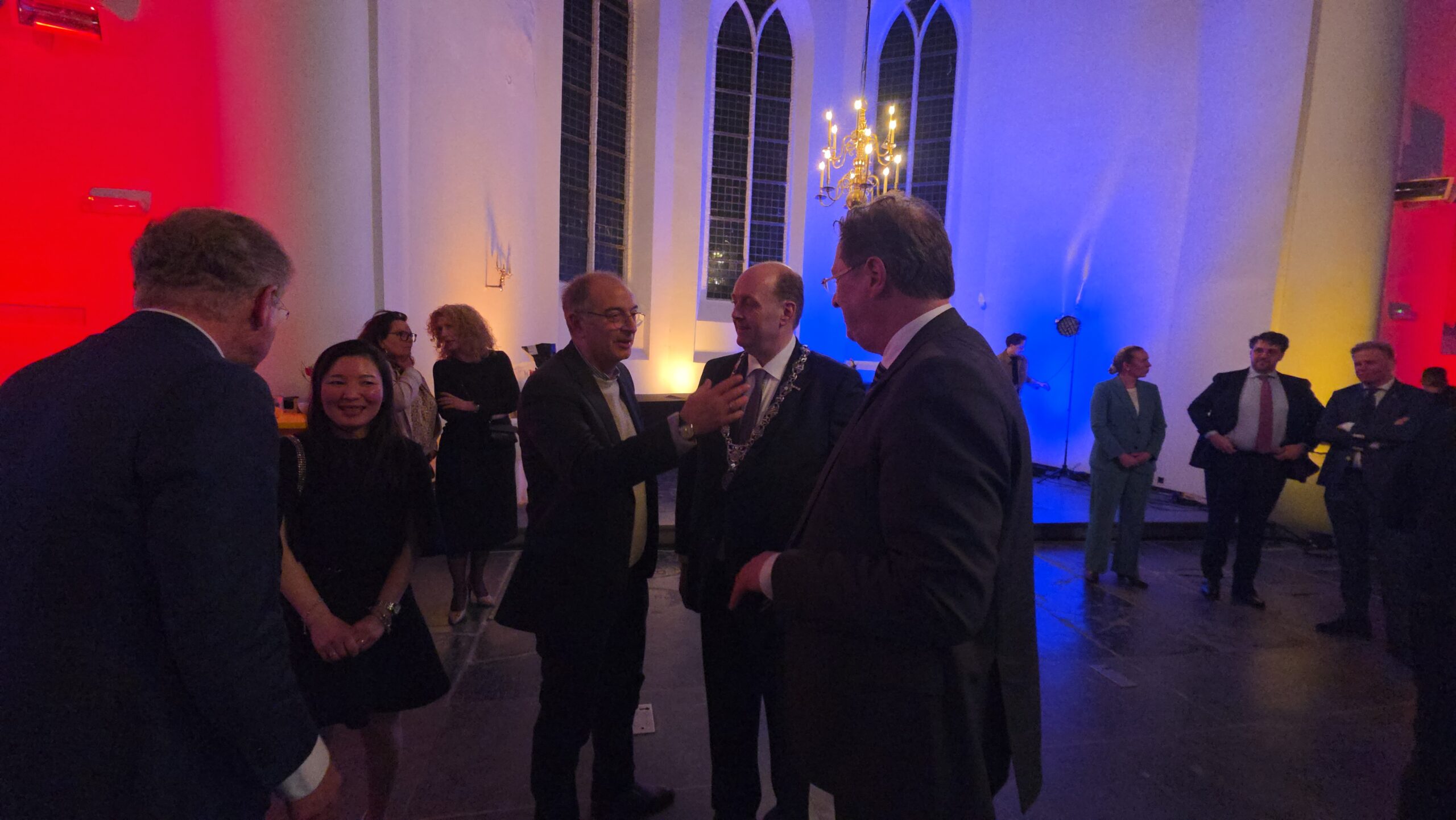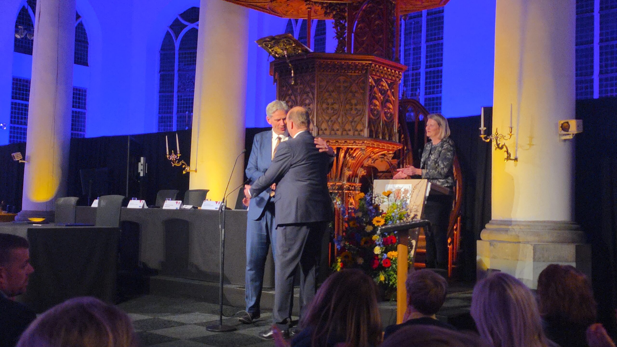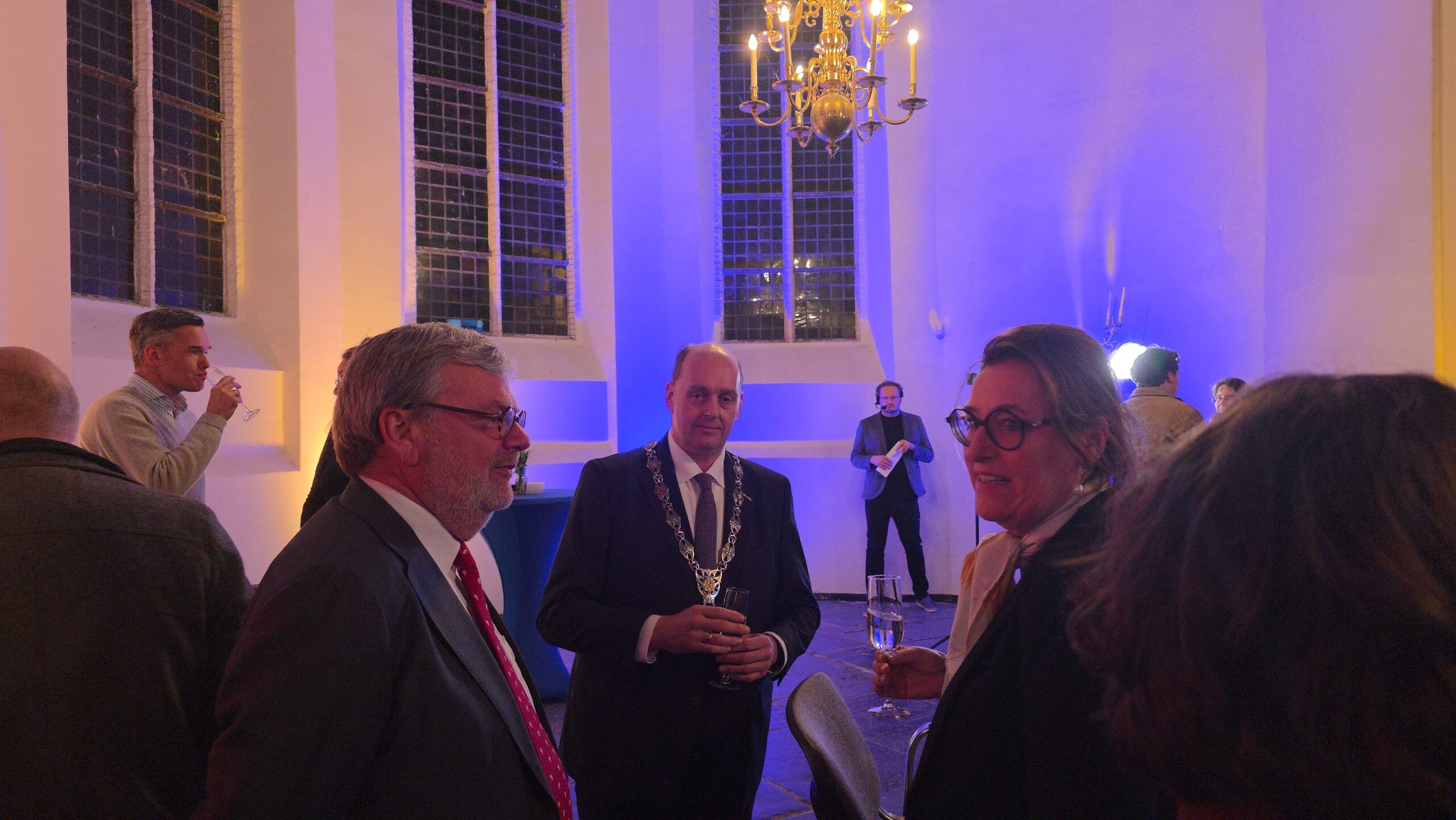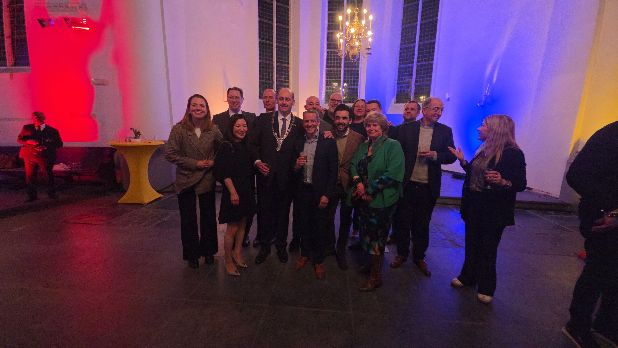 Om de bijzondere gebeurtenis bij te wonen was een hele delegatie uit Leiden afgereisd naar Vlaardingen. Daaronder en flink deel van de VVD-fractie, oud-wethouders Paul Laudy en Rogier van der Sande en ook oud-wethouder Yvonne van Delft die sinds begin deze maand directeur is van Stroomopwaarts. Dat is het reïntegratiebedrijf van onder andere Vlaardingen.