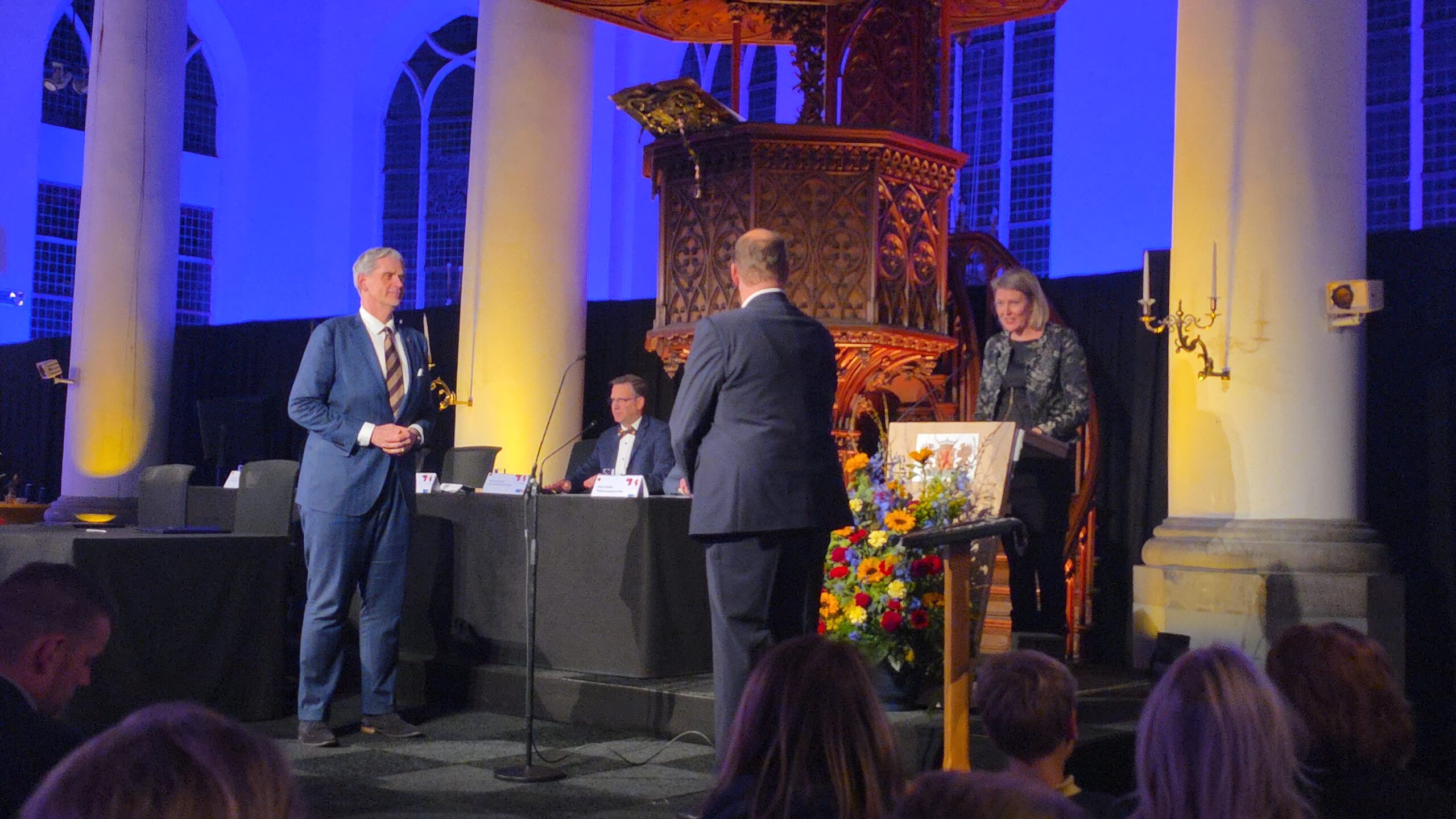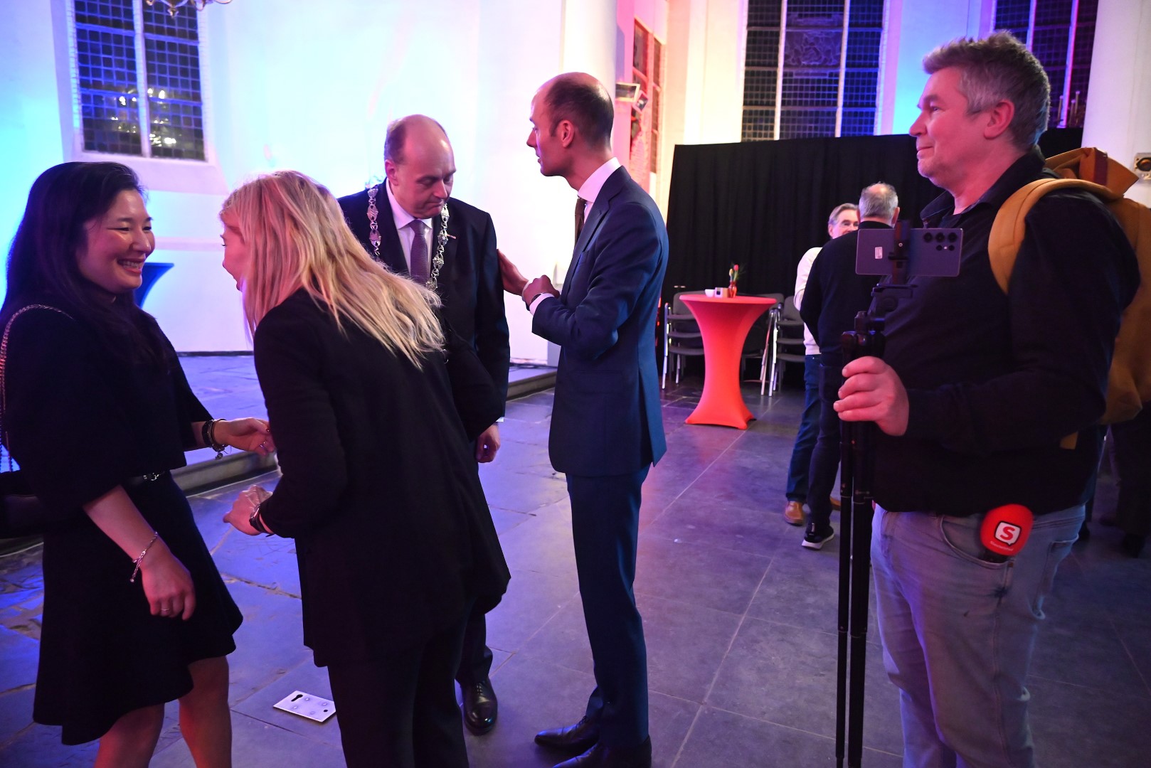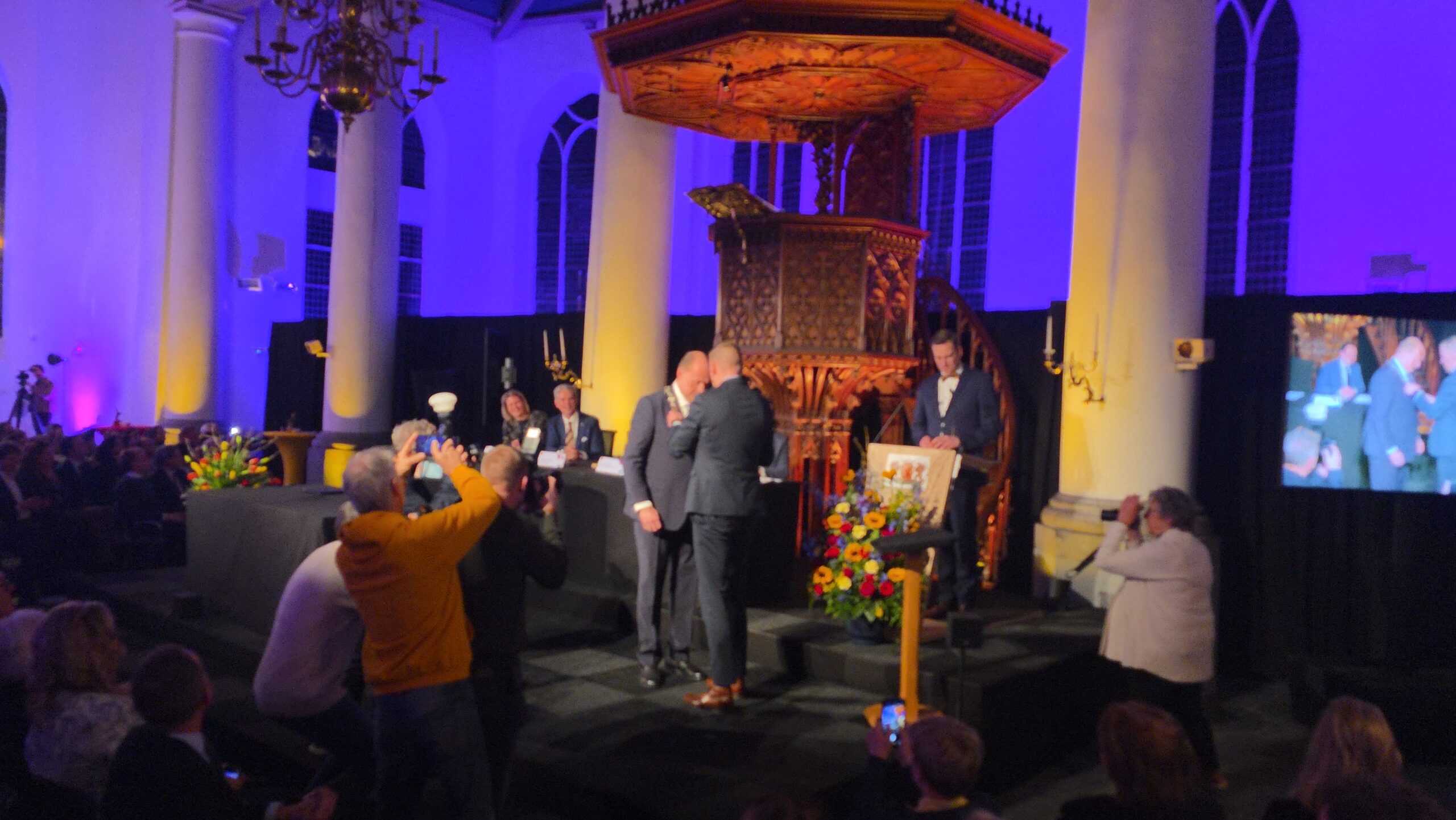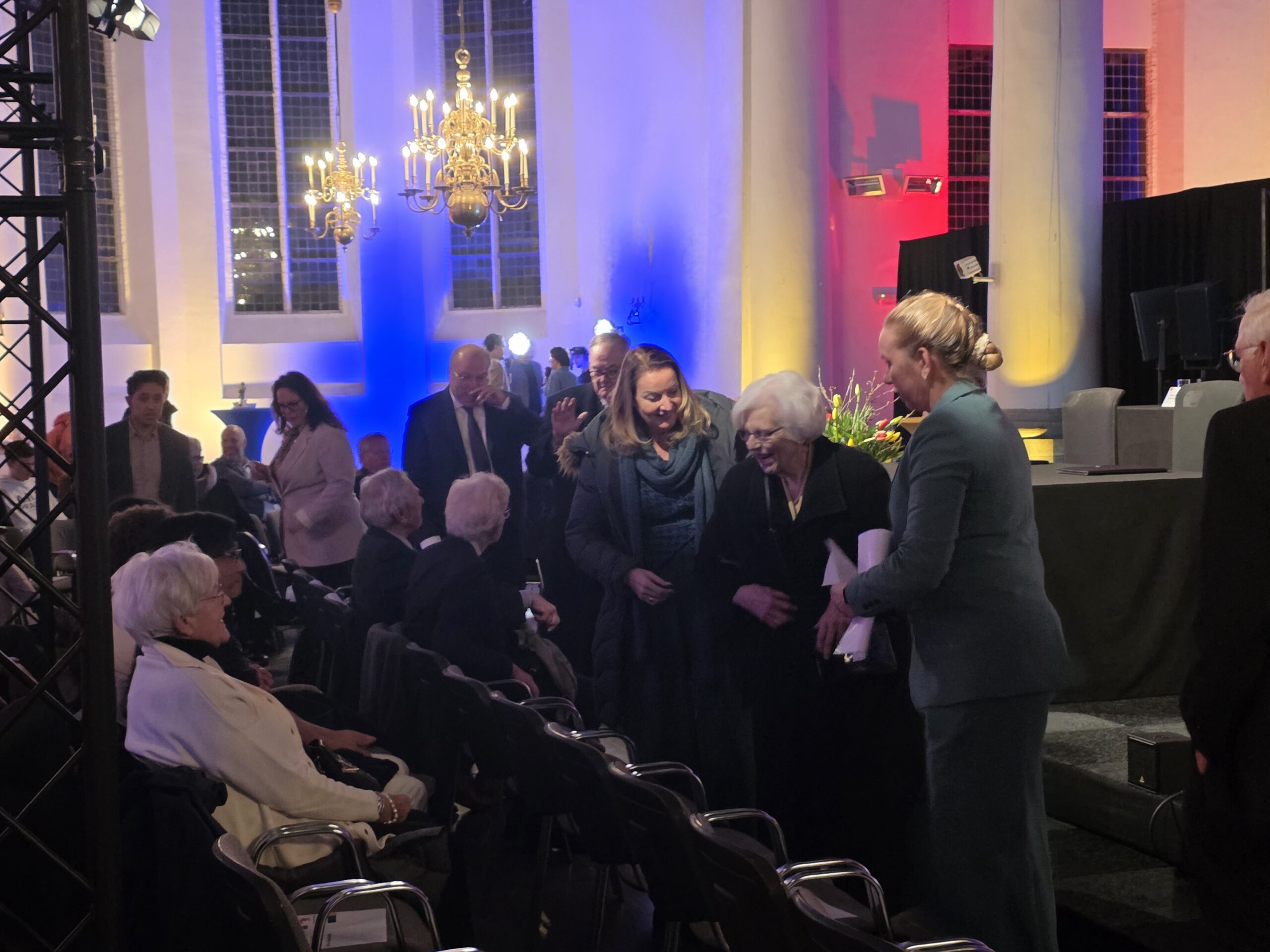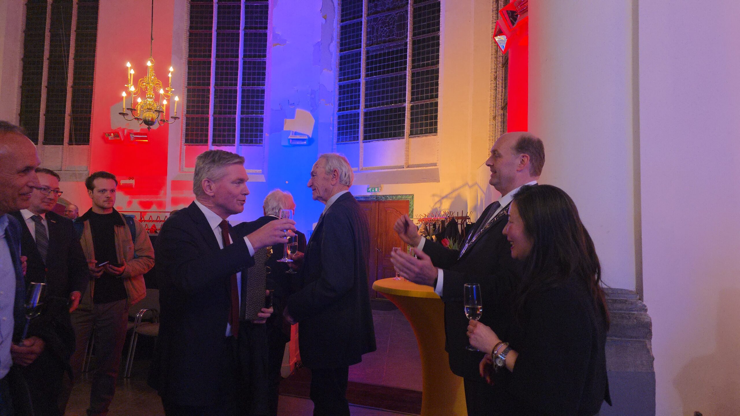 Om de bijzondere gebeurtenis bij te wonen was een hele delegatie uit Leiden afgereisd naar Vlaardingen. Daaronder en flink deel van de VVD-fractie, oud-wethouders Paul Laudy en Rogier van der Sande en ook oud-wethouder Yvonne van Delft die sinds begin deze maand directeur is van Stroomopwaarts. Dat is het reïntegratiebedrijf van onder andere Vlaardingen.