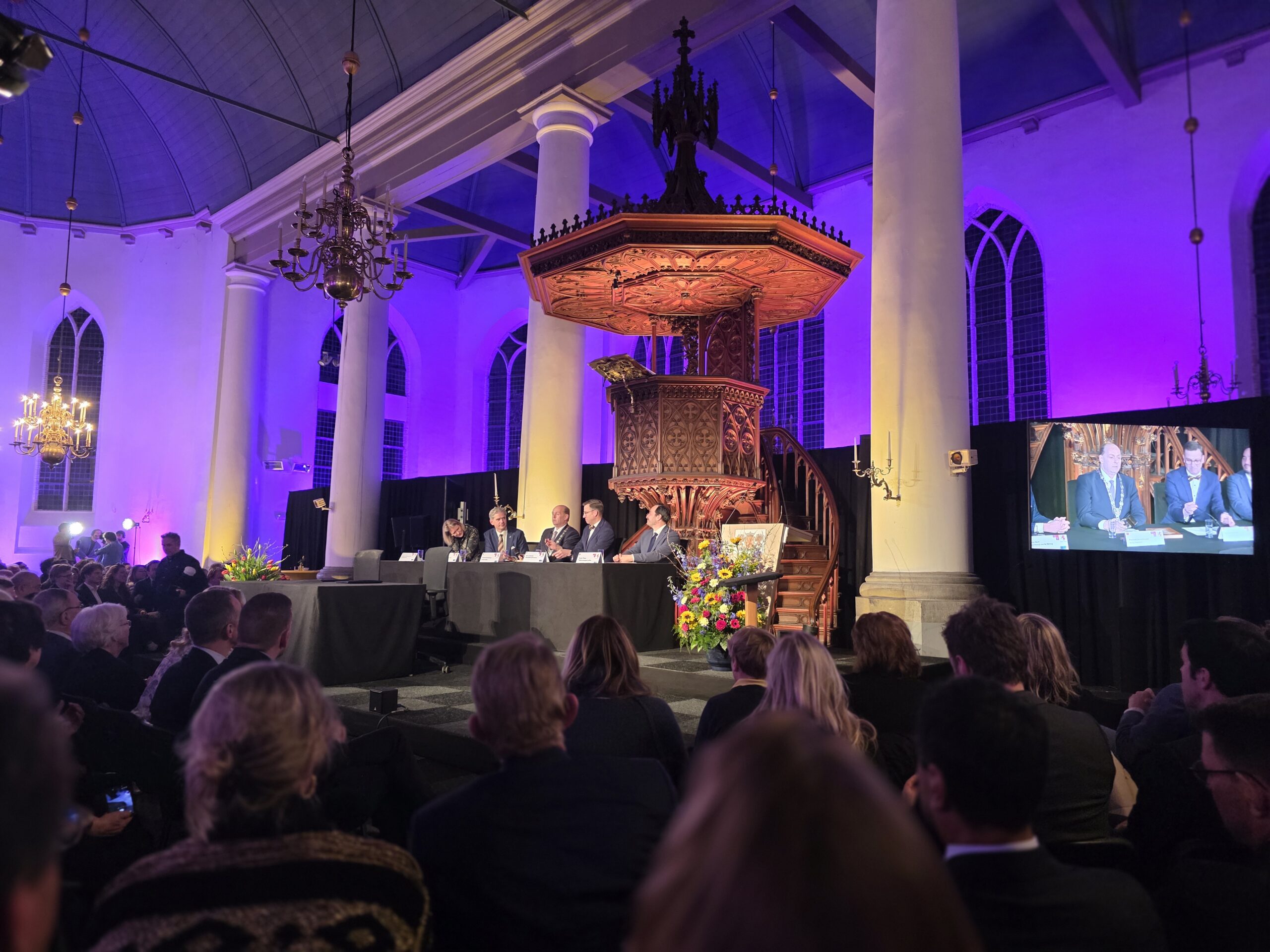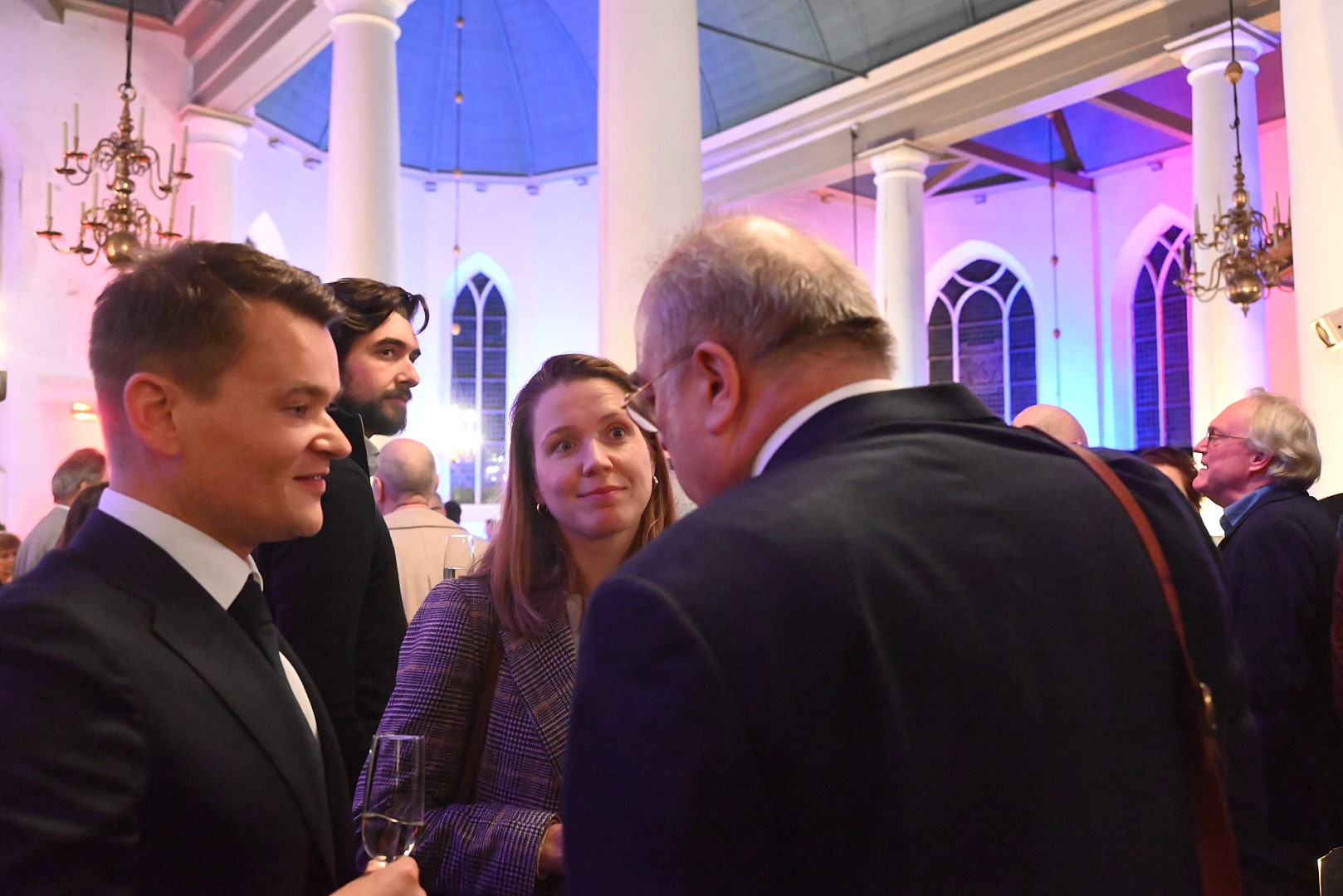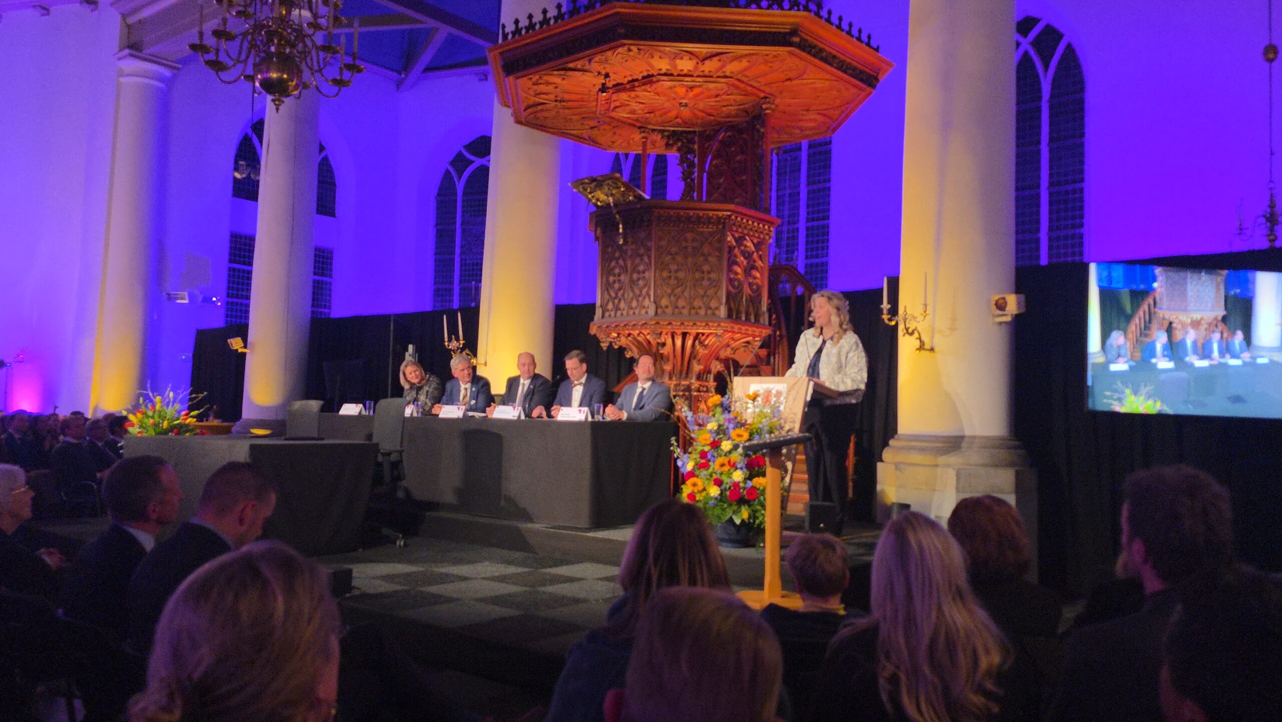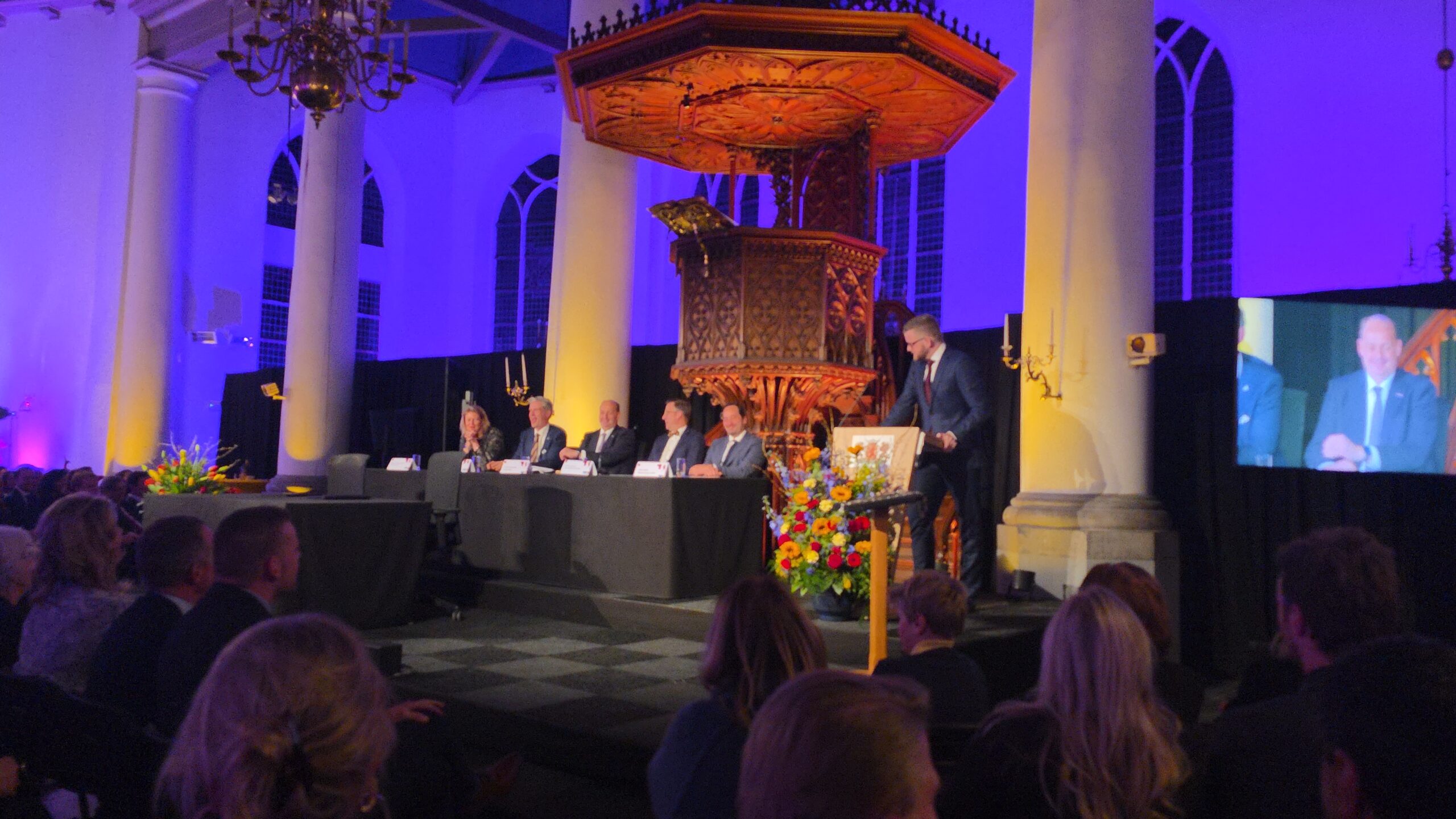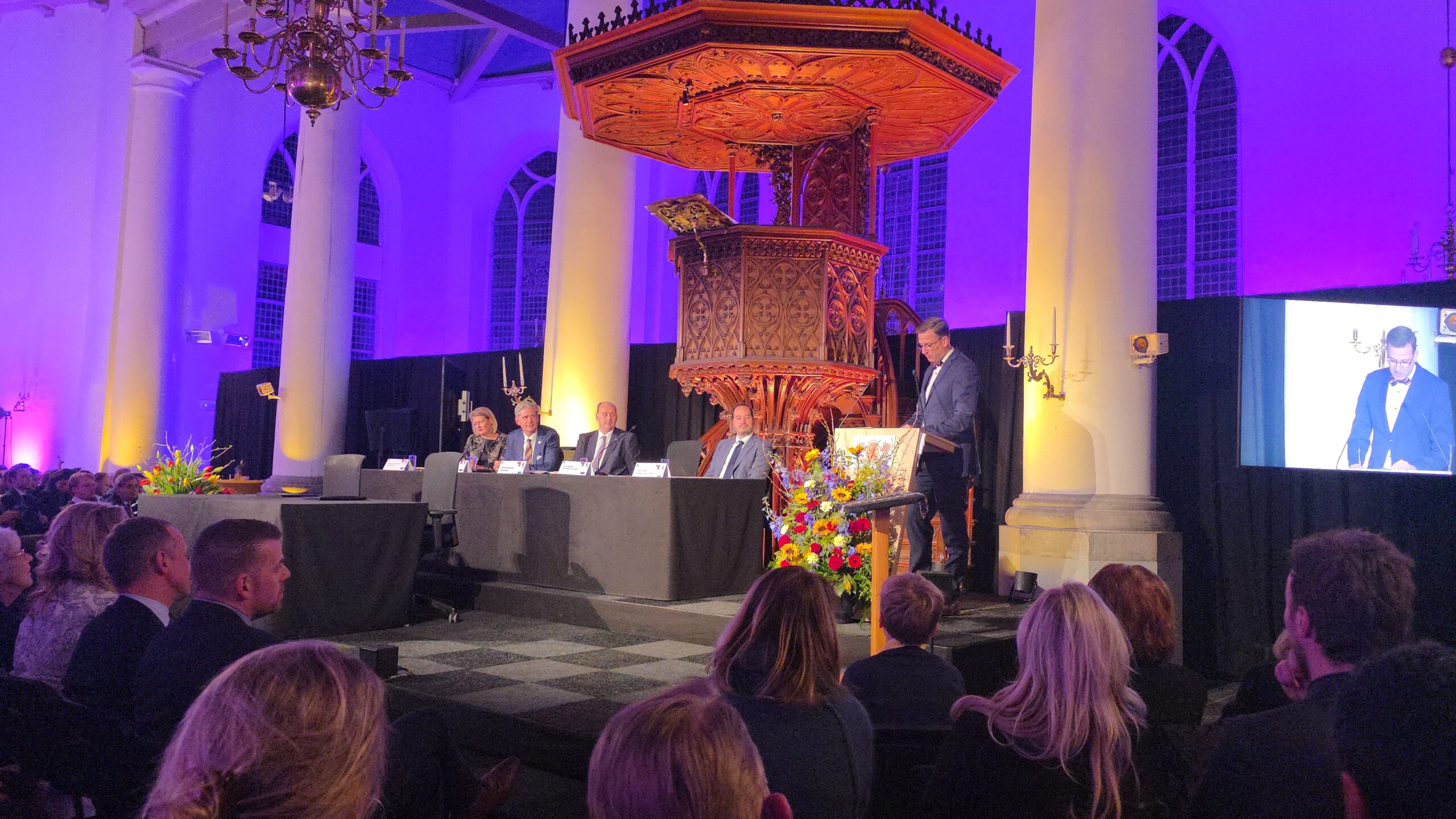 Om de bijzondere gebeurtenis bij te wonen was een hele delegatie uit Leiden afgereisd naar Vlaardingen. Daaronder en flink deel van de VVD-fractie, oud-wethouders Paul Laudy en Rogier van der Sande en ook oud-wethouder Yvonne van Delft die sinds begin deze maand directeur is van Stroomopwaarts. Dat is het reïntegratiebedrijf van onder andere Vlaardingen.