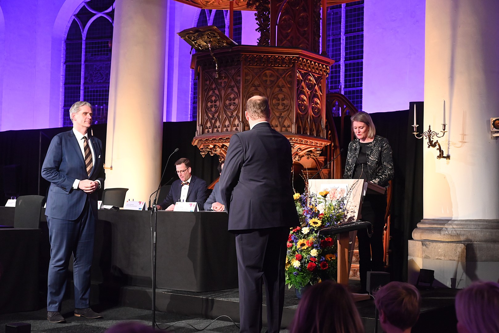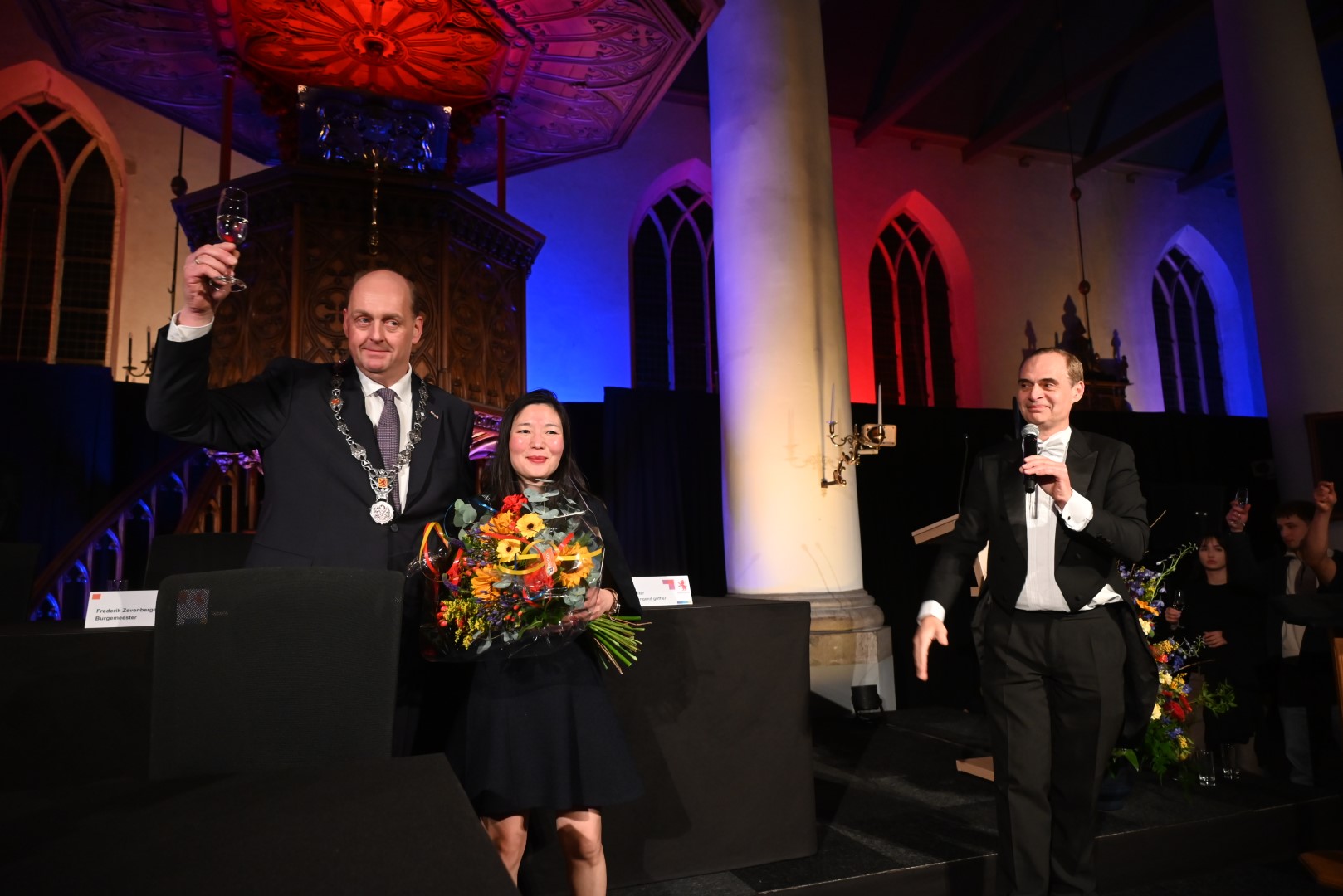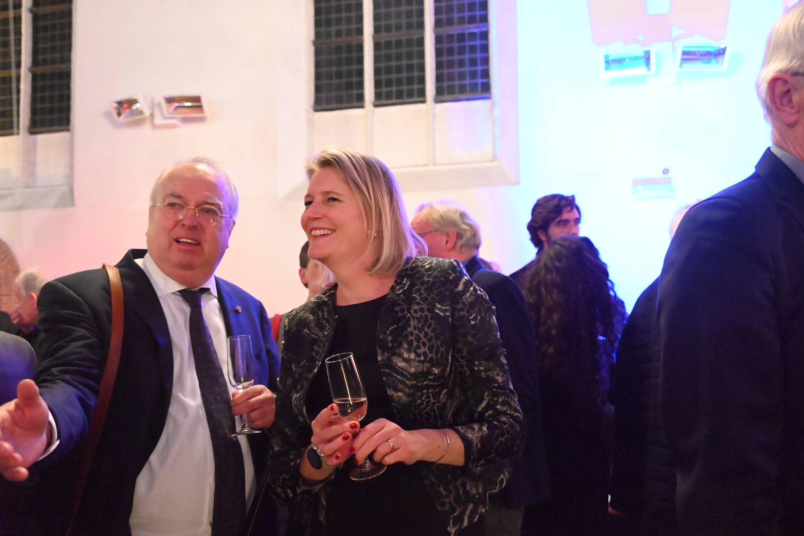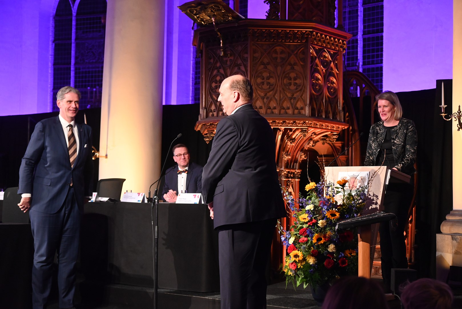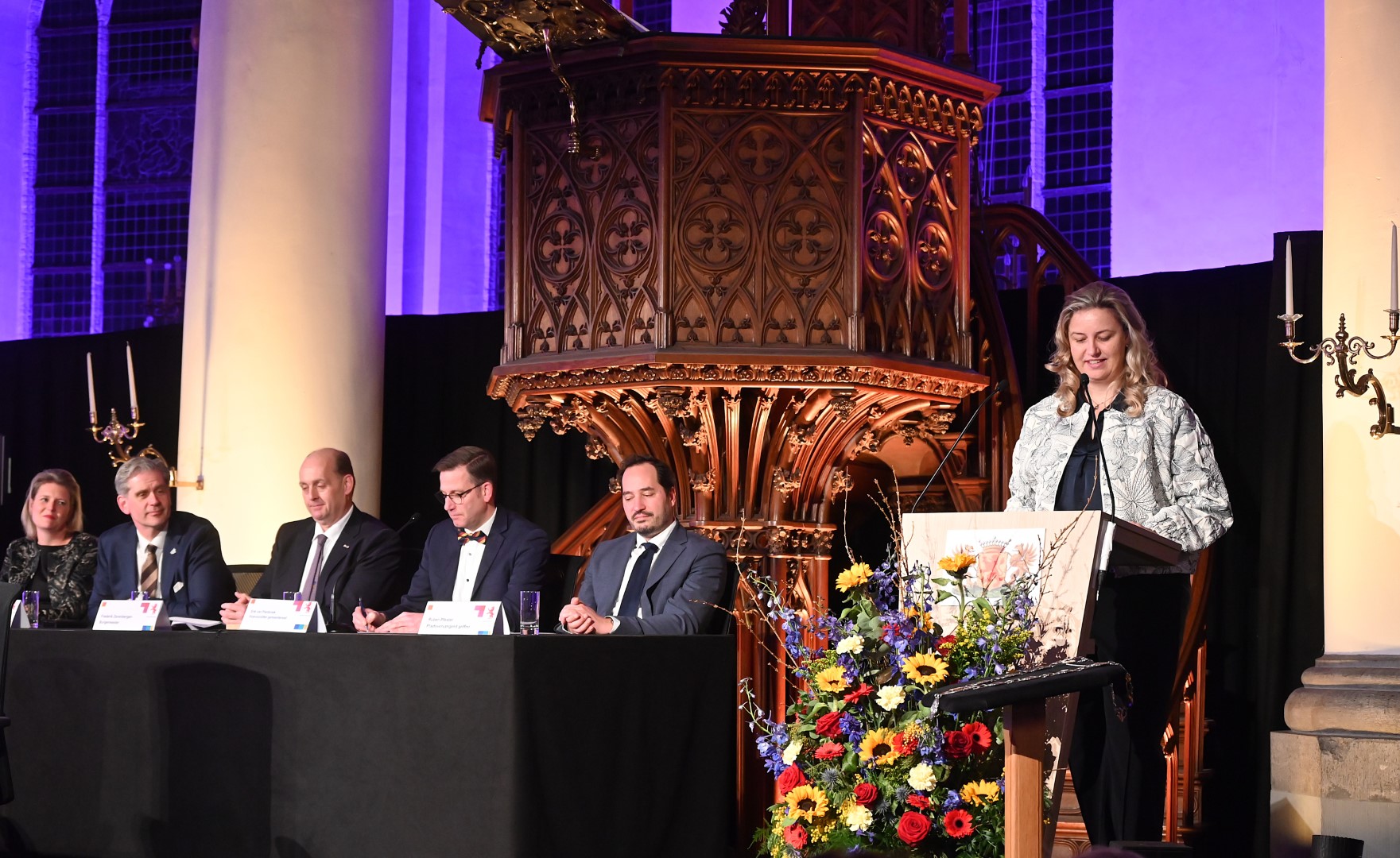 Om de bijzondere gebeurtenis bij te wonen was een hele delegatie uit Leiden afgereisd naar Vlaardingen. Daaronder en flink deel van de VVD-fractie, oud-wethouders Paul Laudy en Rogier van der Sande en ook oud-wethouder Yvonne van Delft die sinds begin deze maand directeur is van Stroomopwaarts. Dat is het reïntegratiebedrijf van onder andere Vlaardingen.