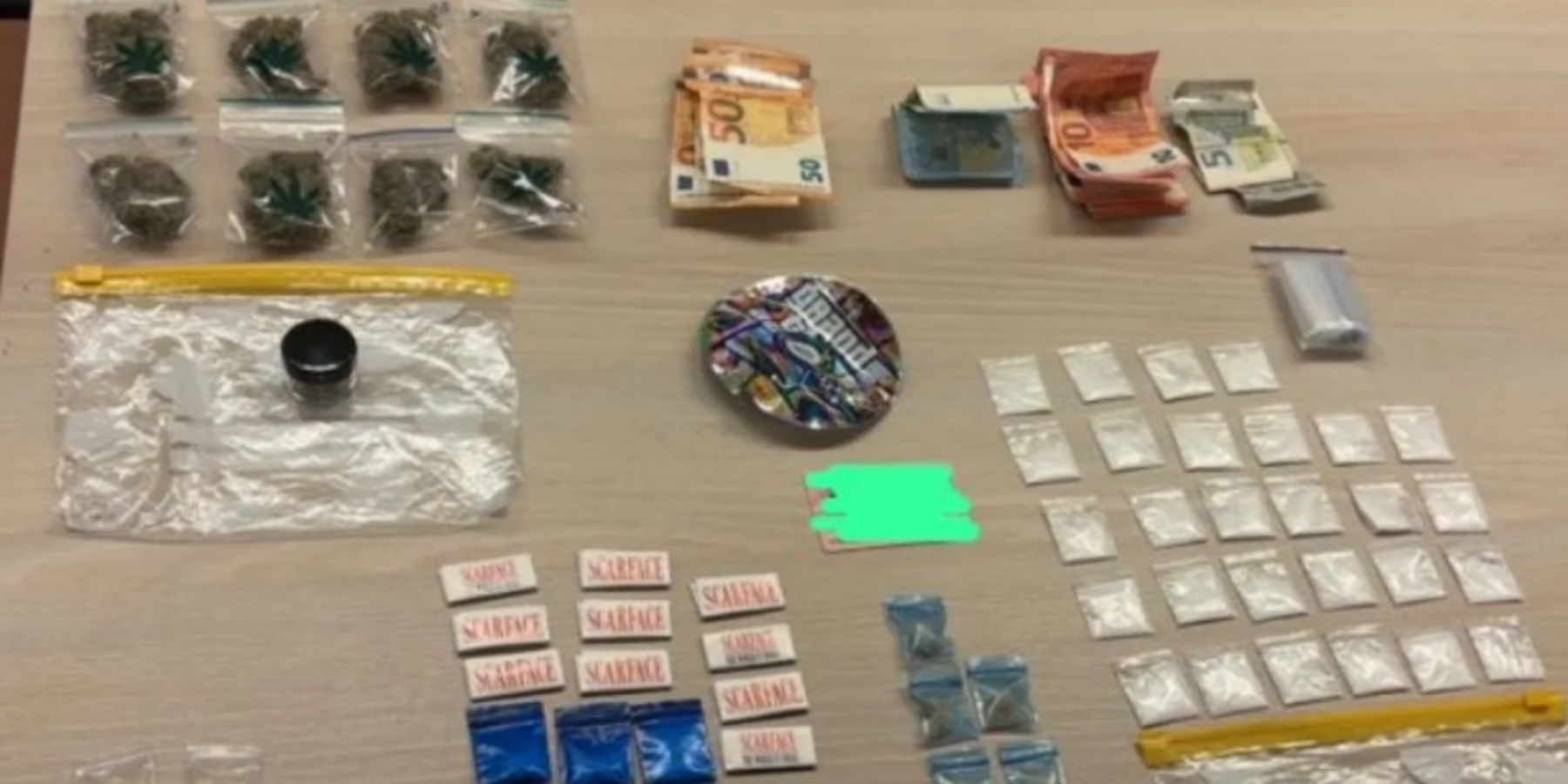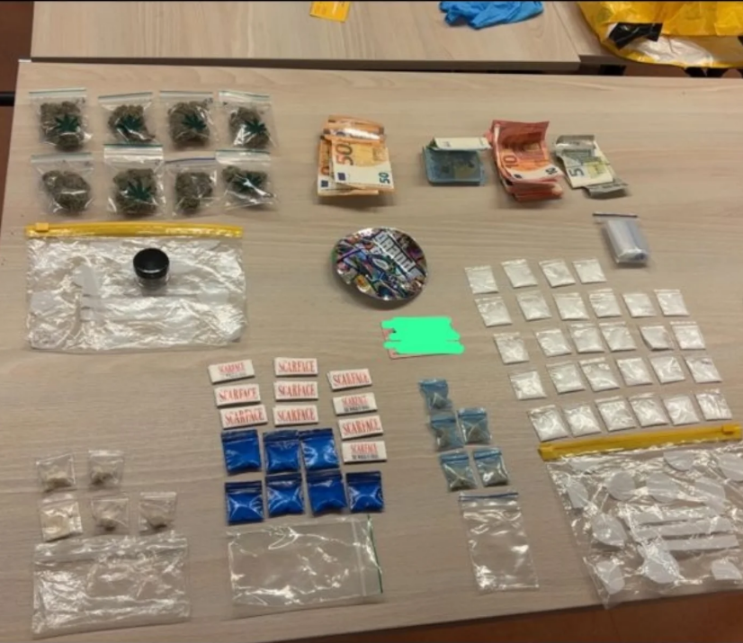 De politie trof bij de controle 28 zakjes cocaïne en 10 zakjes speed aan. Ook lagen er in de auto nog 10 ponypacks met cocaïne, 8 zakjes hennep, een grinder met hasj en nog eens 7 zakjes waar vermoedelijk crack in zat.