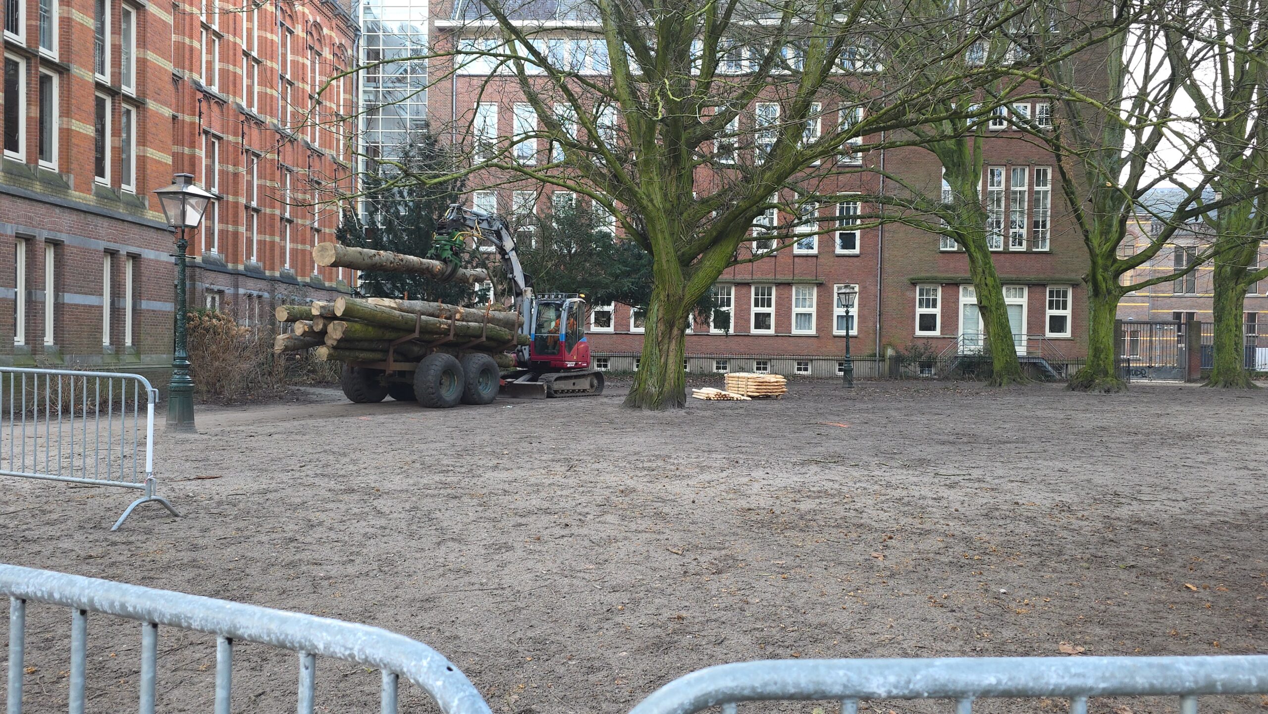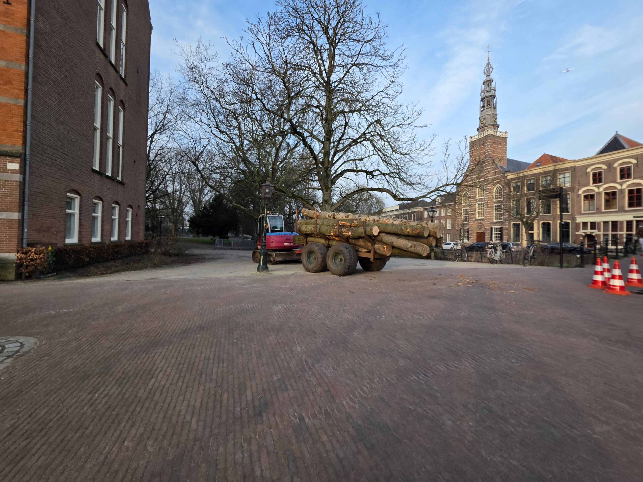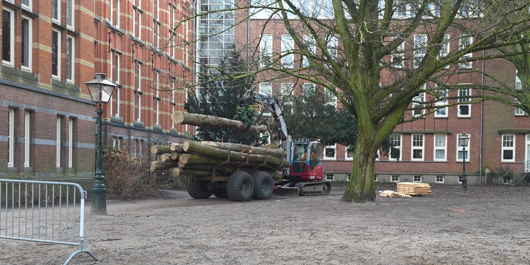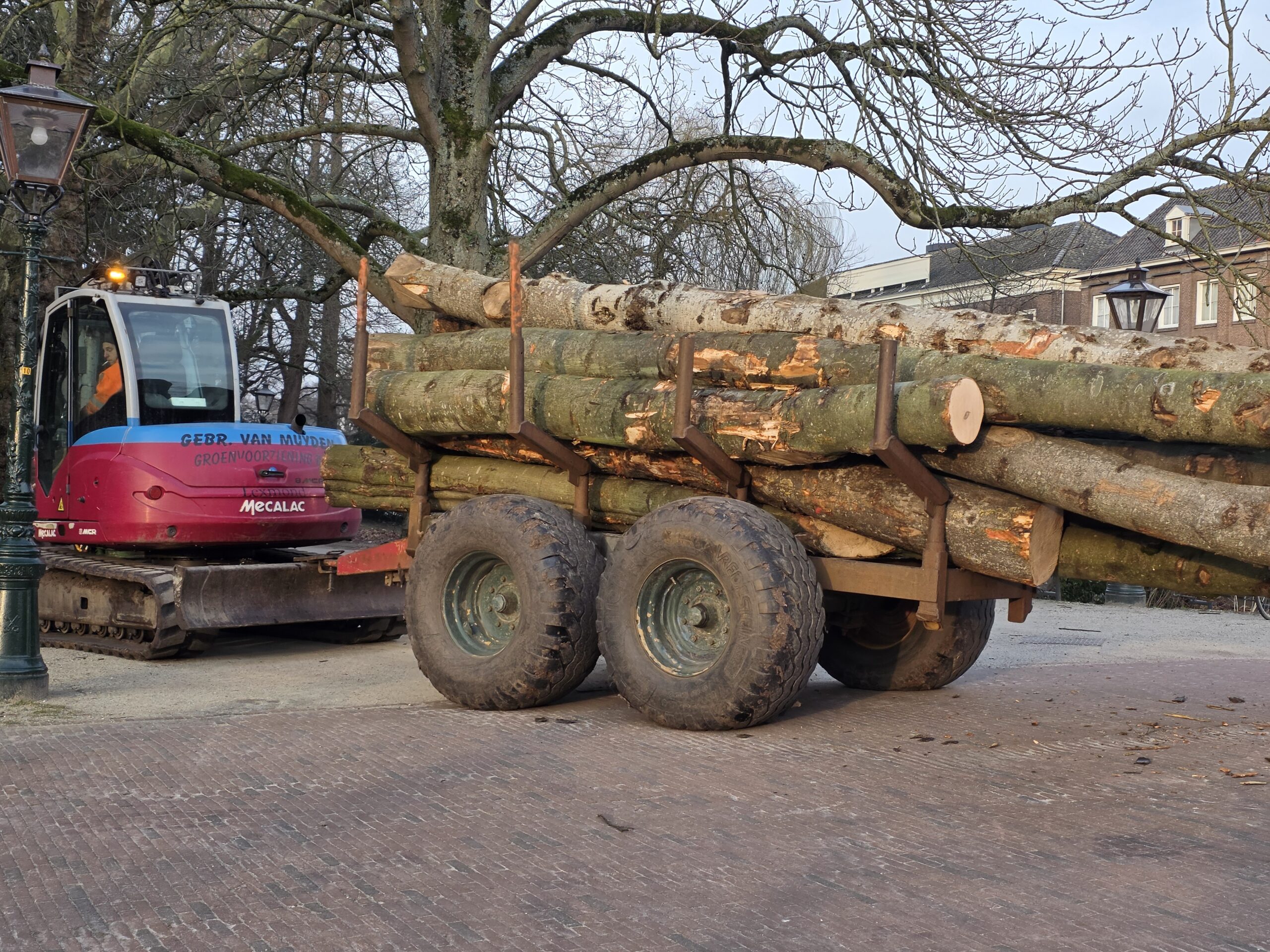 Vrachtladingen boomstammen werden dinsdag het Van der Werfpark binnengereden. Het gaat om gekapte bomen van elders die in het park een tweede leven krijgen. De stammen worden rond de plantvakken neergelegd, om te voorkomen dat bezoekers van het park er dwars doorheen banjeren.
