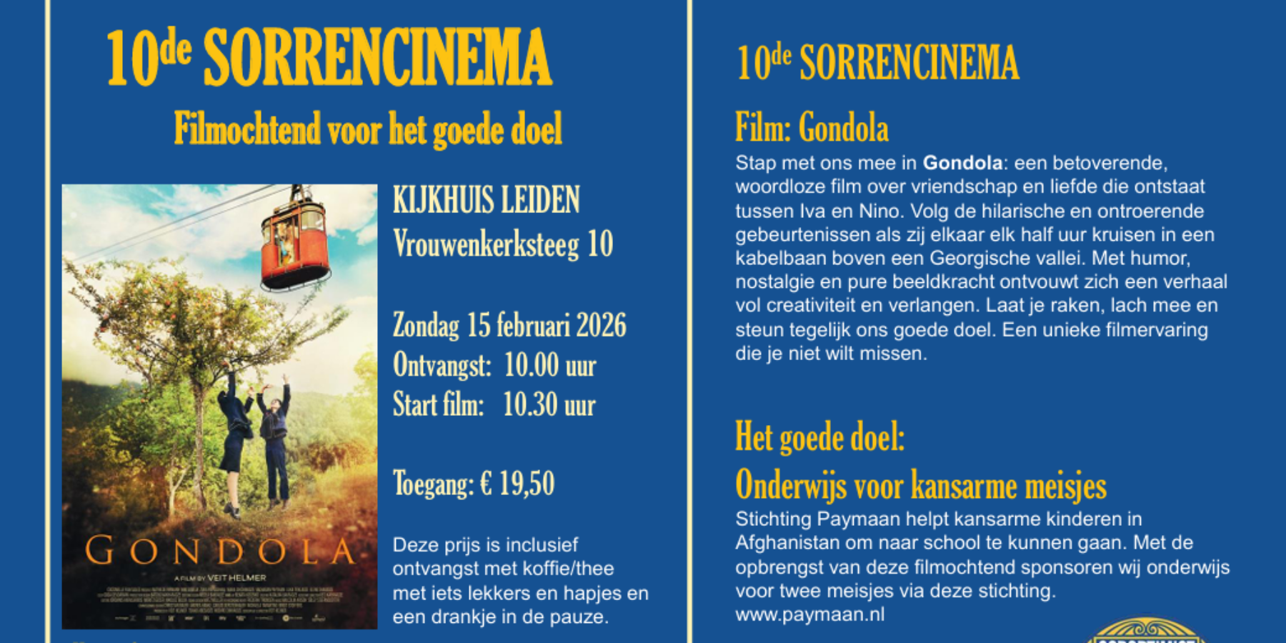 Soroptimistclub Leiden Aurora organiseert zondagochtend 15 februari alweer de tiende Sorrencinema in het Kijkhuis in Leiden. Het is een filmochtend waarbij de opbrengst bestemd is voor een goed doel.