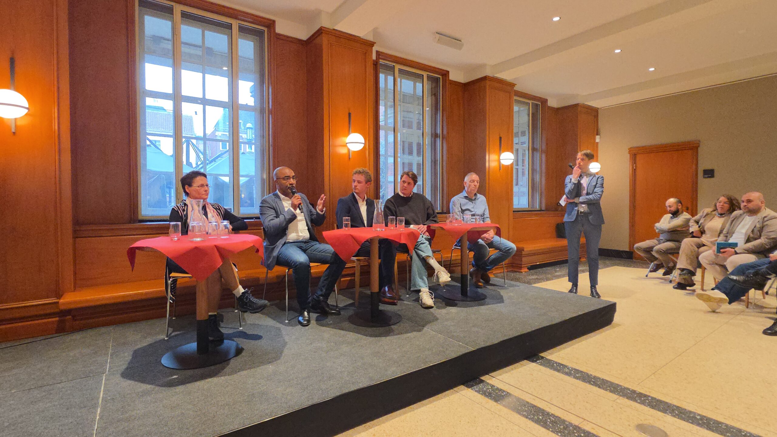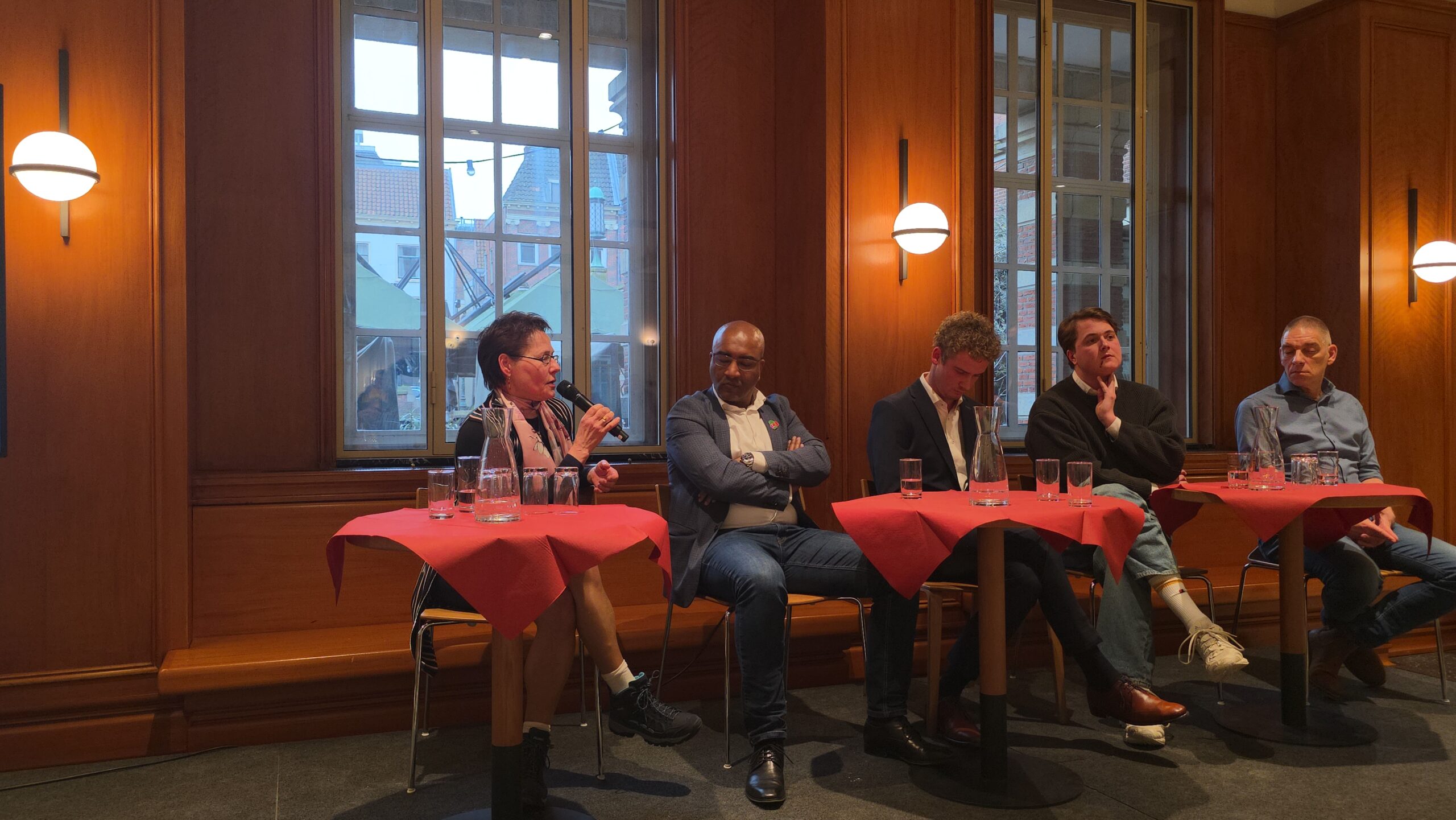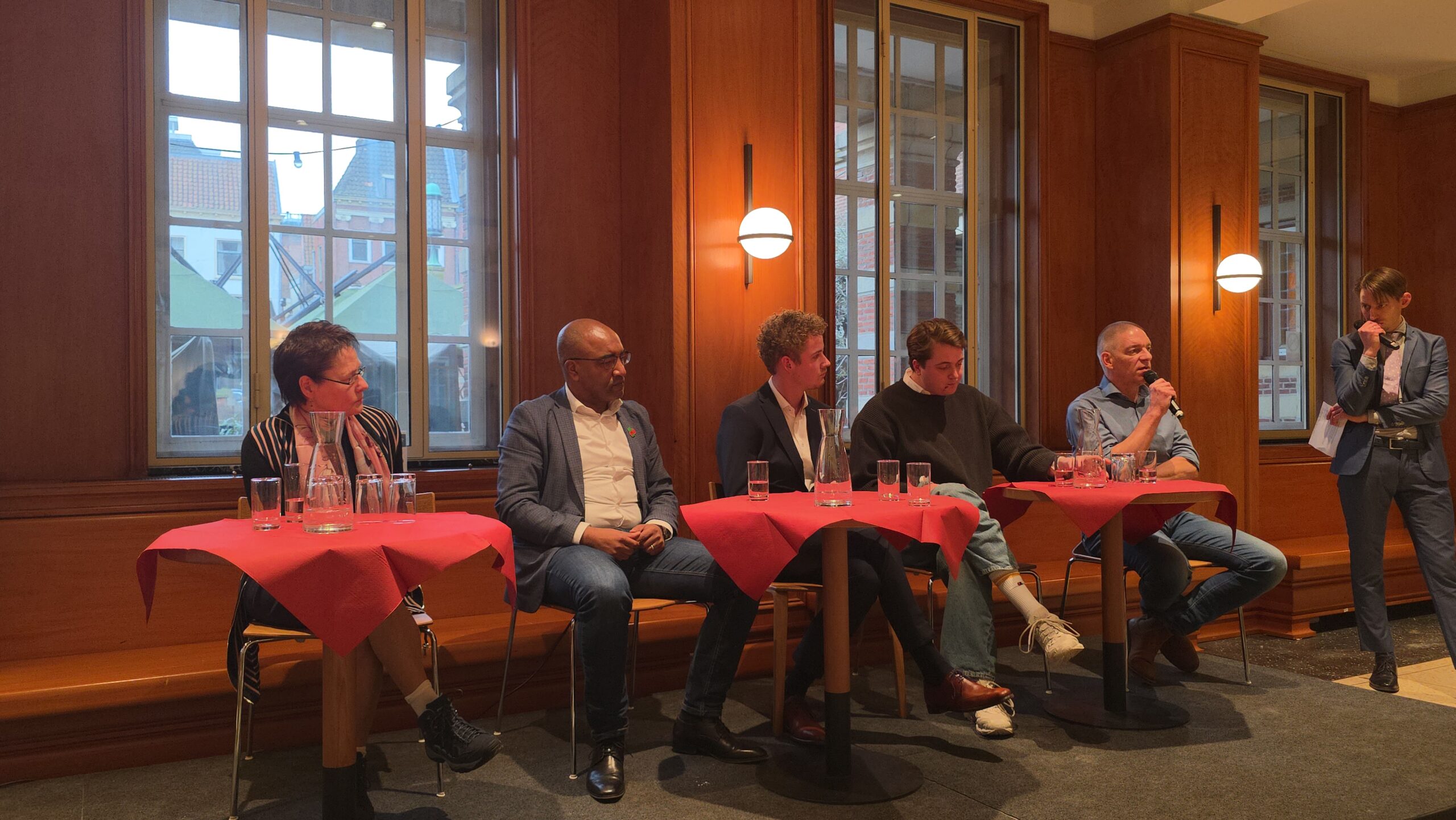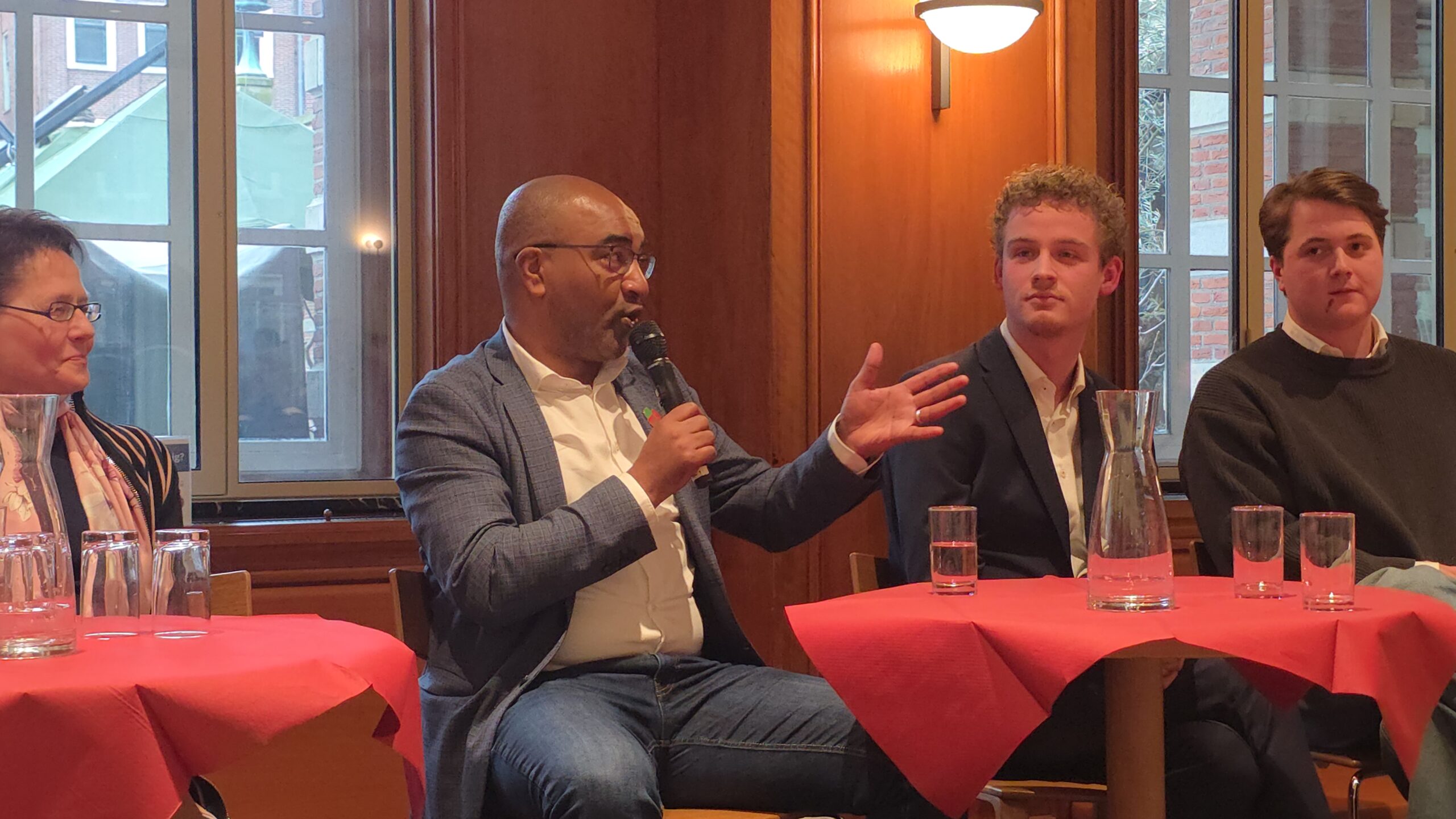Nadat voorzitter Hassan Elwali van Islamitisch Centrum Imam Malik en voorzitter Fatih Yilmaz van de Stichting Fatih Leiden de aanwezigen welkom hadden geheten gingen de partijen onder leiding van Manders met elkaar in debat. Of eigenlijk in gesprek, want het ging er braaf aan toe. Dat kwam ook door de opzet, waarbij de partijen steeds met vijf tegelijk achter tafeltjes zaten en één microfoon deelden die werd doorgegeven. “Aan aan het einde kwam er toch wel echt een beetje vuur”, blikt mede-organisator Fatih Yilmaz na afloop tevreden terug.