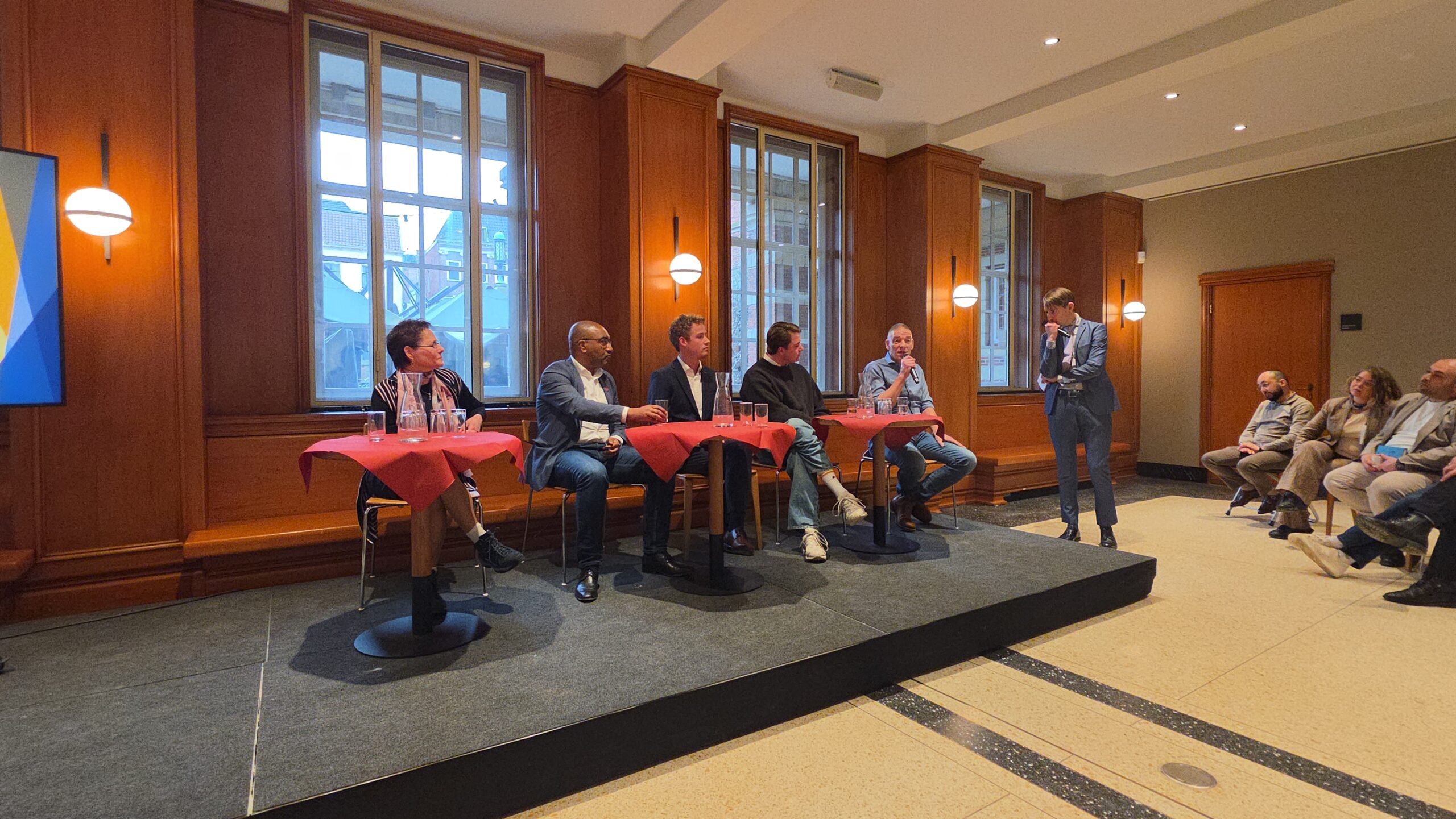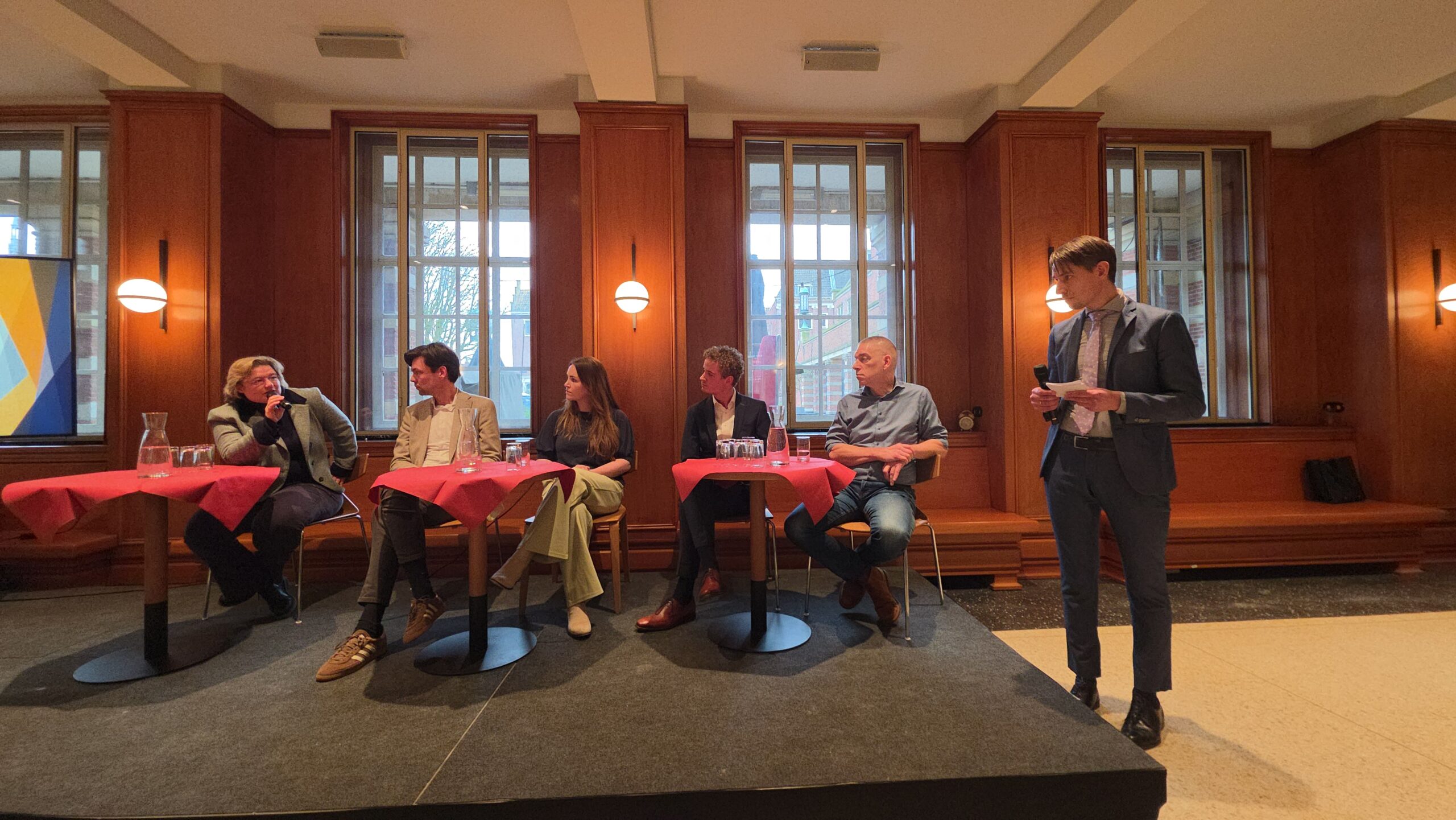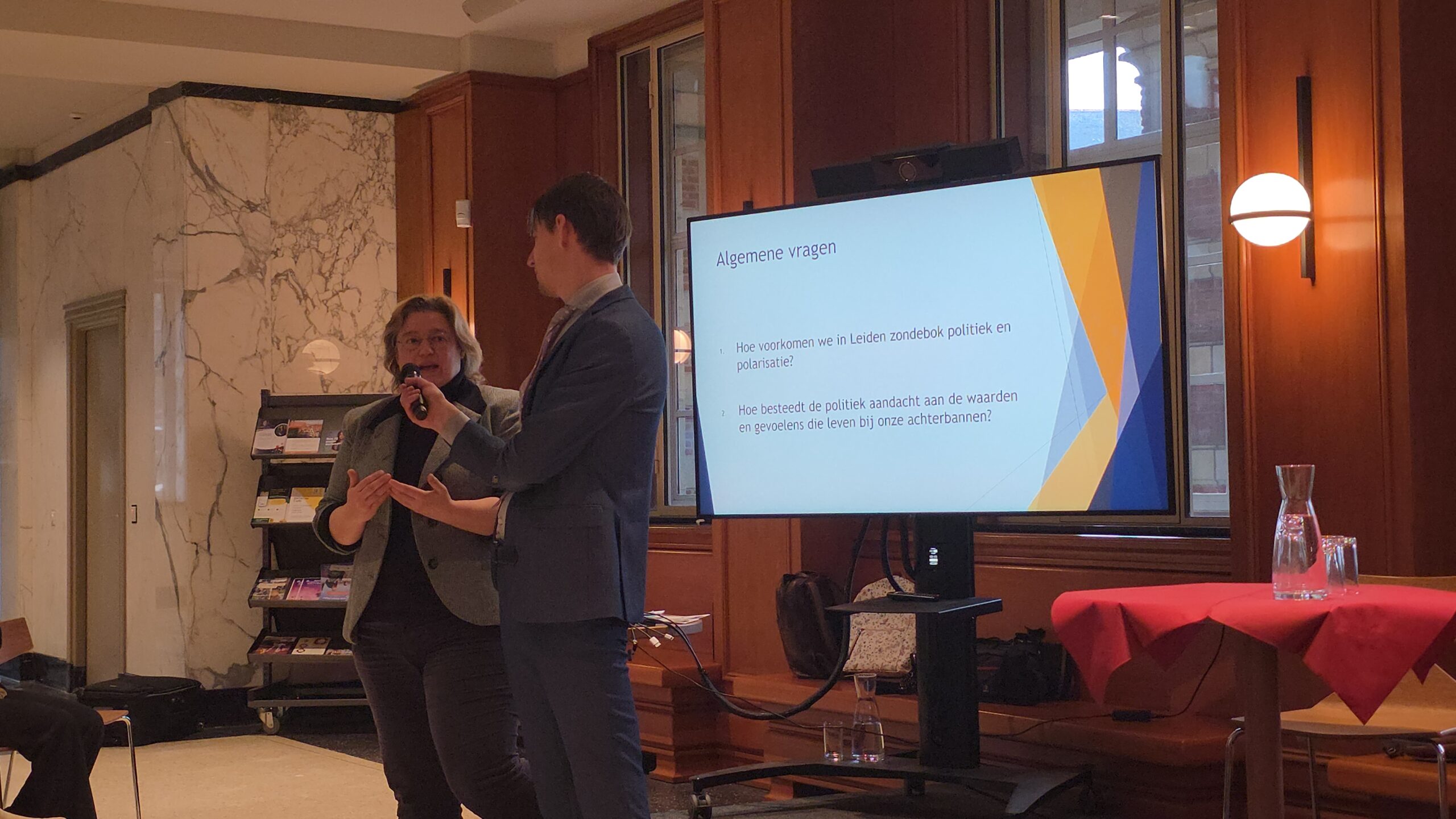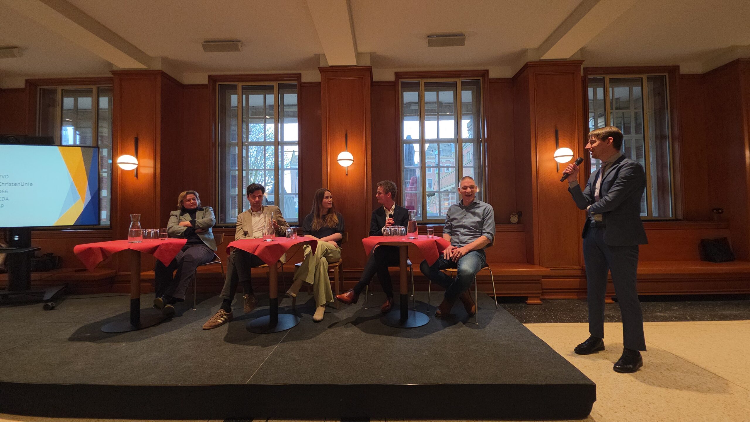 Nadat voorzitter Hassan Elwali van Islamitisch Centrum Imam Malik en voorzitter Fatih Yilmaz van de Stichting Fatih Leiden de aanwezigen welkom hadden geheten gingen de partijen onder leiding van Manders met elkaar in debat. Of eigenlijk in gesprek, want het ging er braaf aan toe. Dat kwam ook door de opzet, waarbij de partijen steeds met vijf tegelijk achter tafeltjes zaten en één microfoon deelden die werd doorgegeven. “Aan aan het einde kwam er toch wel echt een beetje vuur”, blikt mede-organisator Fatih Yilmaz na afloop tevreden terug.