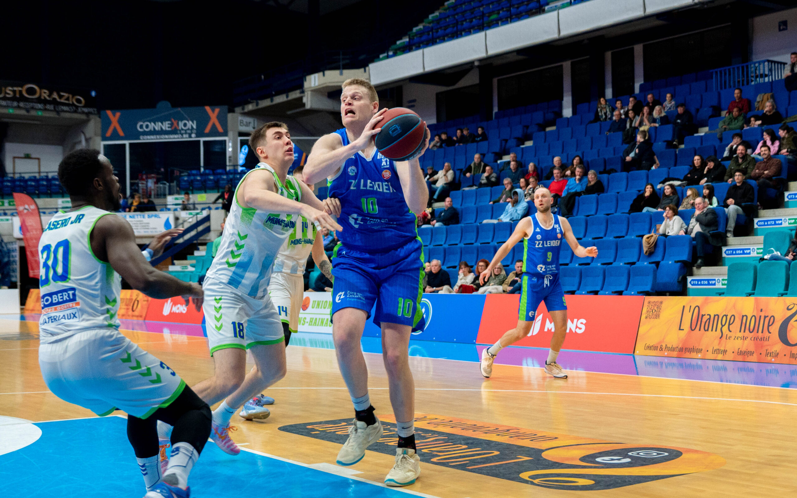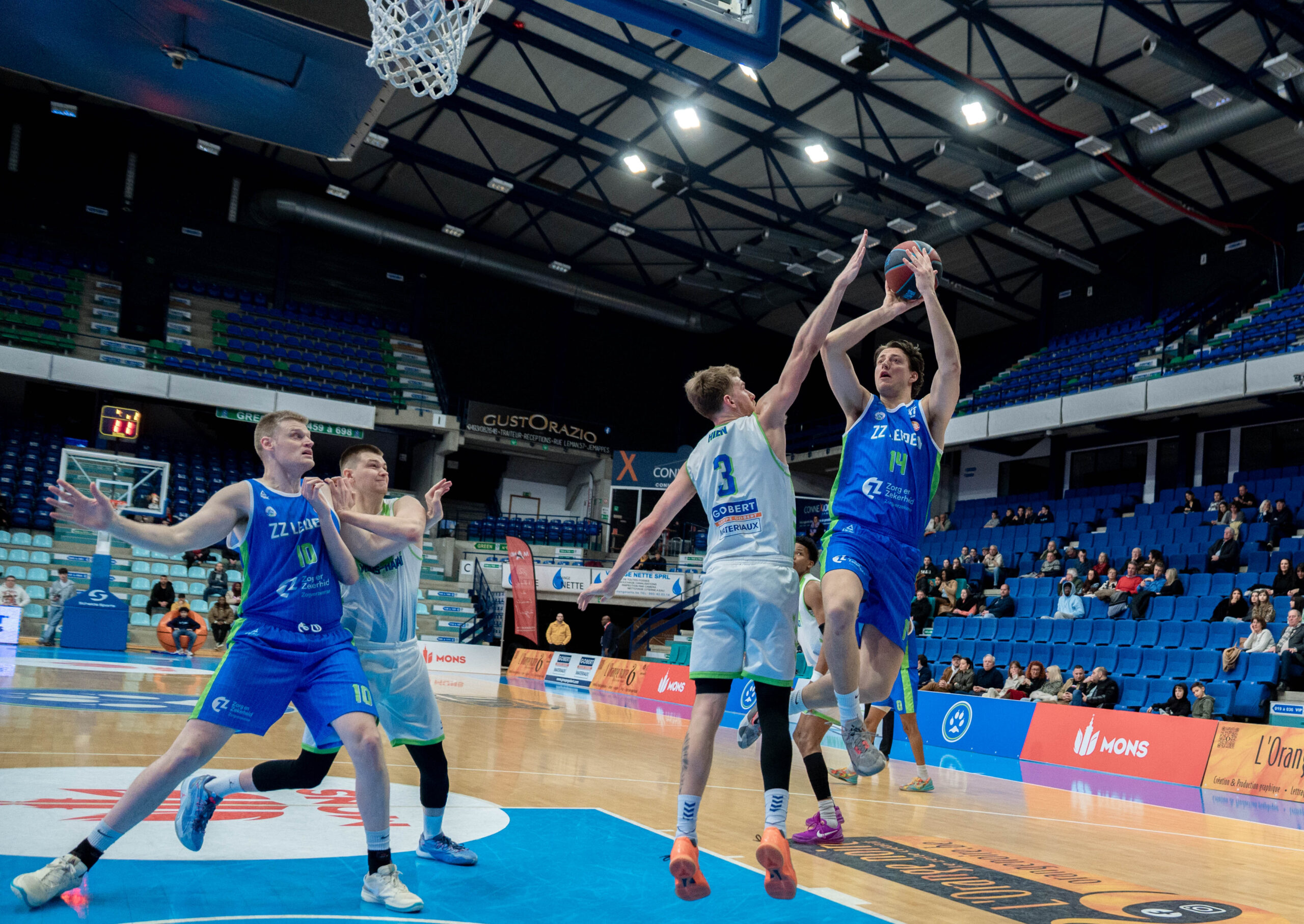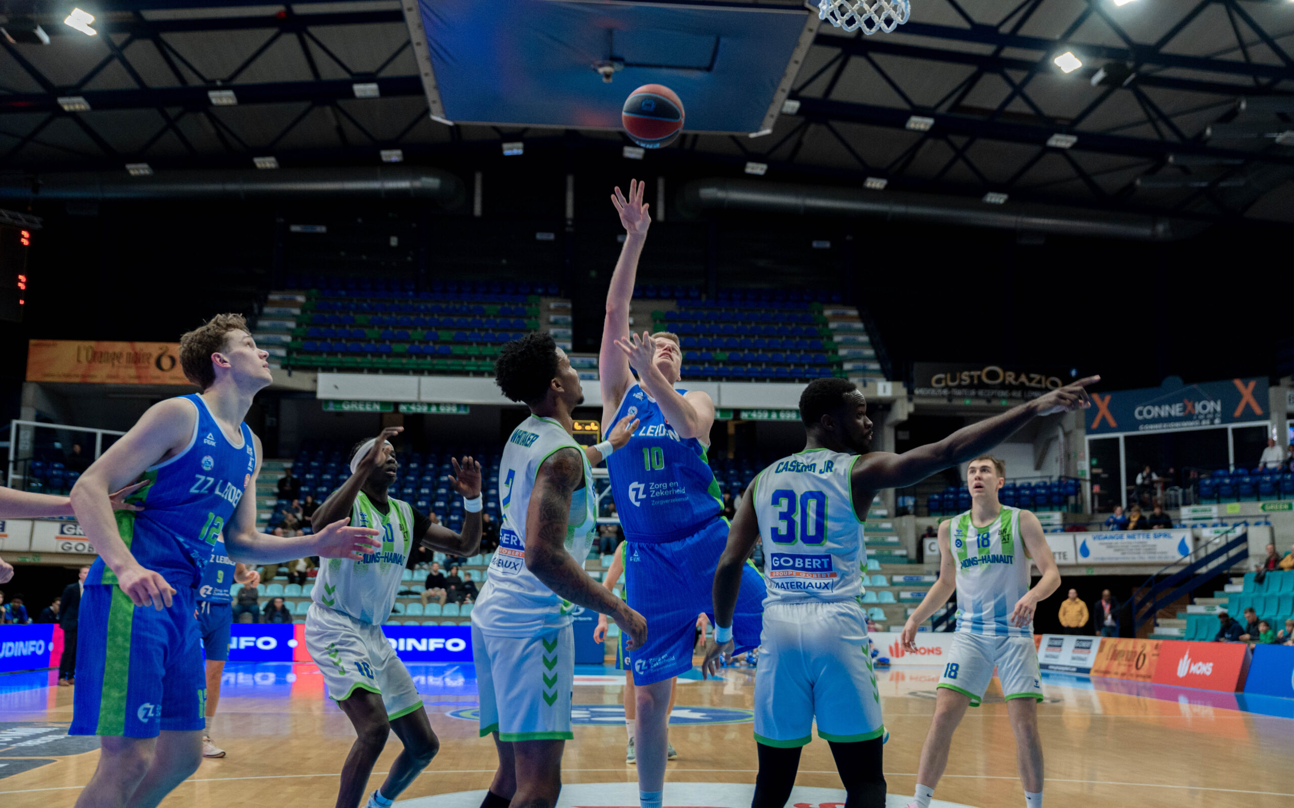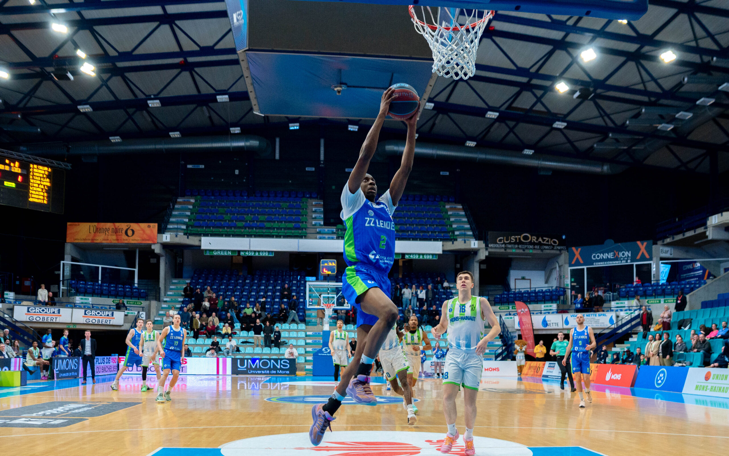 ZZ Leiden begon nog goed aan de wedstrijd. Via een dunk van Dimitri Maconda en een driepunter van Jibbe Sicking nam de Leidse ploeg binnen anderhalve minuut een 1-5 voorsprong. De Belgische laagvlieger trok zich daar niets van aan. Met name Garrett Hien ging in het eerste kwart voorop voor Union Mons-Hainaut. Vooral van afstand deed de Amerikaan goede zaken.