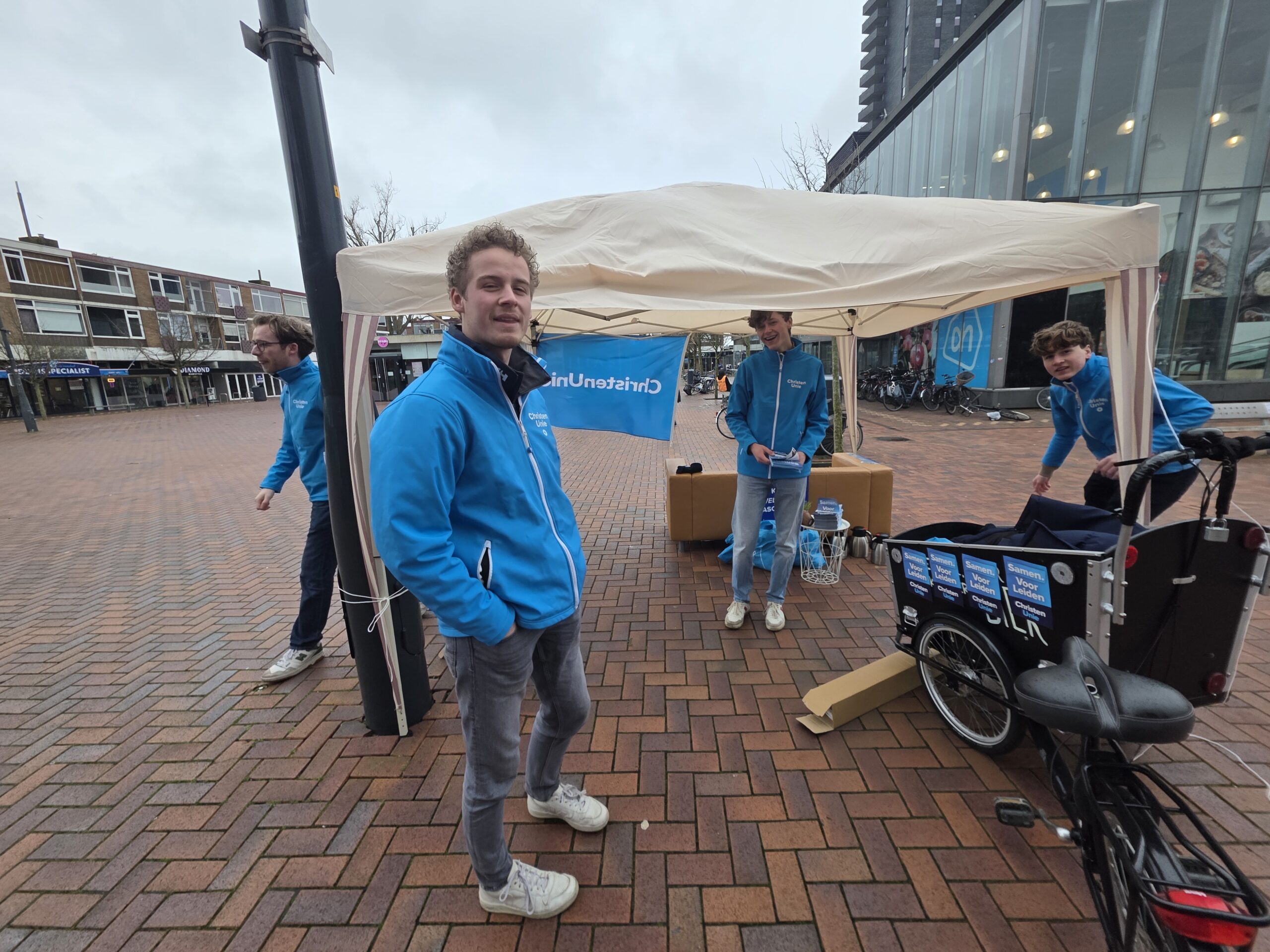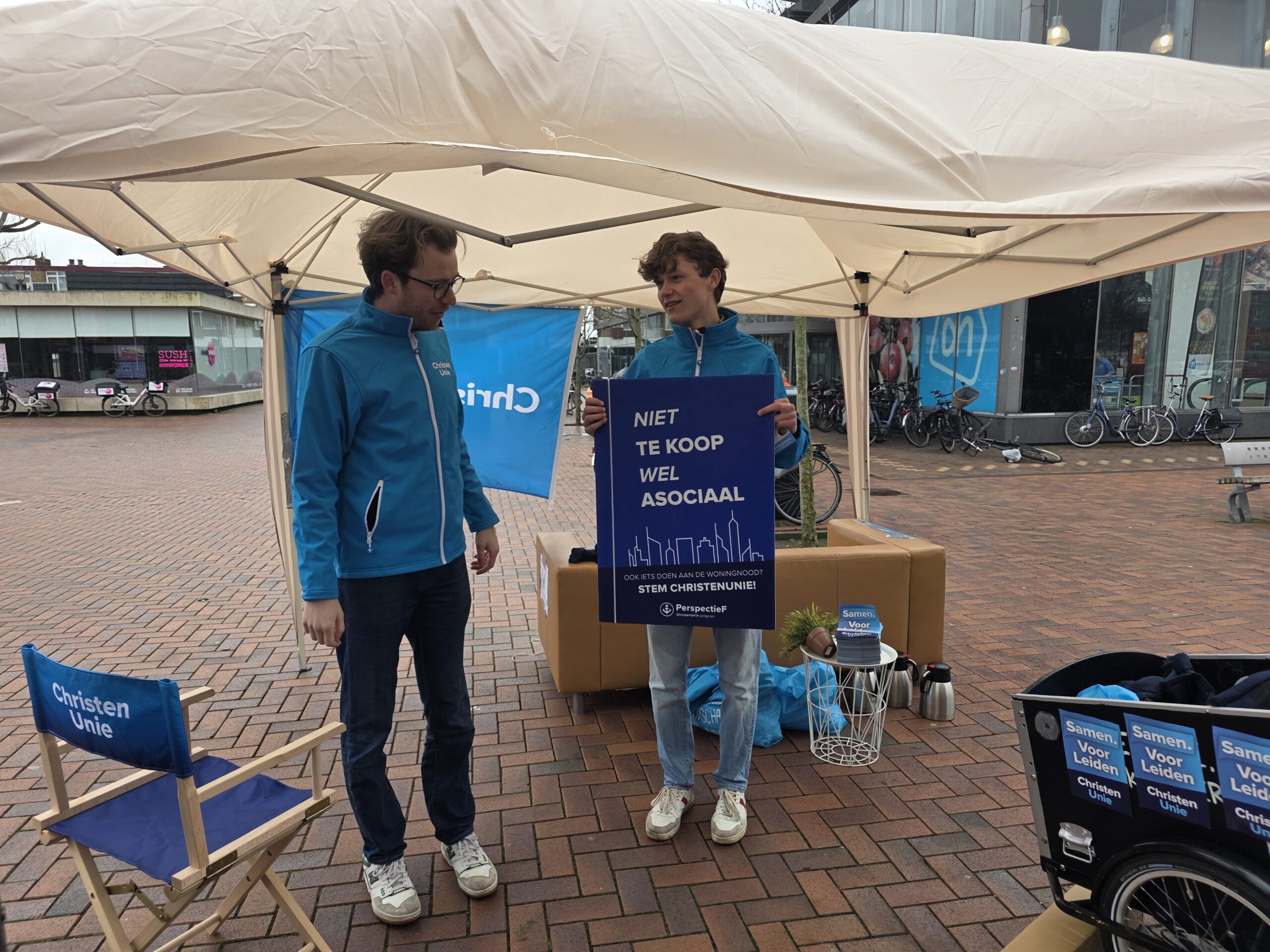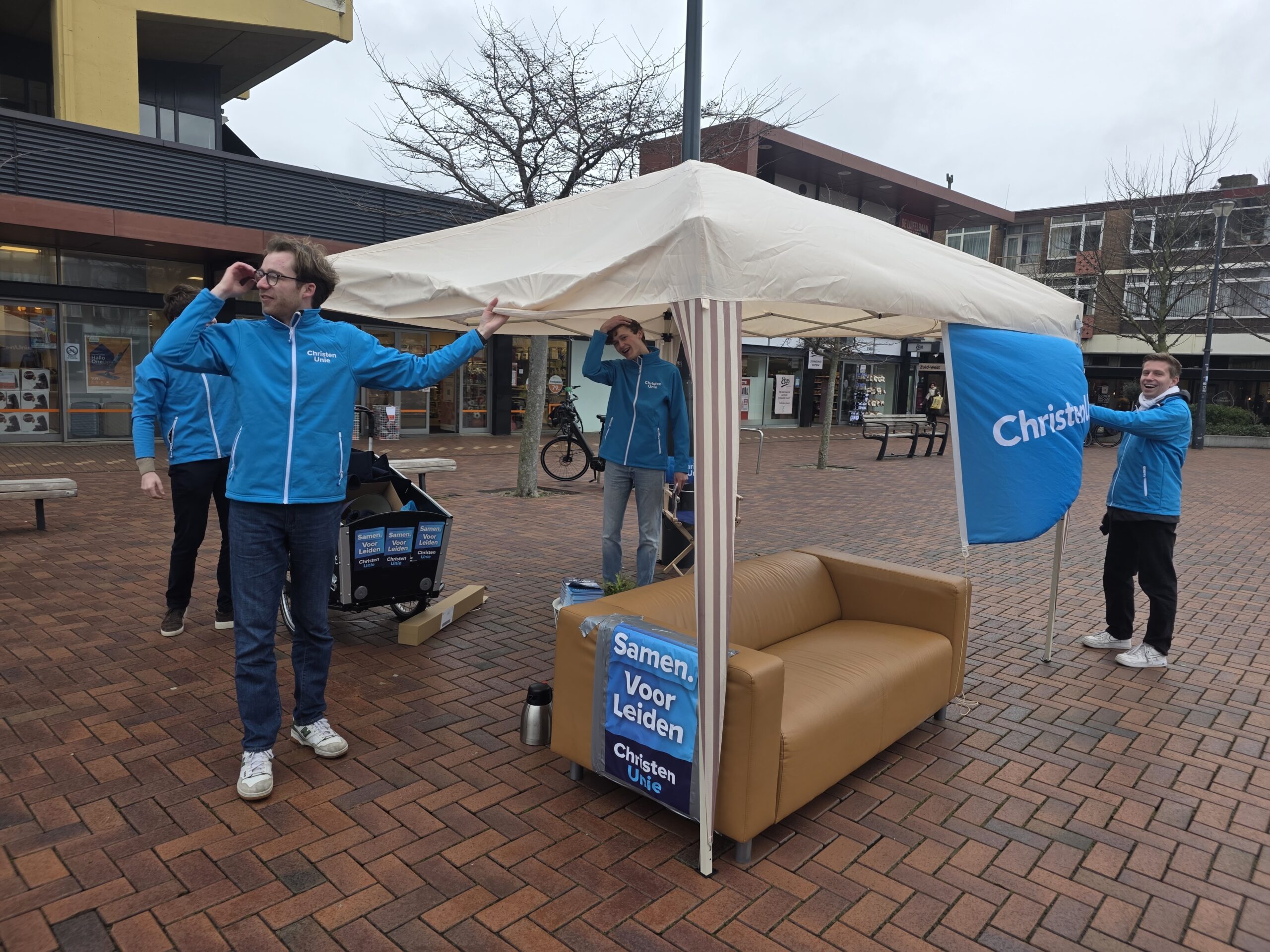 Met een geleend bankstel van de kringloop, een partytentje en potten vol koffie van de Herensingelkerk weerstonden een aantal kandidaten van de ChristenUnie Leiden zaterdag op het Bevrijdingsplein de weergoden.