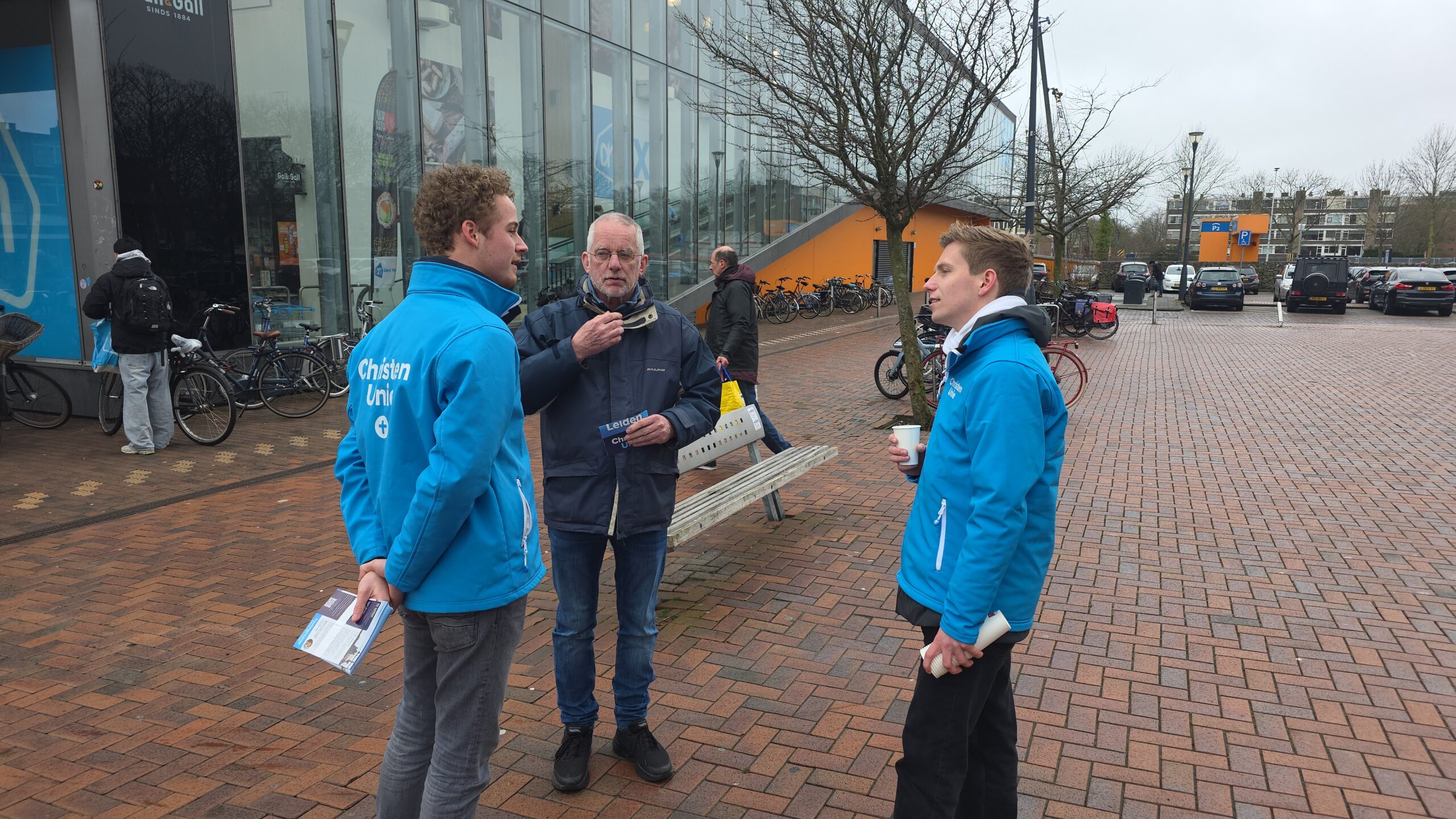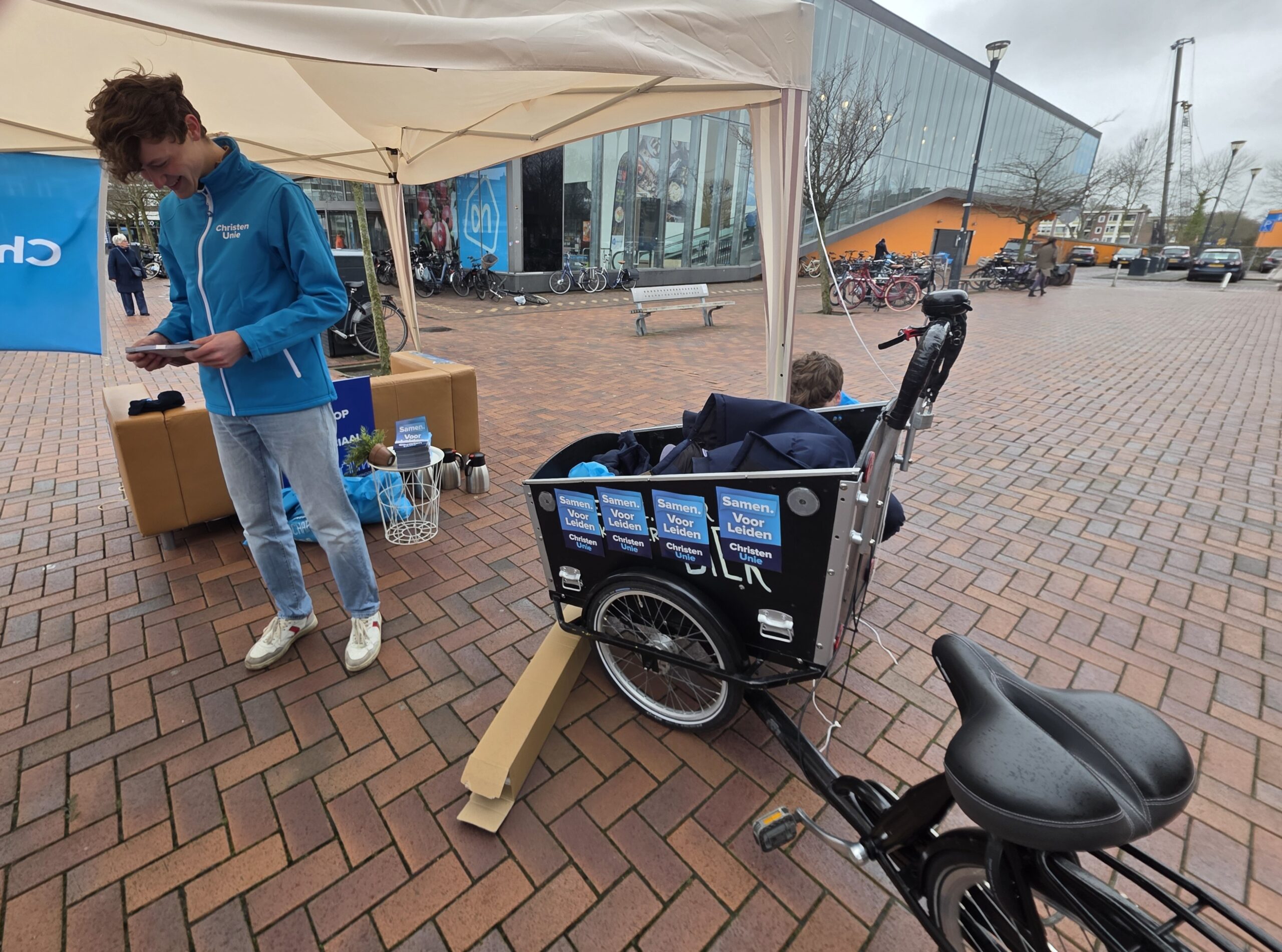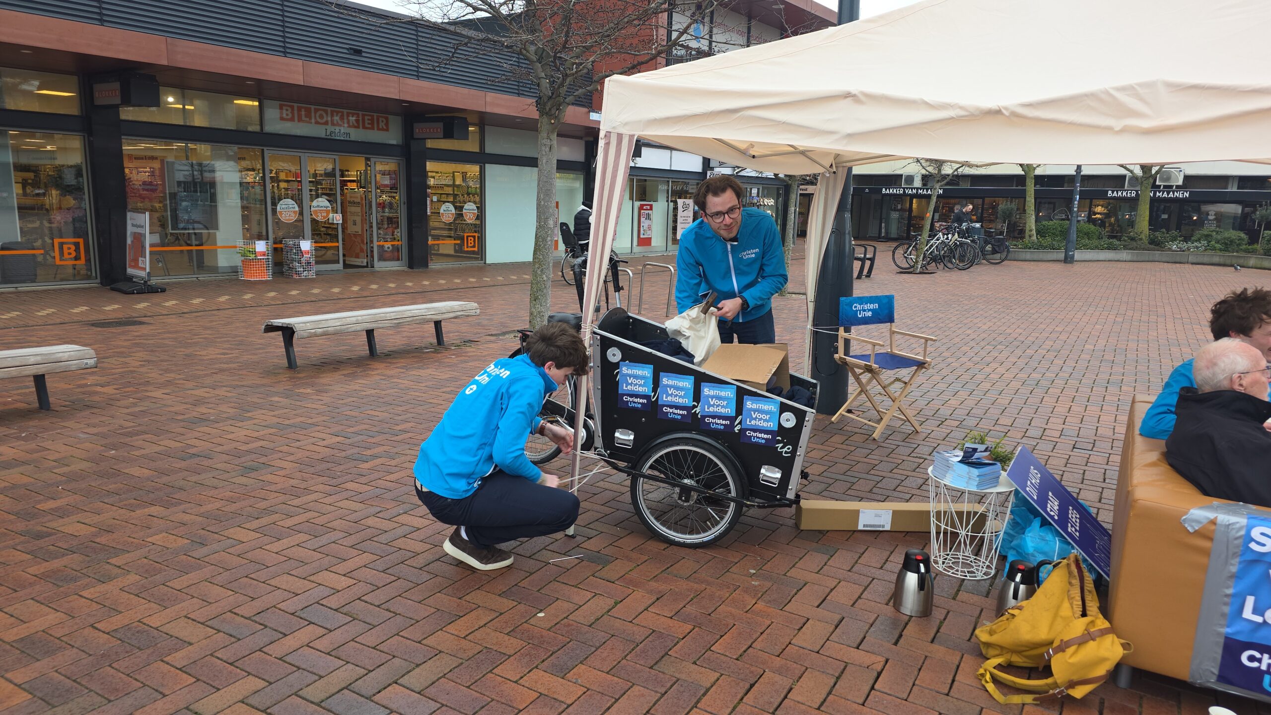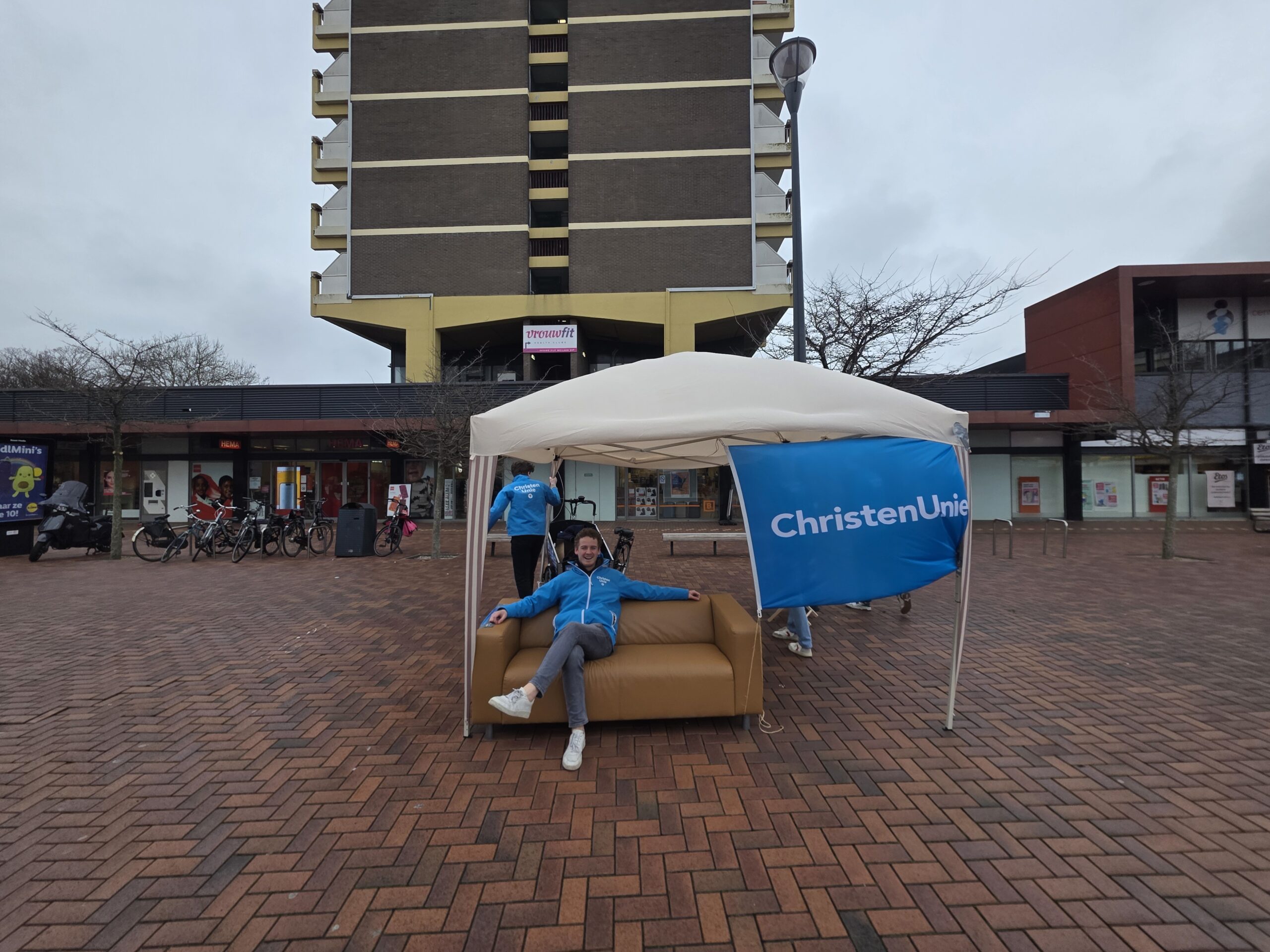 Met een geleend bankstel van de kringloop, een partytentje en potten vol koffie van de Herensingelkerk weerstonden een aantal kandidaten van de ChristenUnie Leiden zaterdag op het Bevrijdingsplein de weergoden.