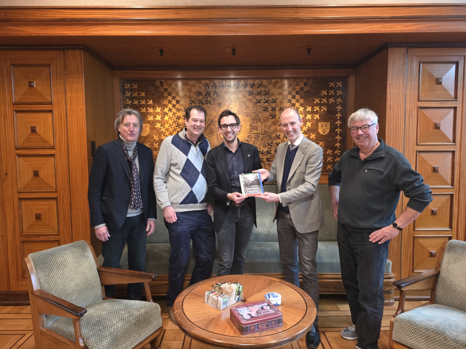 De burgemeester ontving een exemplaar van het boek over de Garenmarkt uit handen van de samenstellers, Davied van Berlo, Jeroen Antonides en Jilles van den Beukel. Namens de stad Leiden overhandigde de groep een Leidse stropdas – een cadeau van wethouder Ashley North – die de Franse burgemeester later ook om deed.