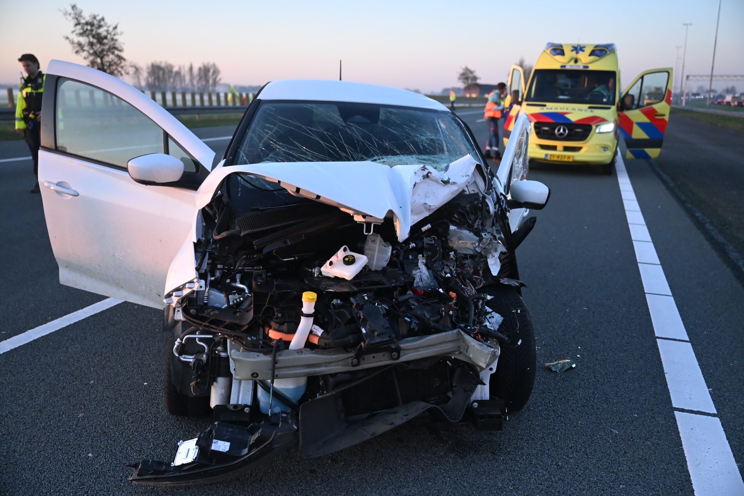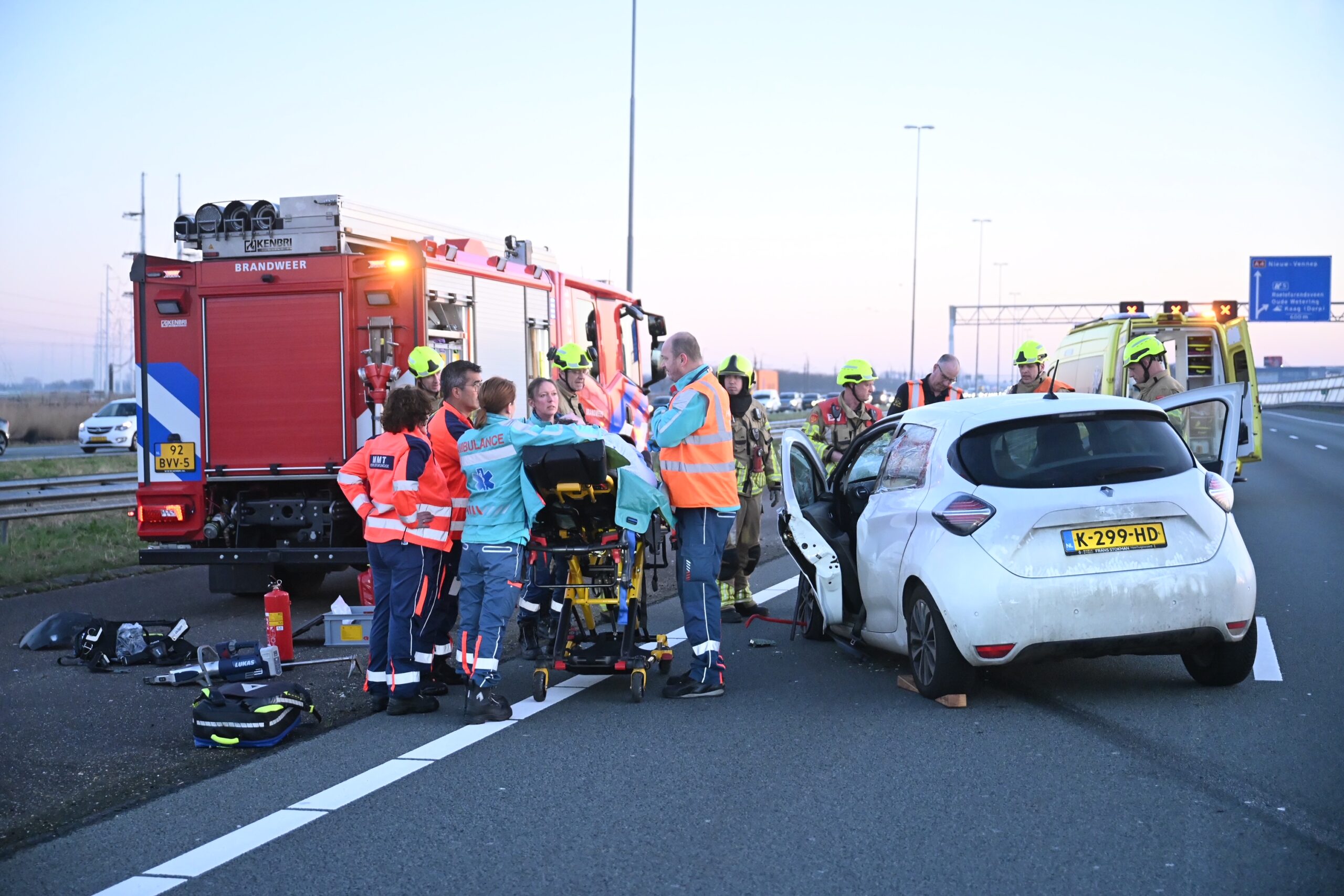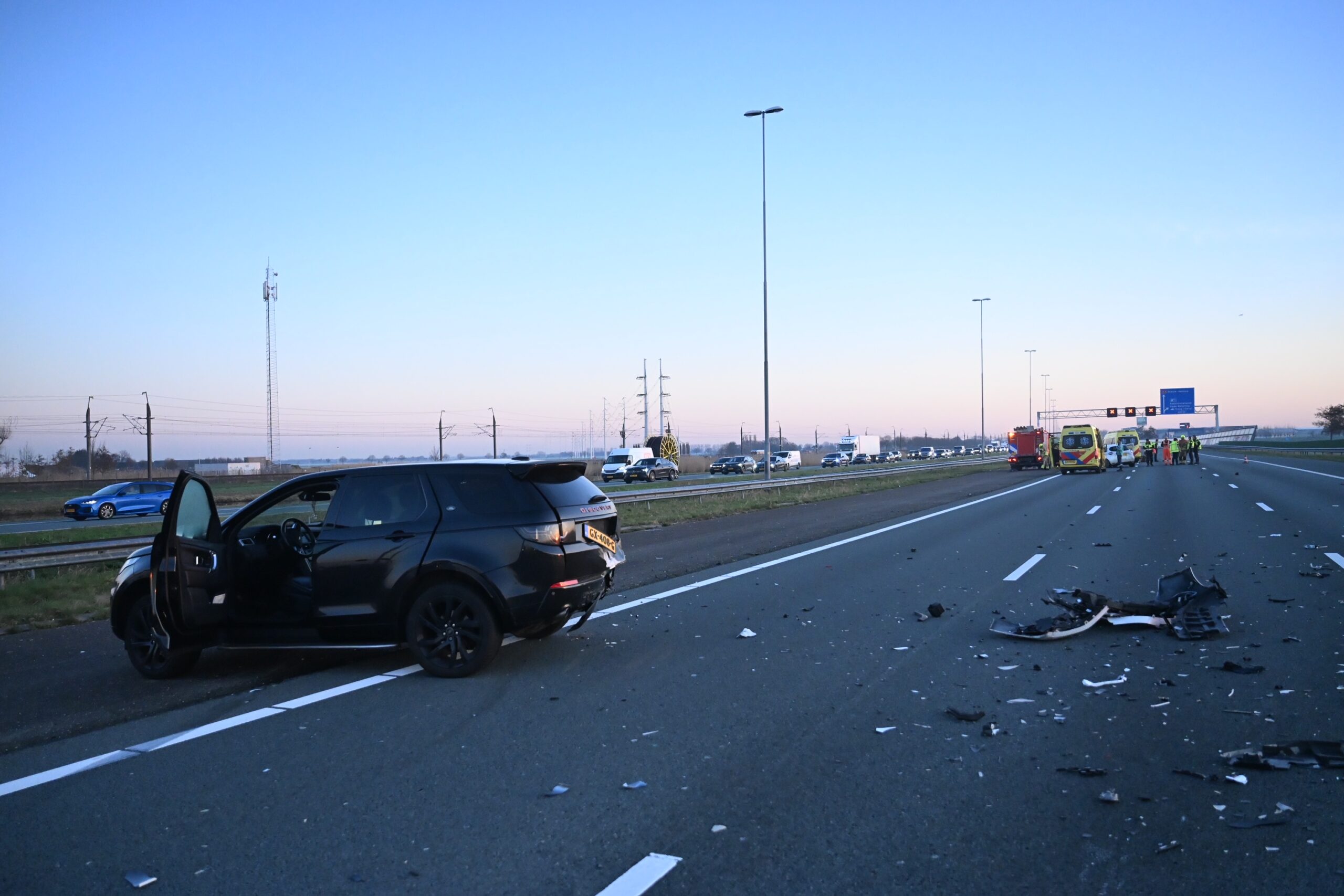 Bij een botsing op de Rijksweg A4 bij Roelofarendsveen is een van de betrokkenen gewond overgebracht naar het ziekenhuis. Hoe deze persoon eraan toe is, is onbekend. De snelweg is afgesloten en het verkeer wordt omgeleid.