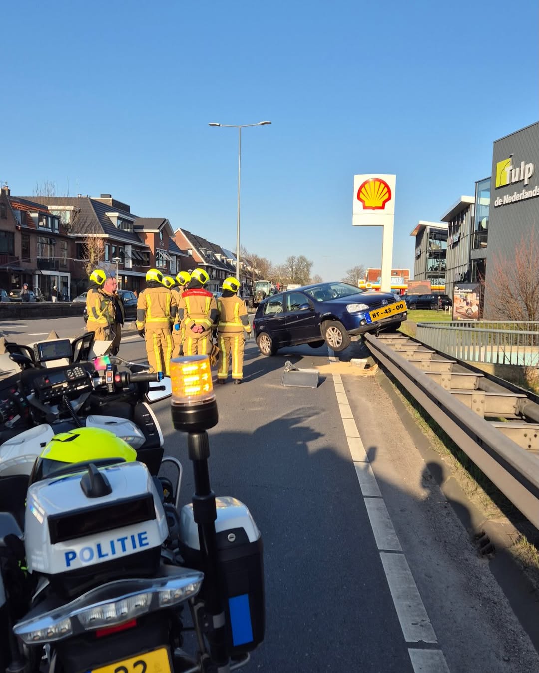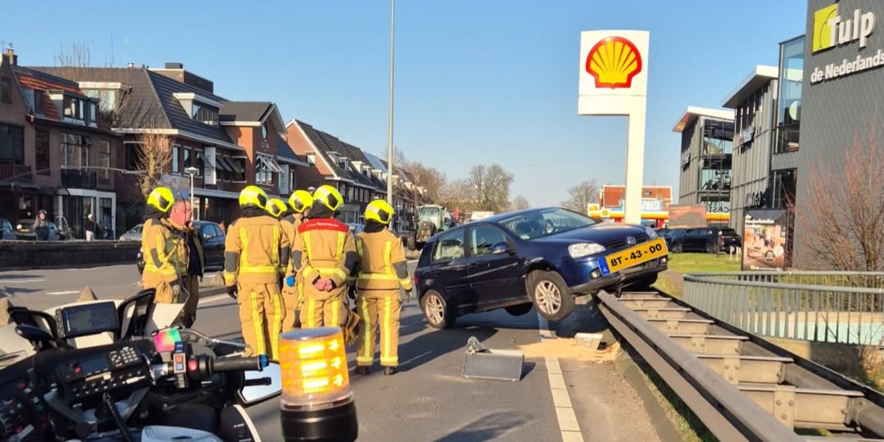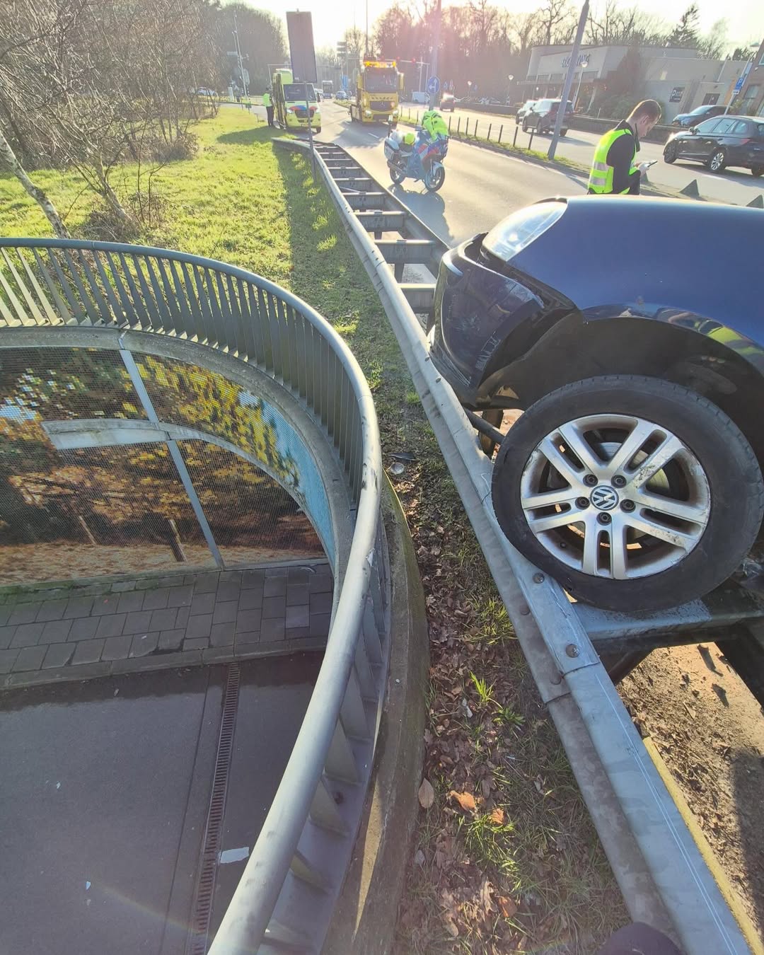 De bestuurder raakte bij dit eenzijdig ongeval eerst de middenberm en schoot daarna door naar de rijbaan voor het tegemoetkomend verkeer. De ongebruikelijke rit eindigde uiteindelijk bovenop de vangrail. Ondanks de klap en de gevaarlijke positie van het voertuig, raakte er niemand gewond.