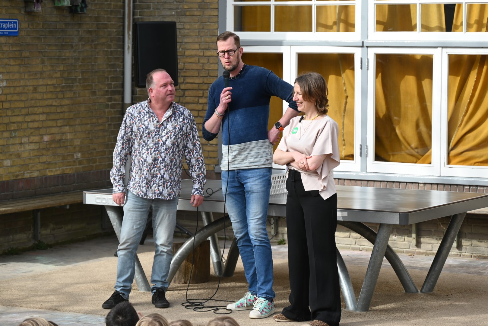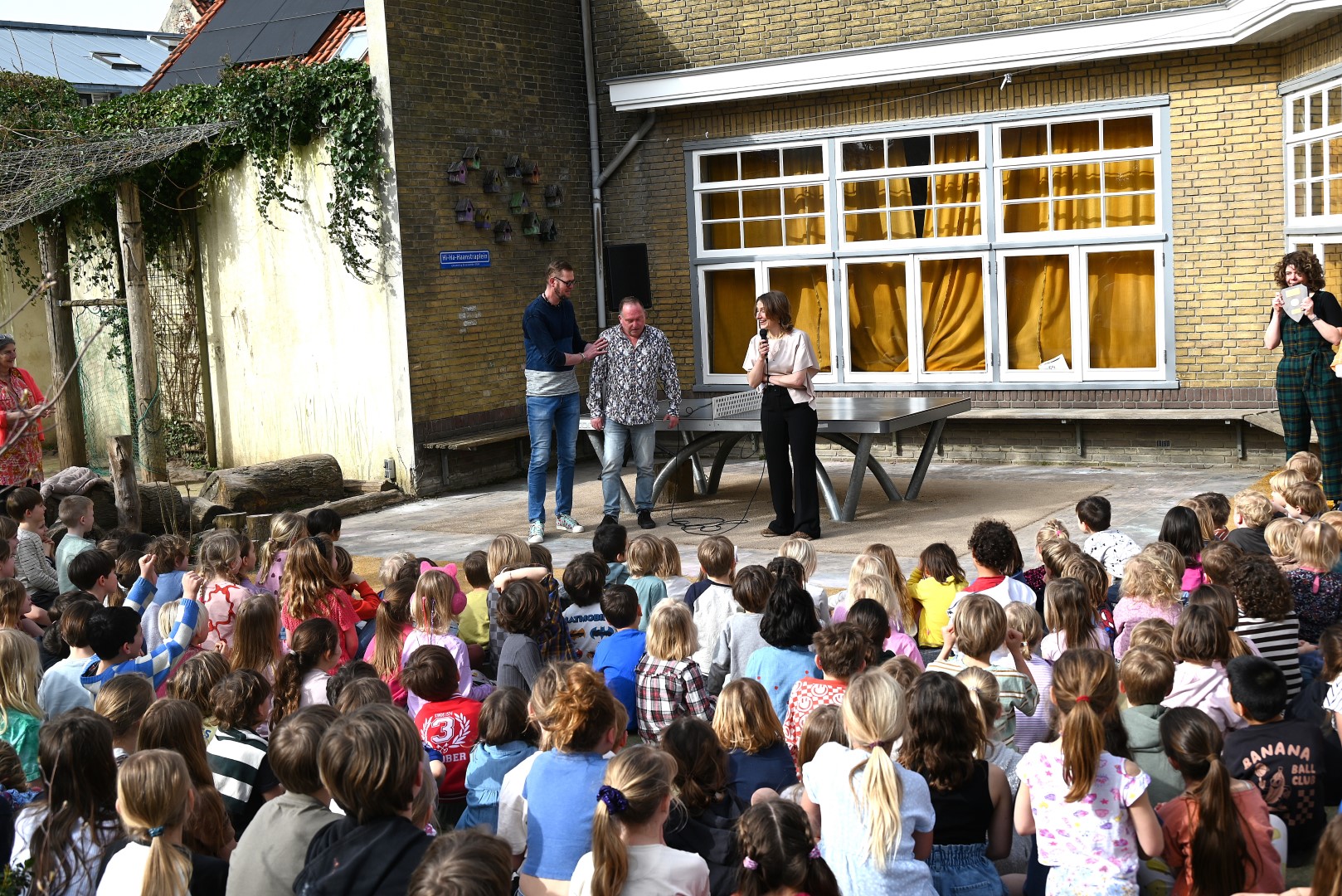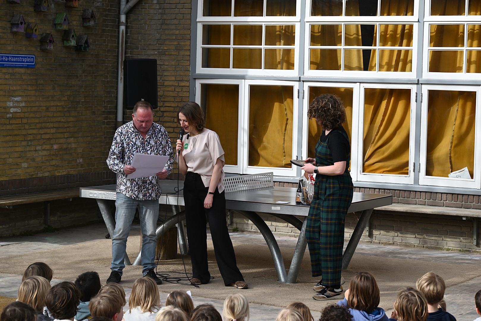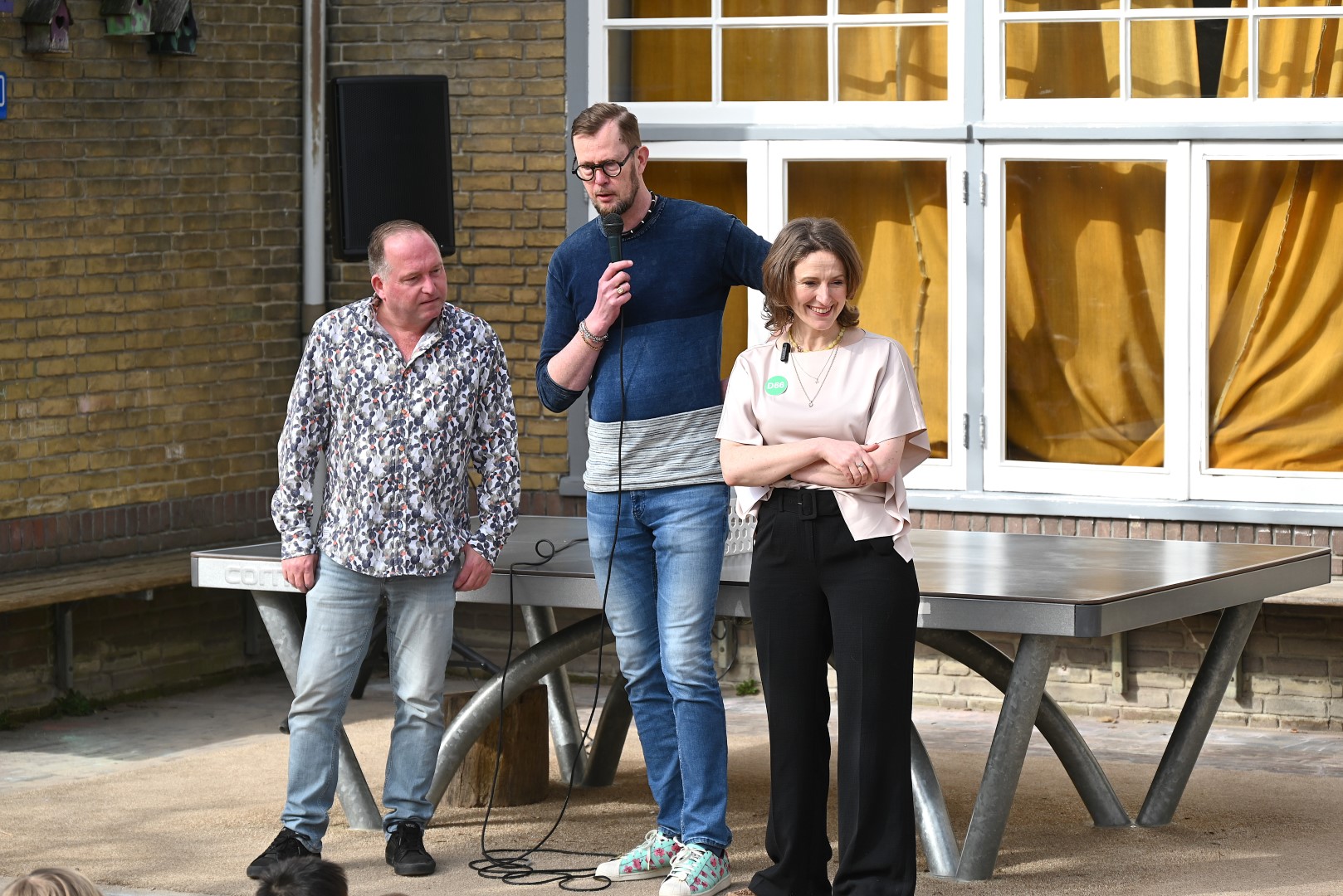 Dat er iets stond te gebeuren wist Moerkens ook wel. Maar hem was verteld dat de school een prijs kreeg voor het groenste schoolplein. Maar niets bleek minder waar, toen hij naar voren geroepen werd om een microfoon te repareren. Met die microfoon bleek niets mis, toen D66-lijsttrekker Wietske Veltman zich tot Moerkens richtte.