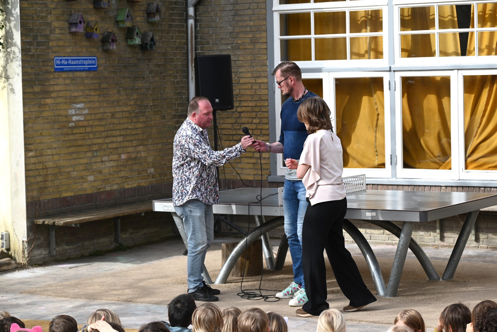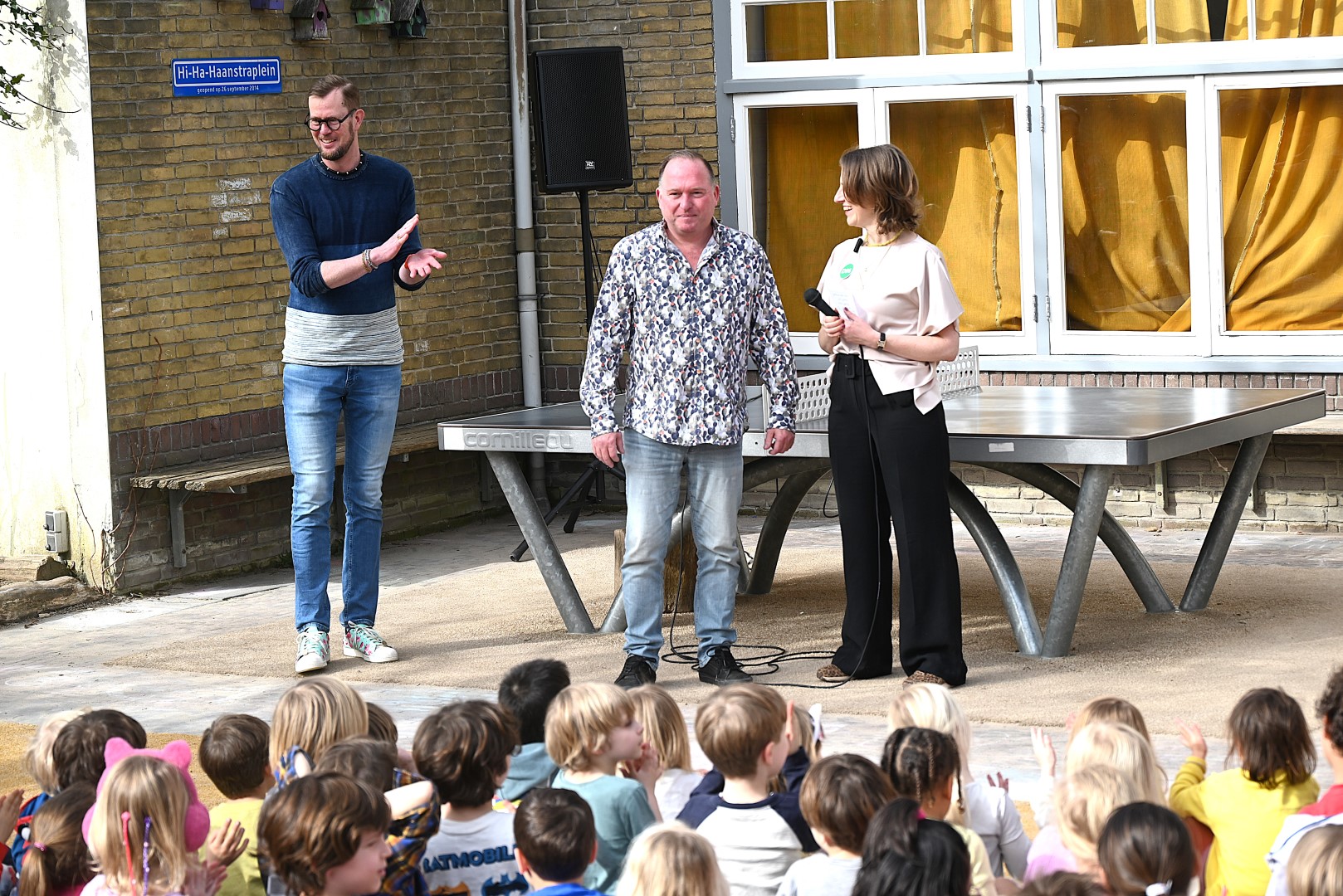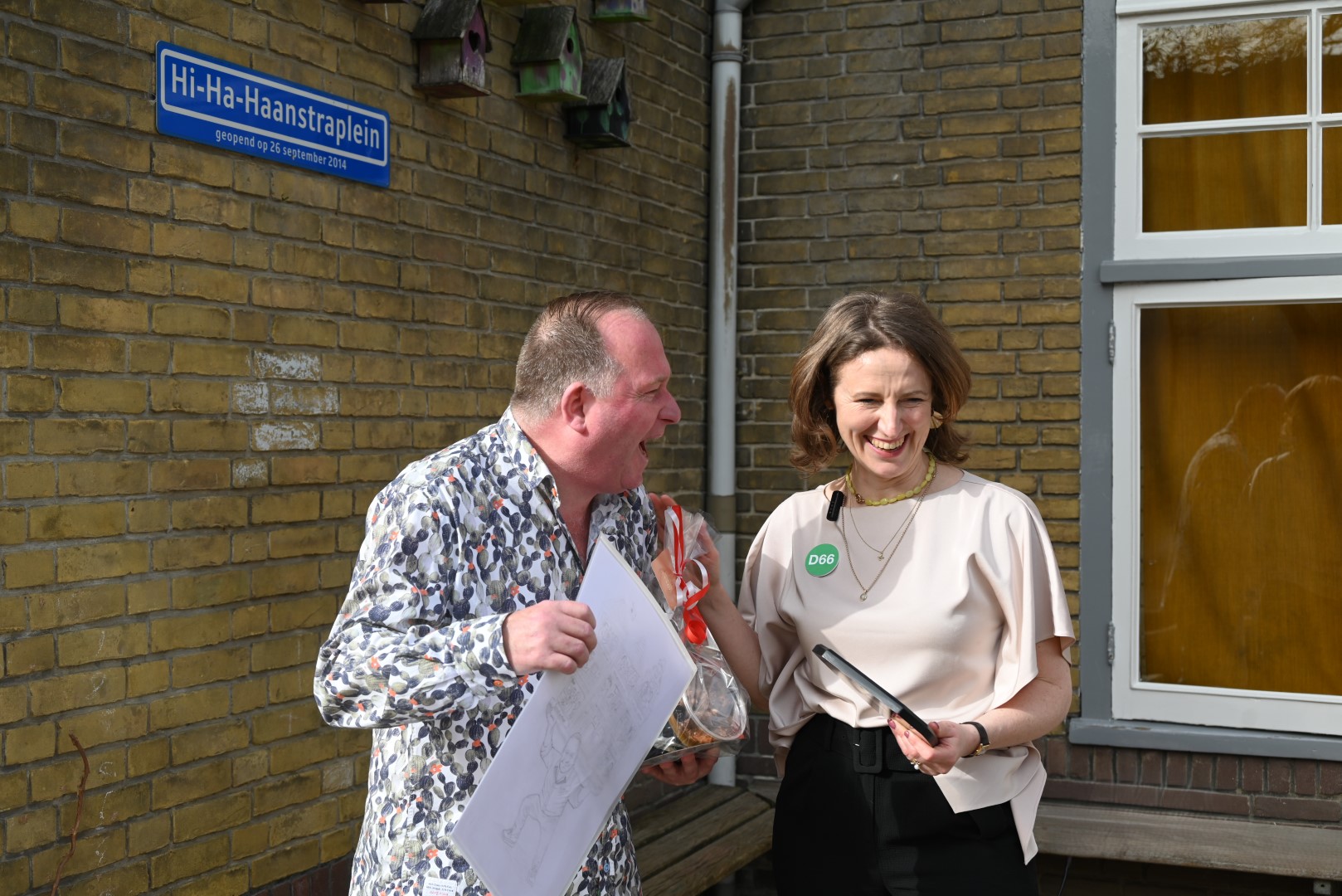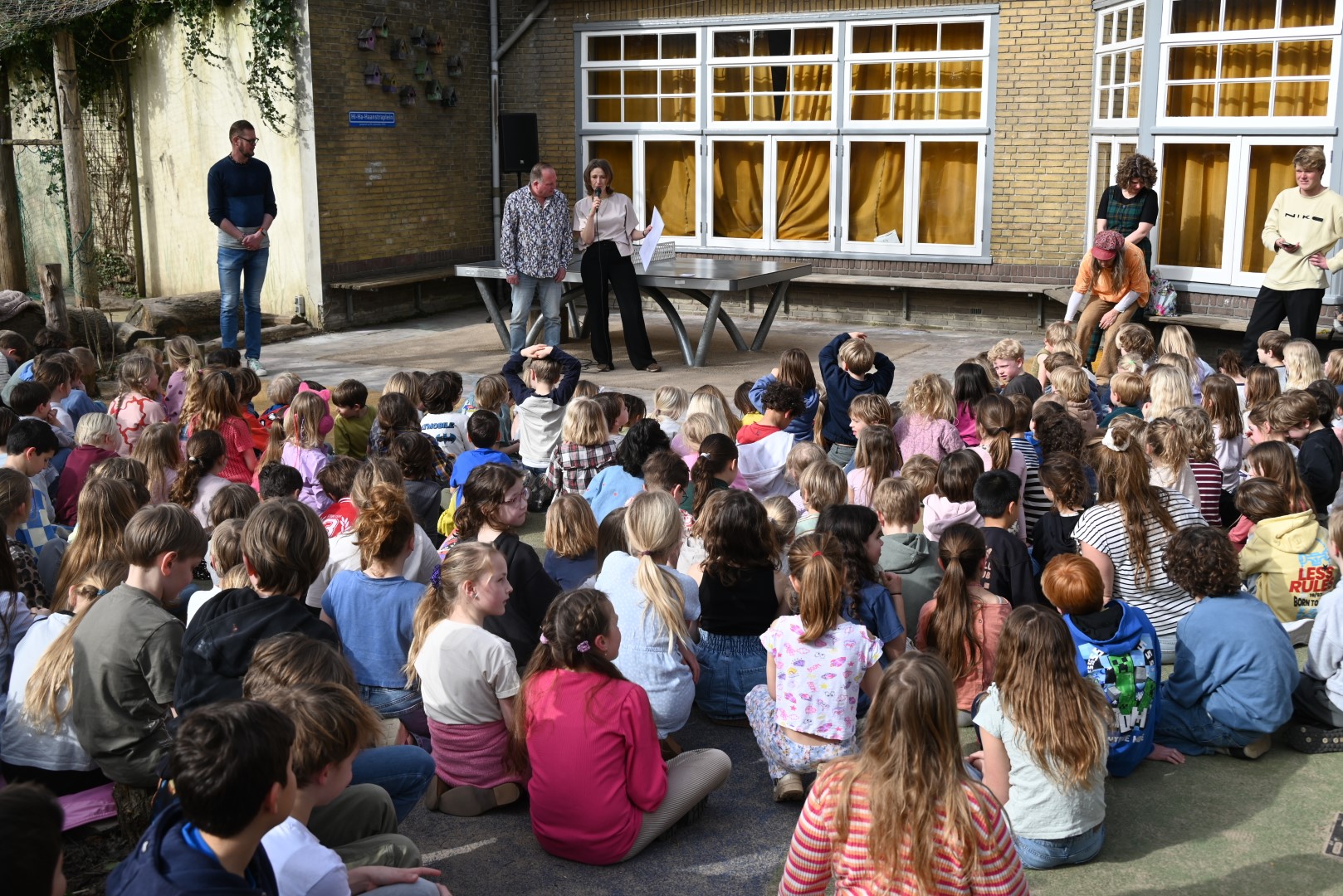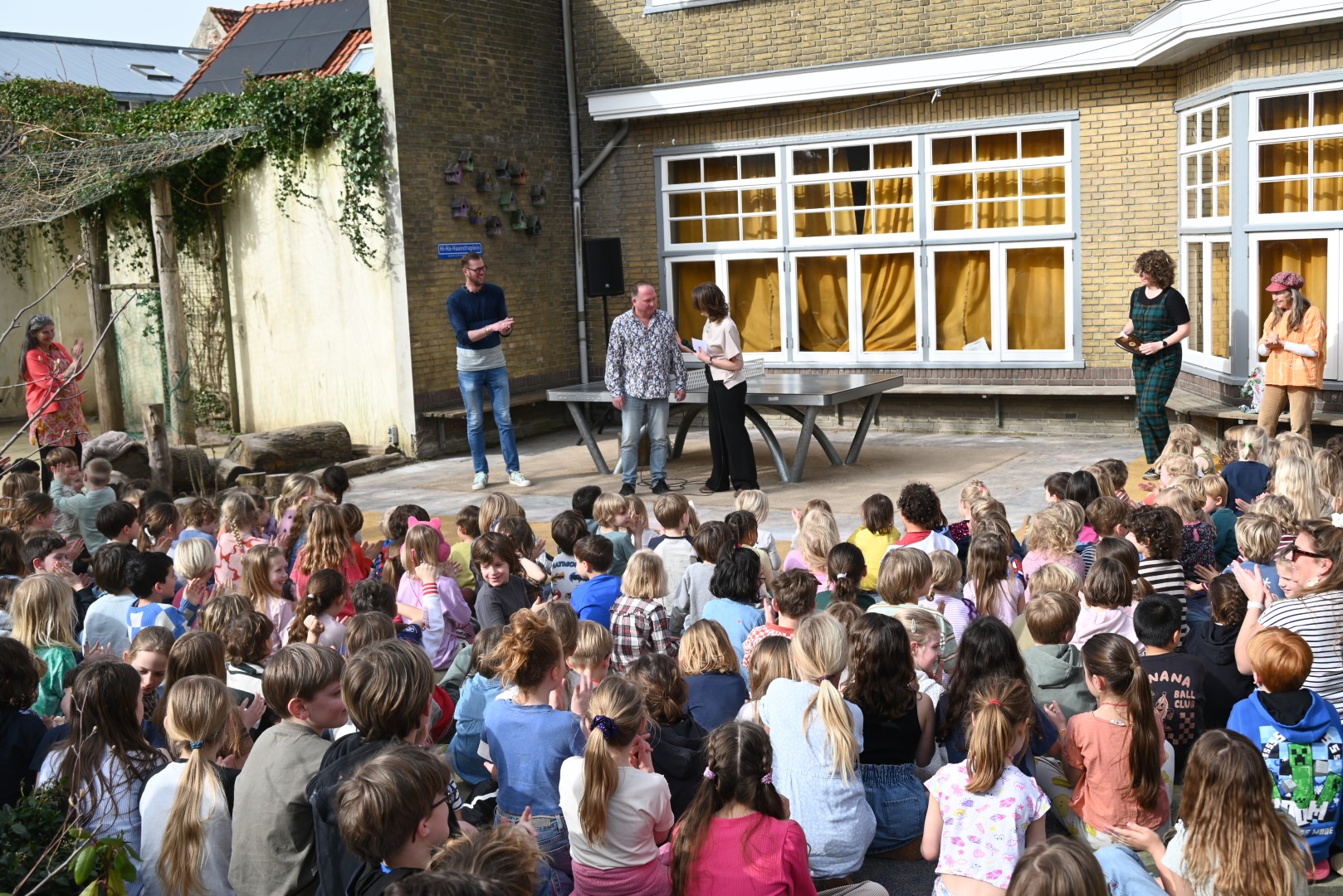Dat er iets stond te gebeuren wist Moerkens ook wel. Maar hem was verteld dat de school een prijs kreeg voor het groenste schoolplein. Maar niets bleek minder waar, toen hij naar voren geroepen werd om een microfoon te repareren. Met die microfoon bleek niets mis, toen D66-lijsttrekker Wietske Veltman zich tot Moerkens richtte.