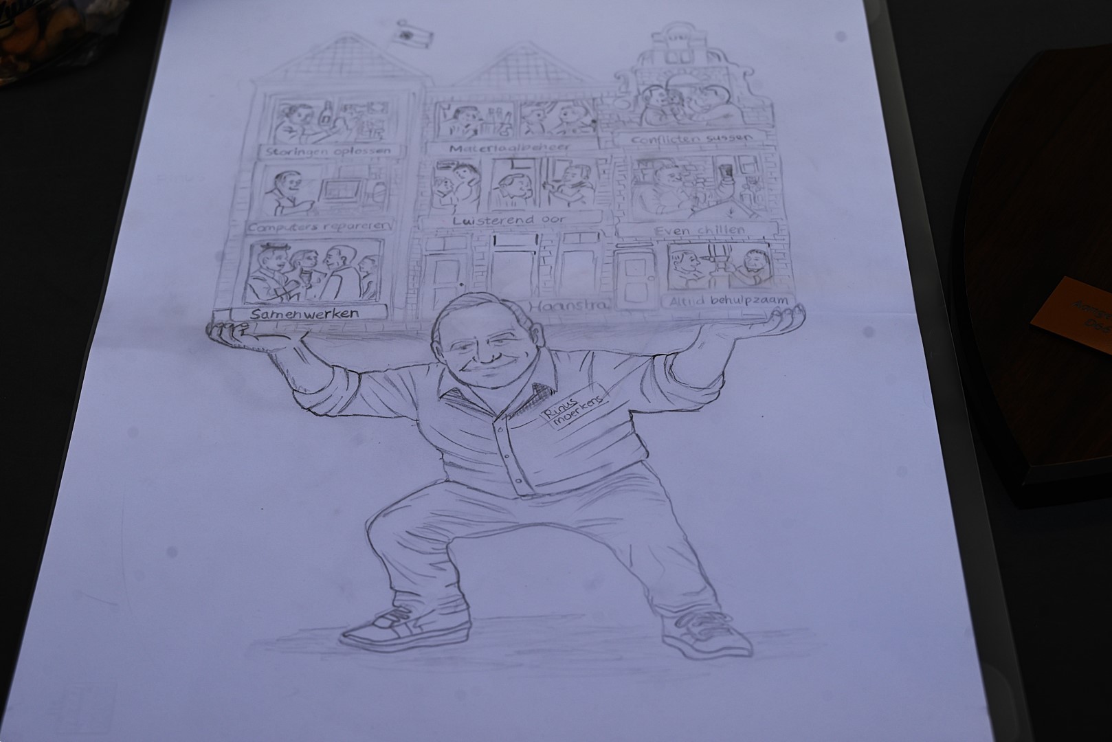 Dat de prijs terecht is, bleek wel toen de gehele basisschool in zingen uitbarstte. Iedere leerling had van tevoren in het geheim een liedje ingestudeerd over conciërge Rinus. Ook hadden leerlingen een dans ingestudeerd en was er een bijzondere tekening gemaakt. Op die tekening draagt Moerkens de hele school.