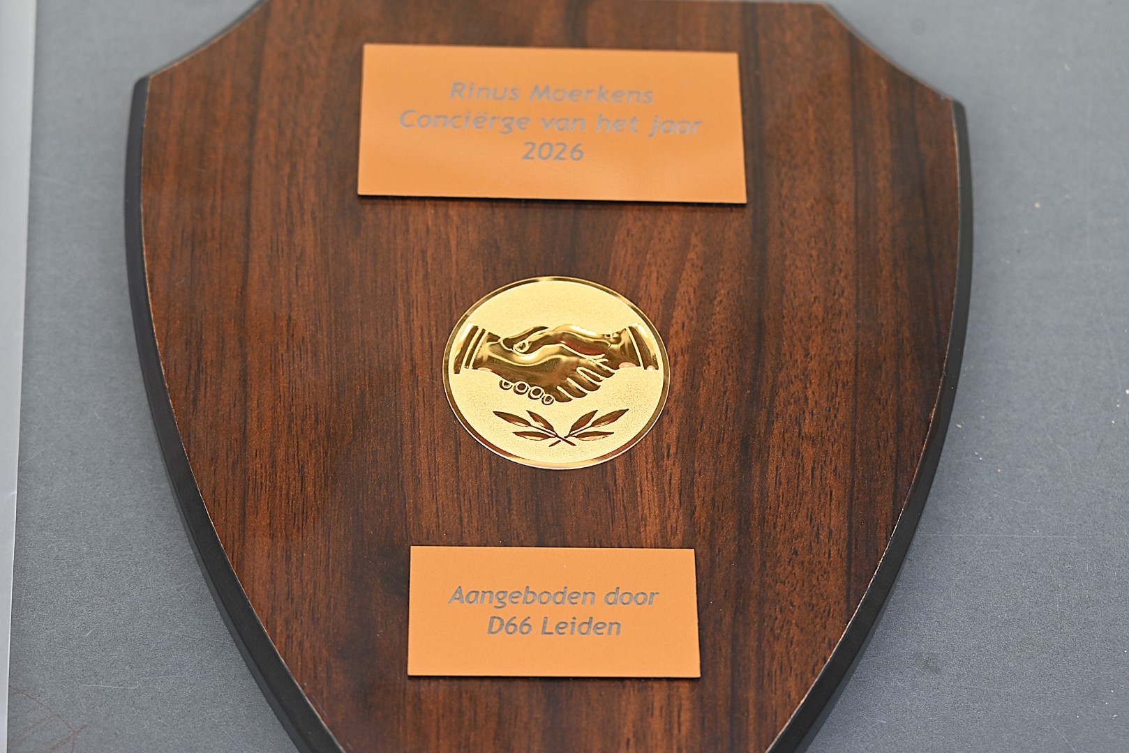 D66 Leiden reikt sinds 2006 jaarlijks de prijs voor de conciërge van het jaar uit. Dit jaar ging die dus naar Moerkens. “We vinden het belangrijk om mensen in het zonnetje te zetten die normaal een beetje op de achtergrond staan, maar enorm belangrijk werk doen”, zegt Veltman.