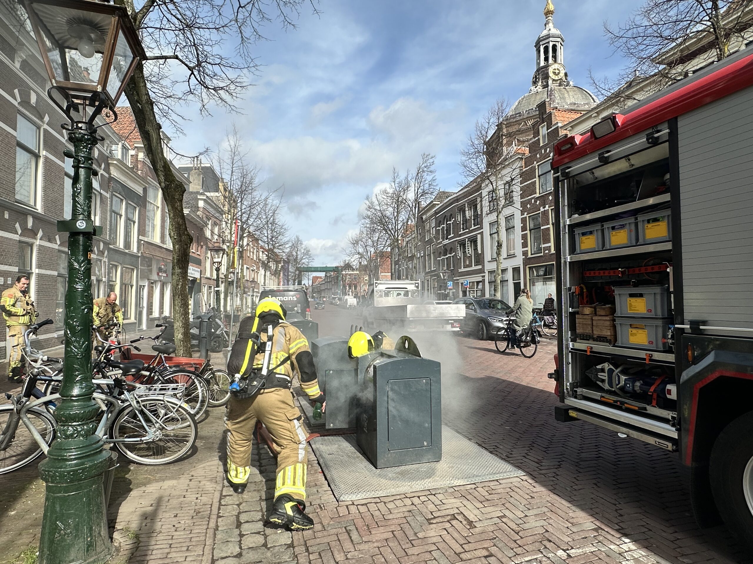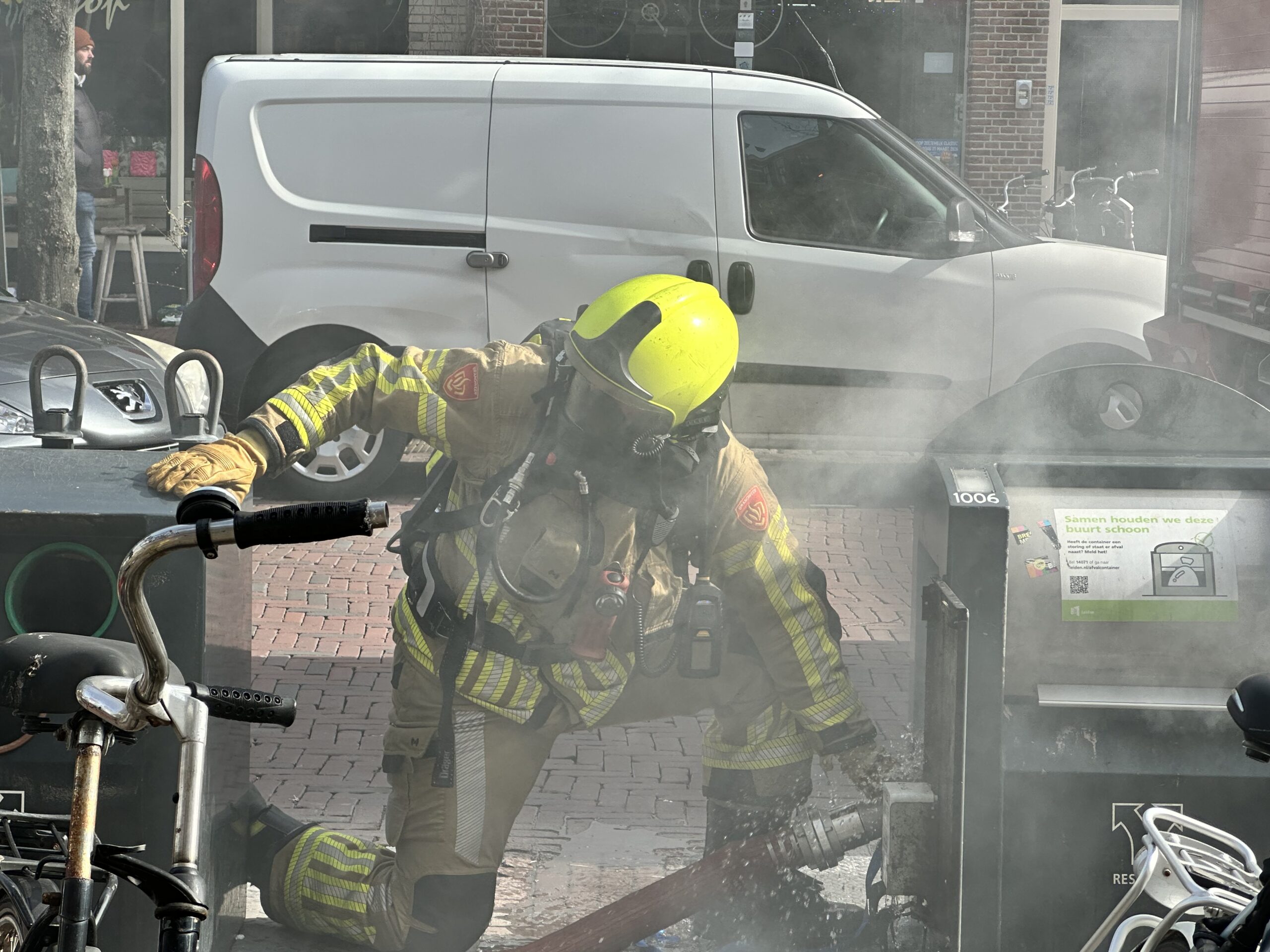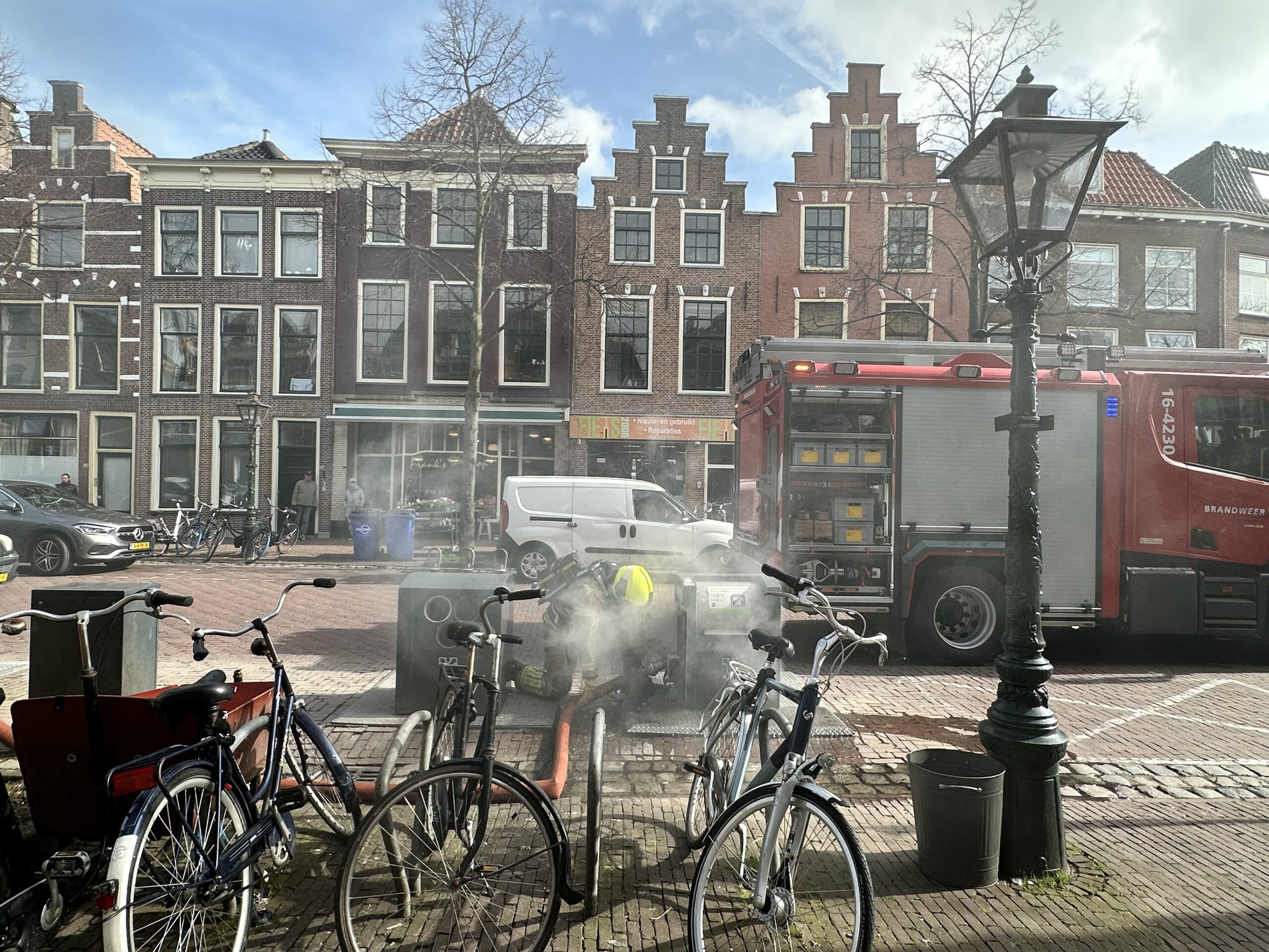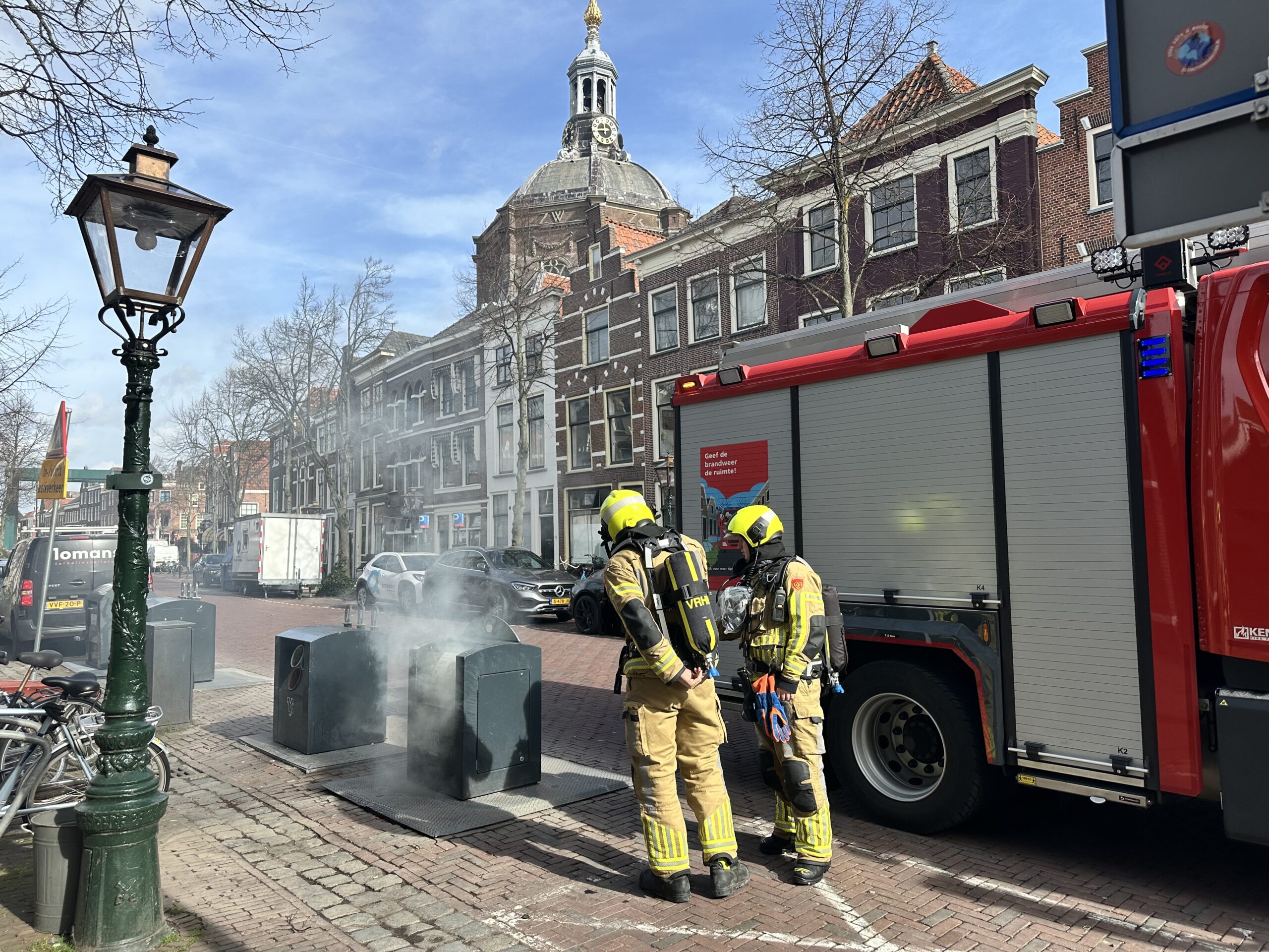 De brandweer heeft donderdagochtend rond 11.30 uur op de Lange Mare in Leiden een ondergrondse afvalcontainer geblust.