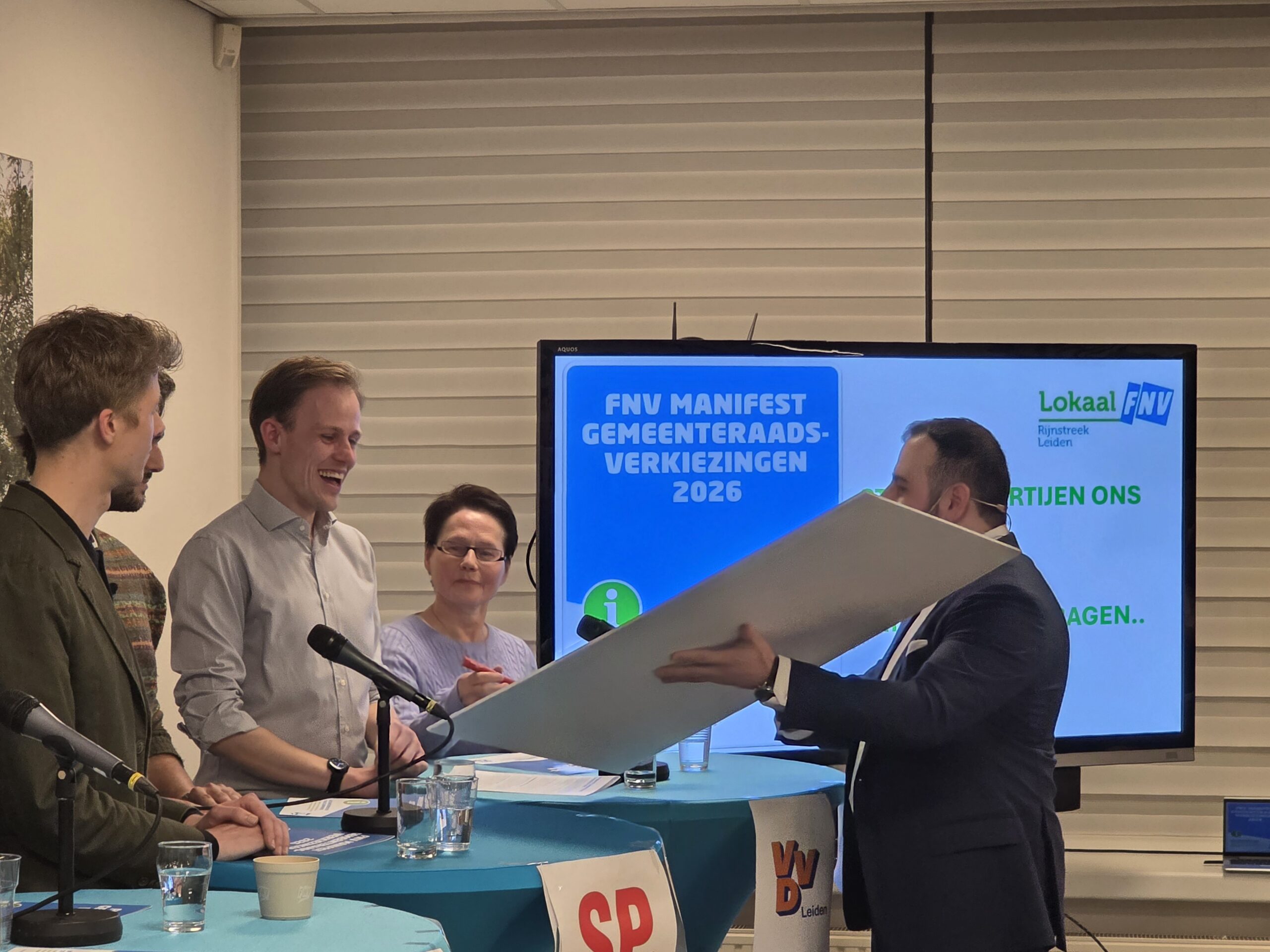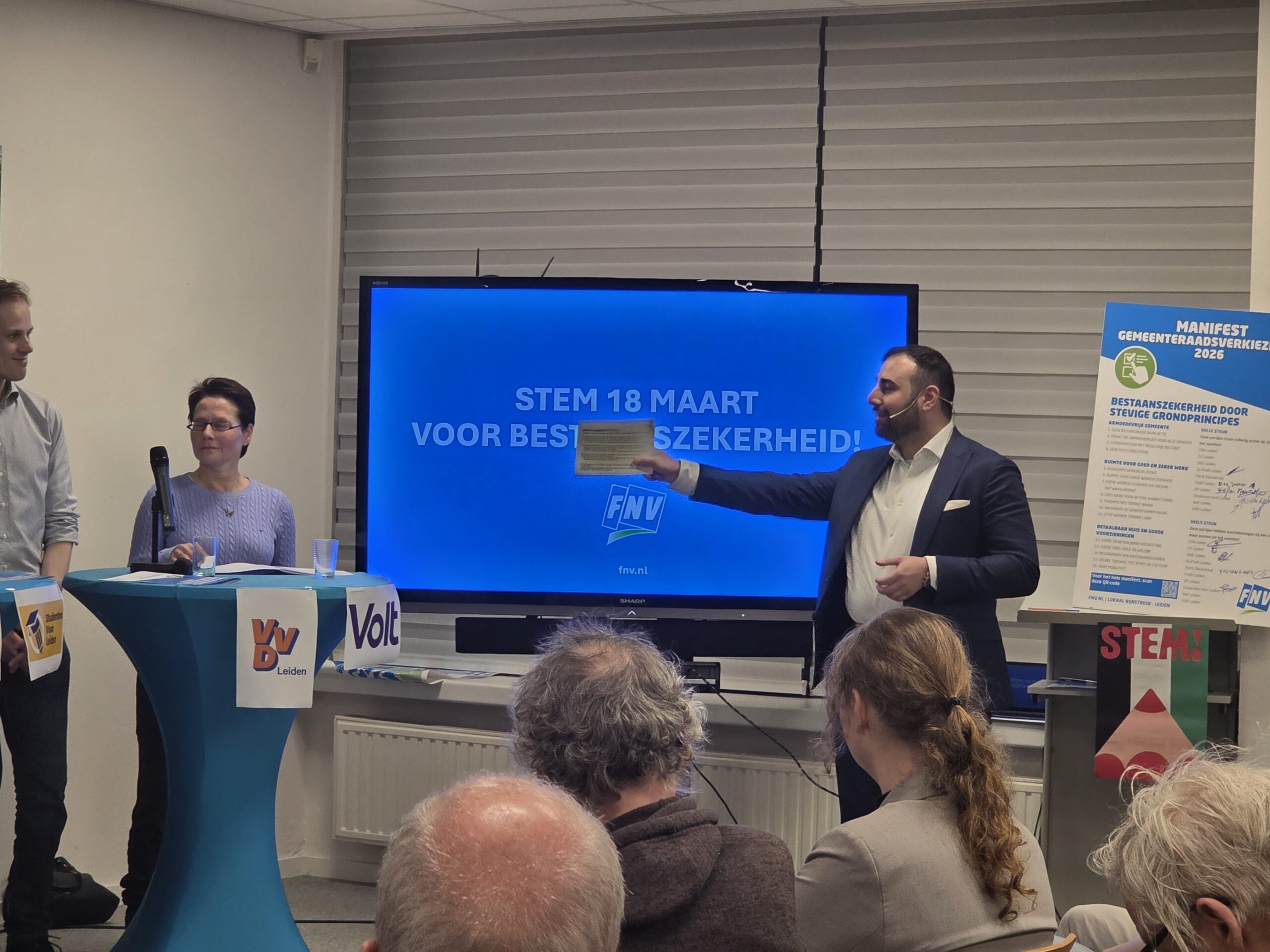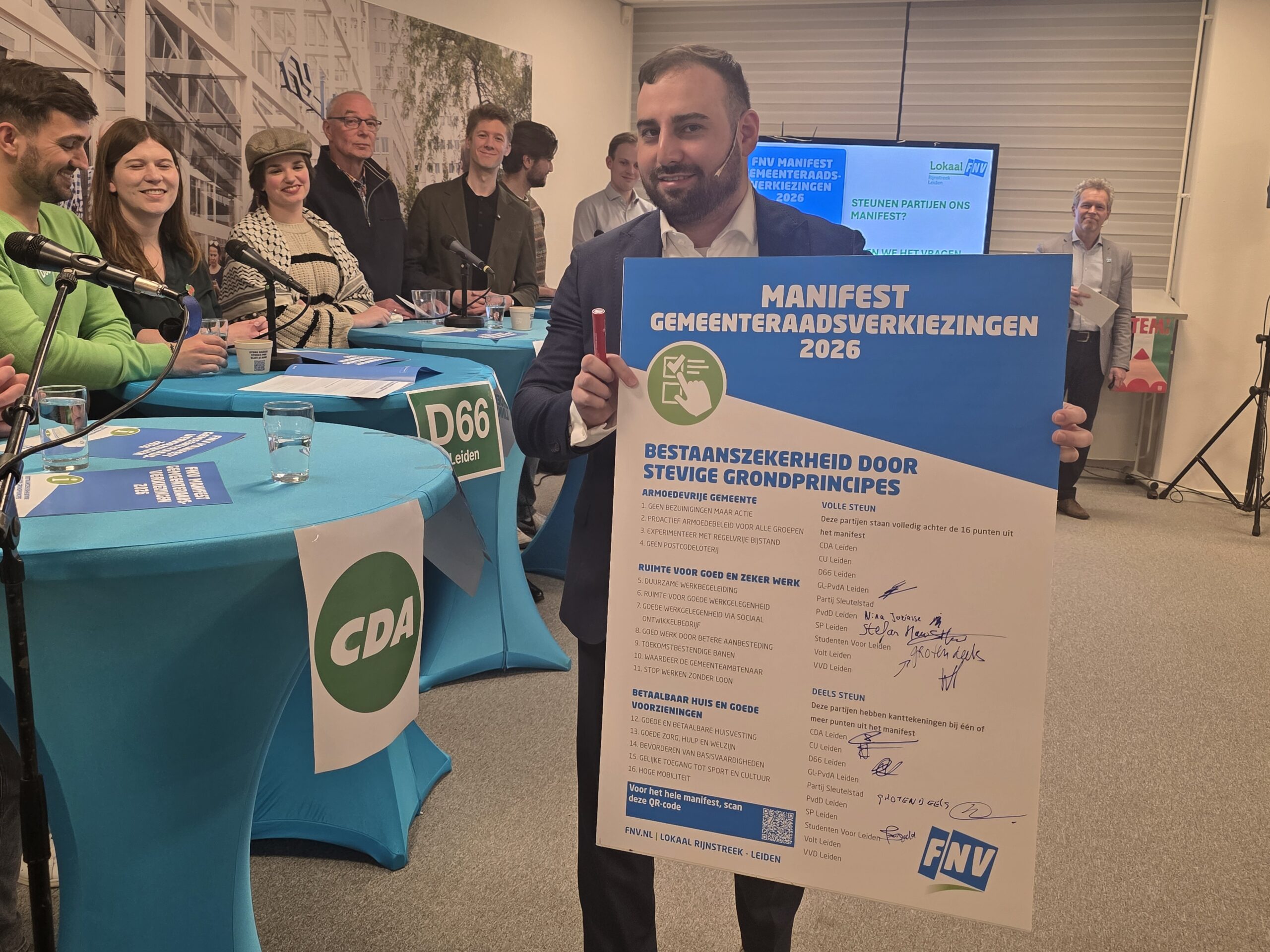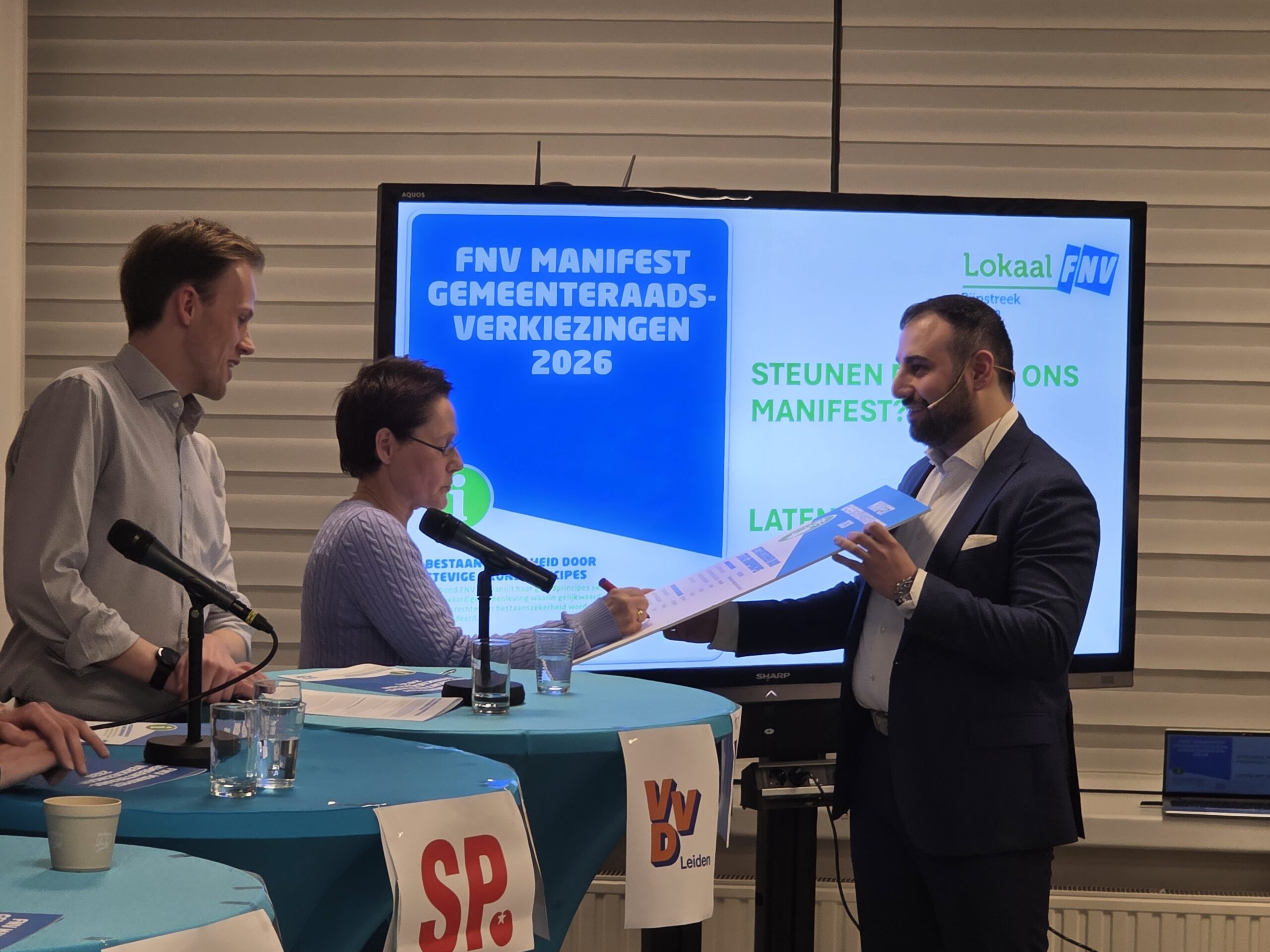 Na een introductie per partij, werd aan alle politici het zestienpuntenplan voorgelegd dat de FNV speciaal voor de gemeenteraadsverkiezingen heeft opgesteld. Veel partijen onderschrijven tenminste een deel van die punten en zetten er een handtekening onder. Alleen de VVD Leiden deed dat niet.