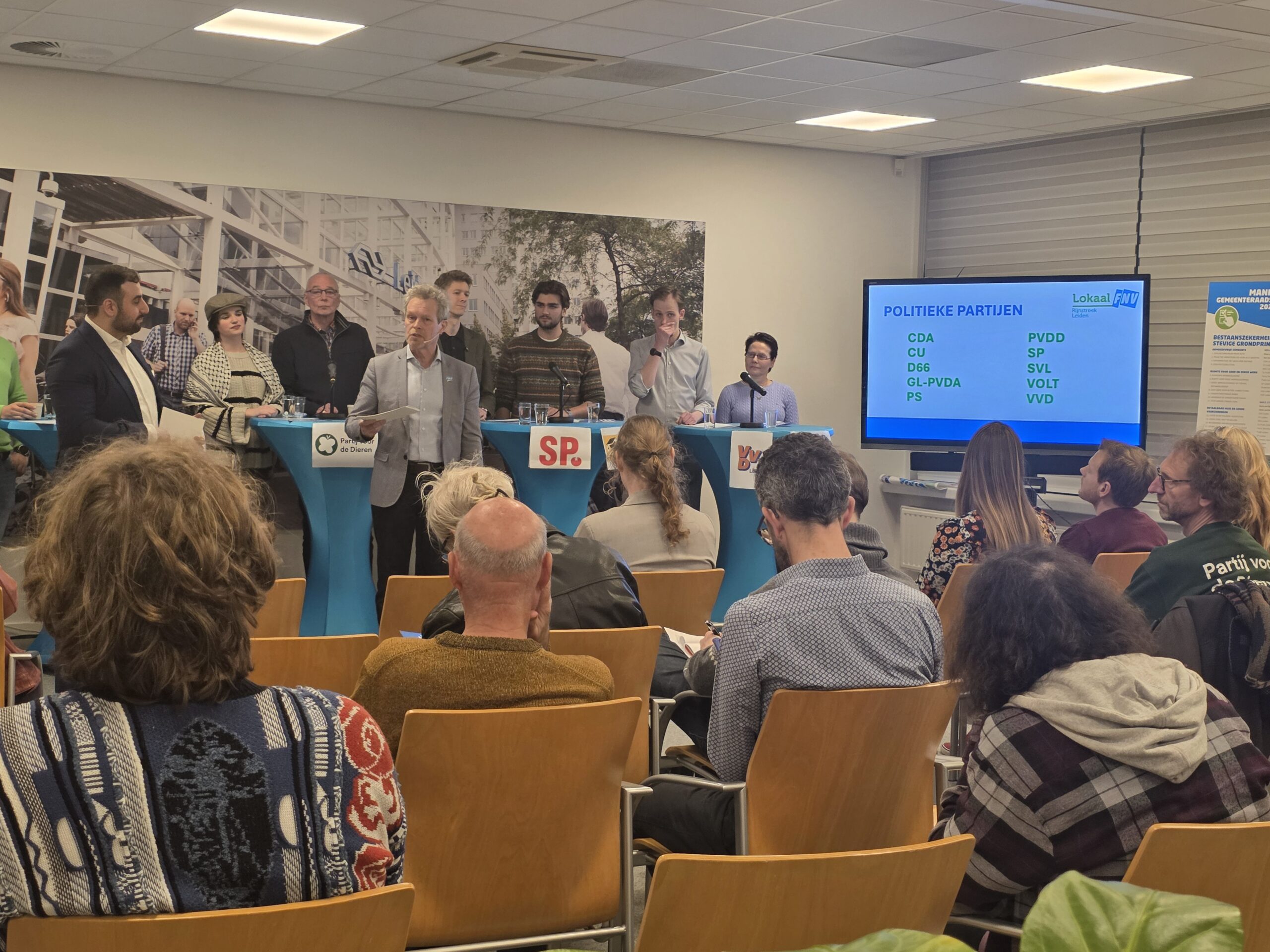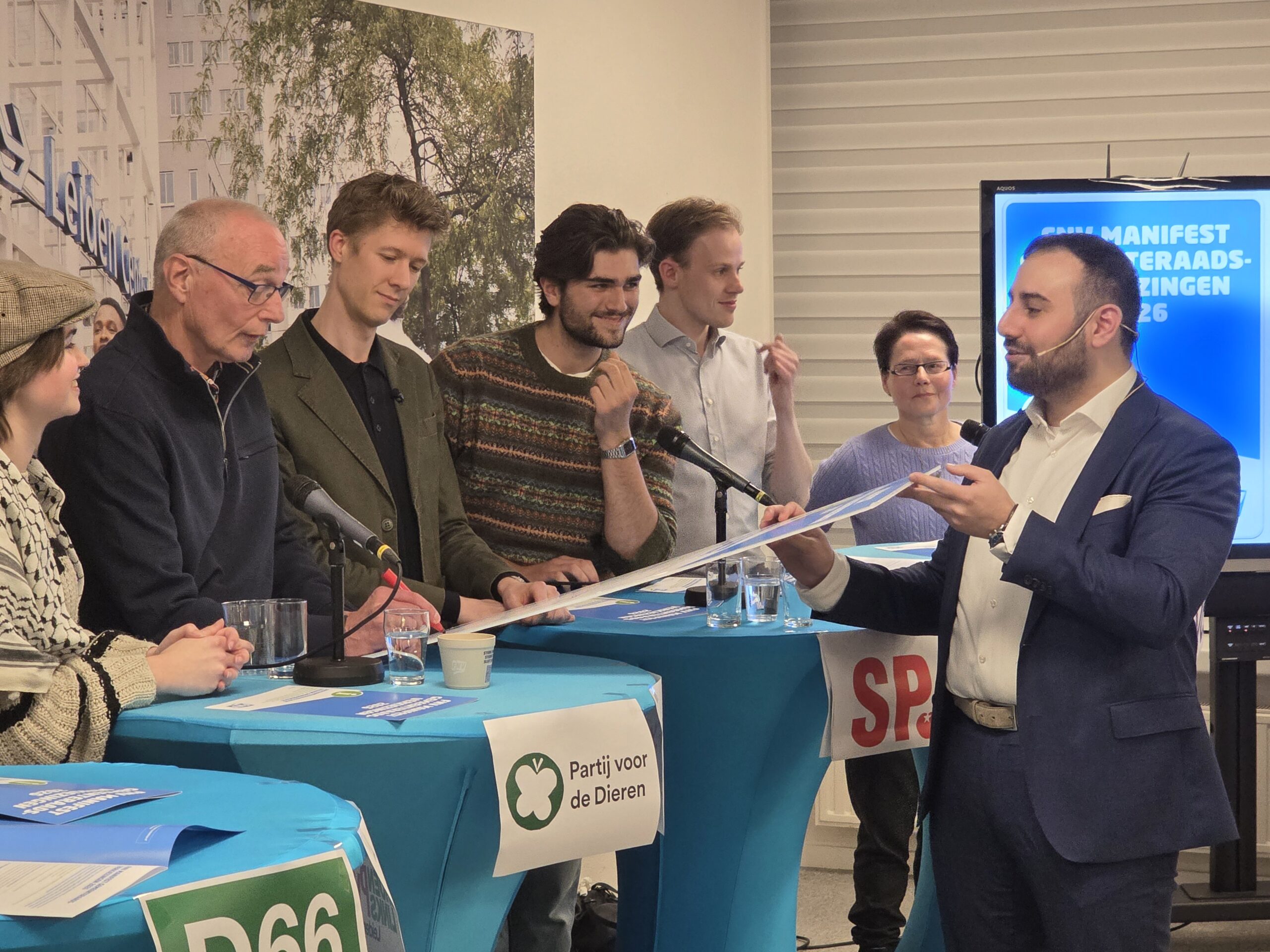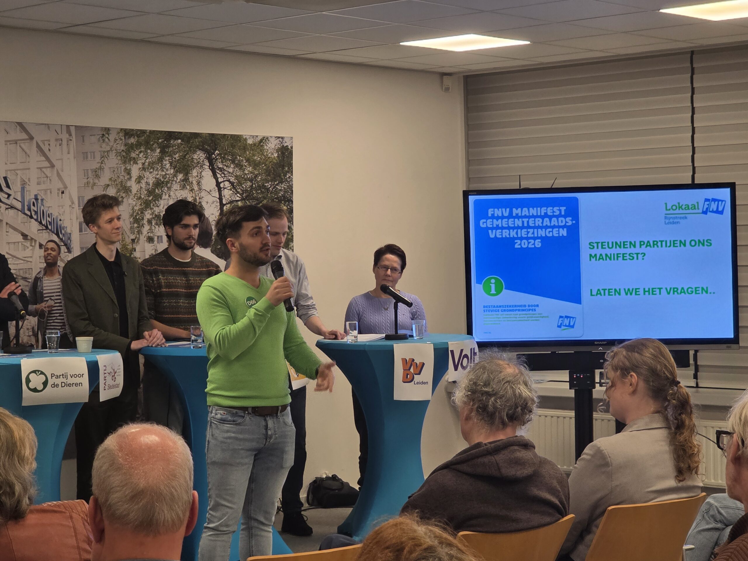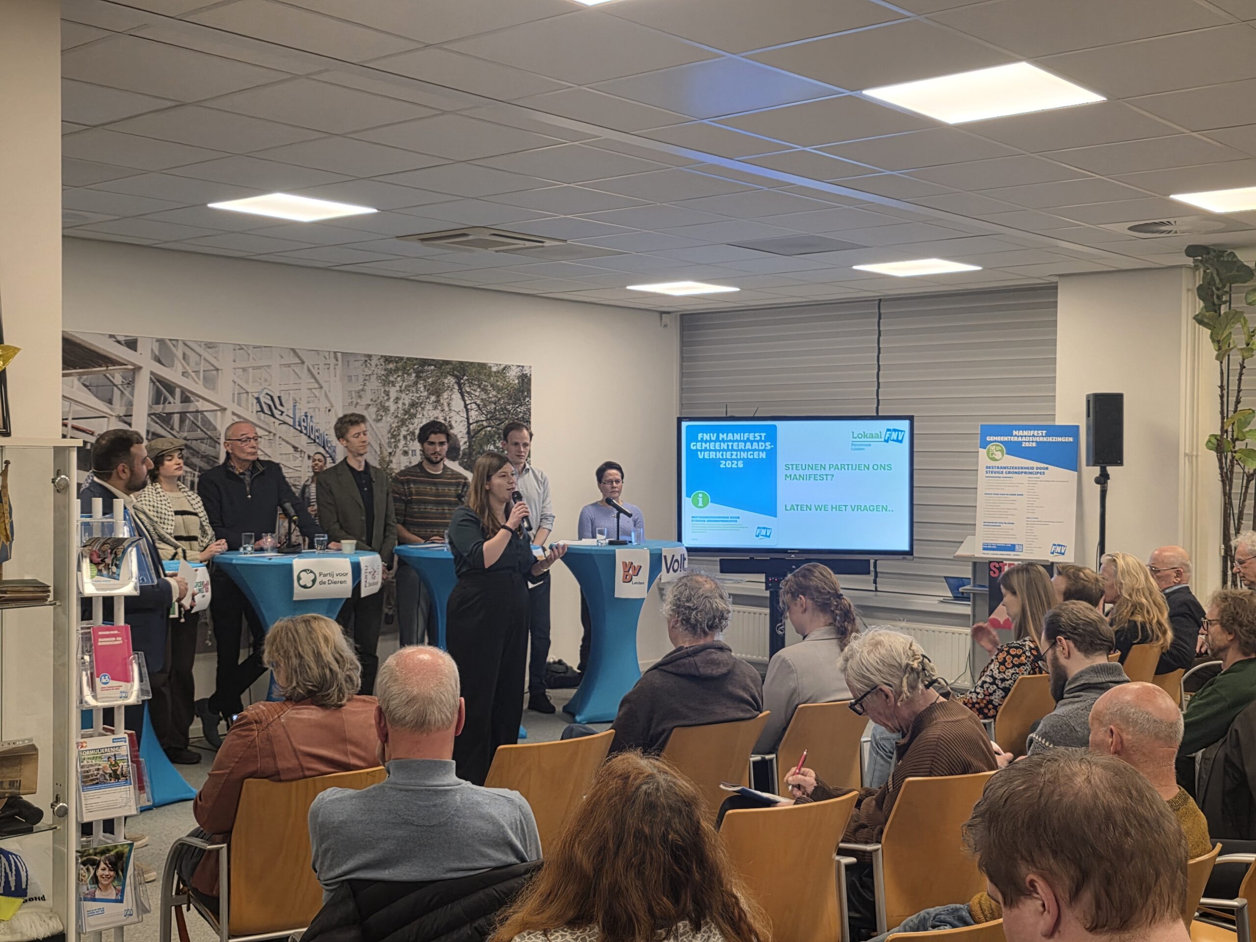 Na een introductie per partij, werd aan alle politici het zestienpuntenplan voorgelegd dat de FNV speciaal voor de gemeenteraadsverkiezingen heeft opgesteld. Veel partijen onderschrijven tenminste een deel van die punten en zetten er een handtekening onder. Alleen de VVD Leiden deed dat niet.