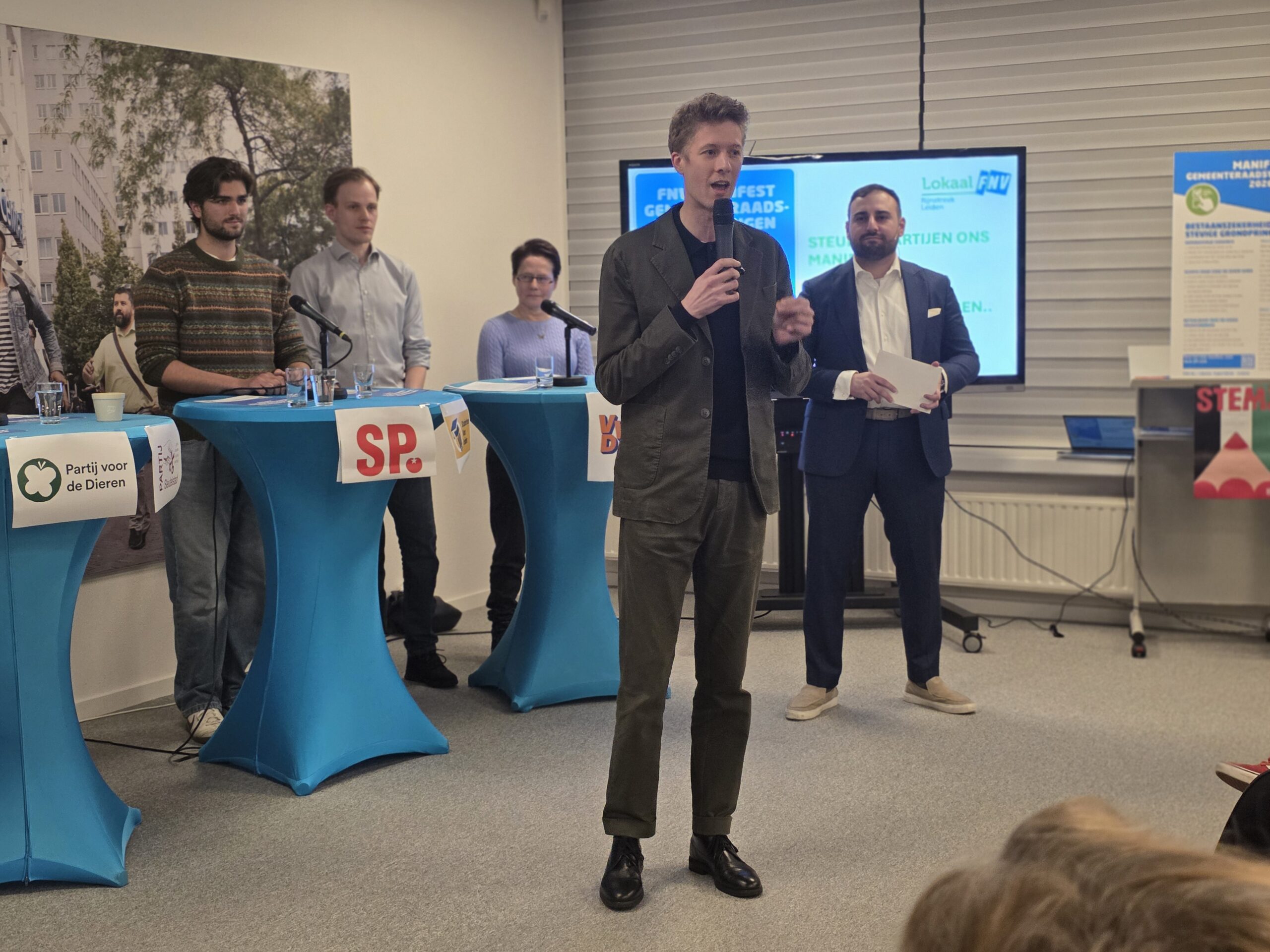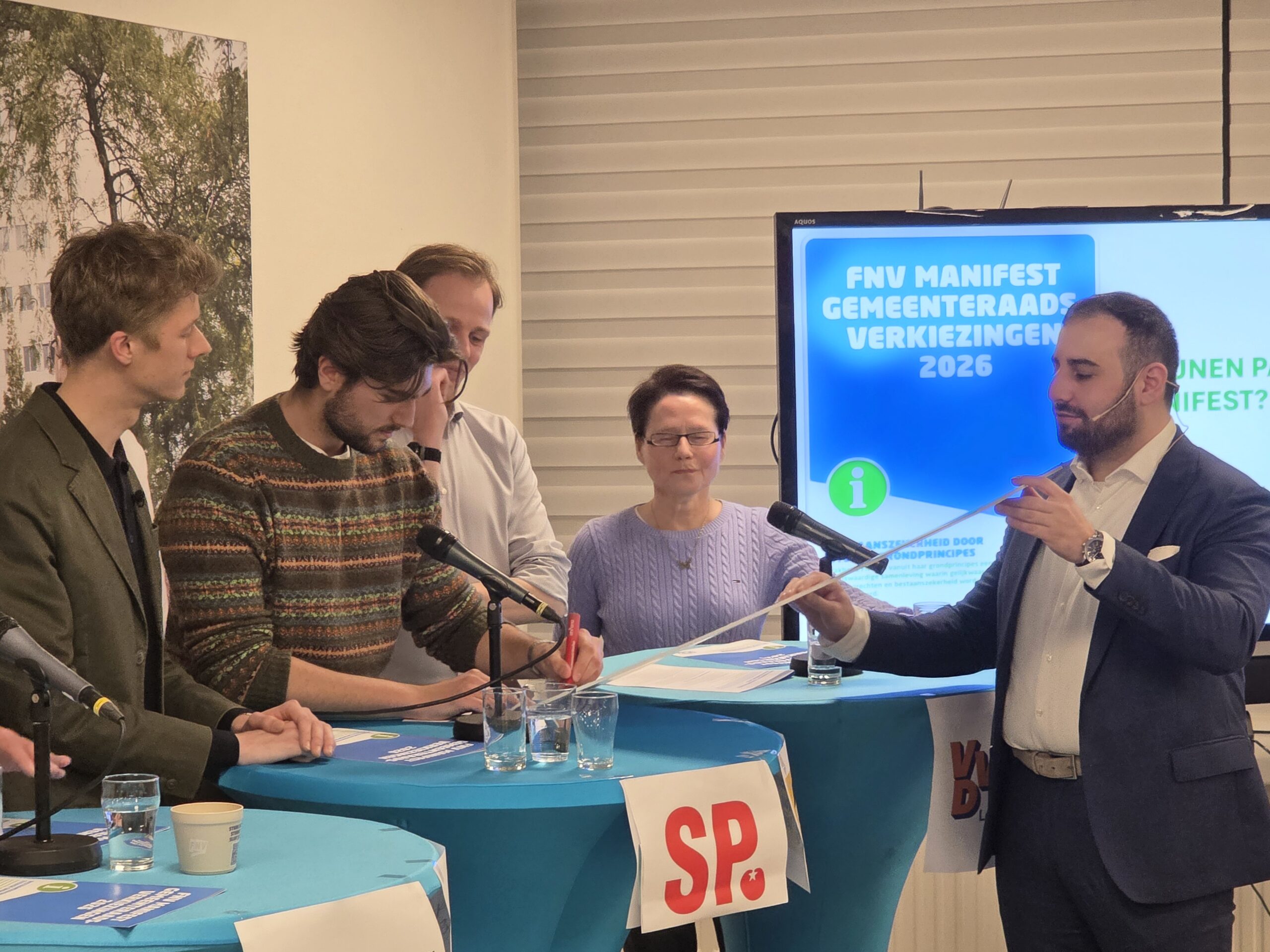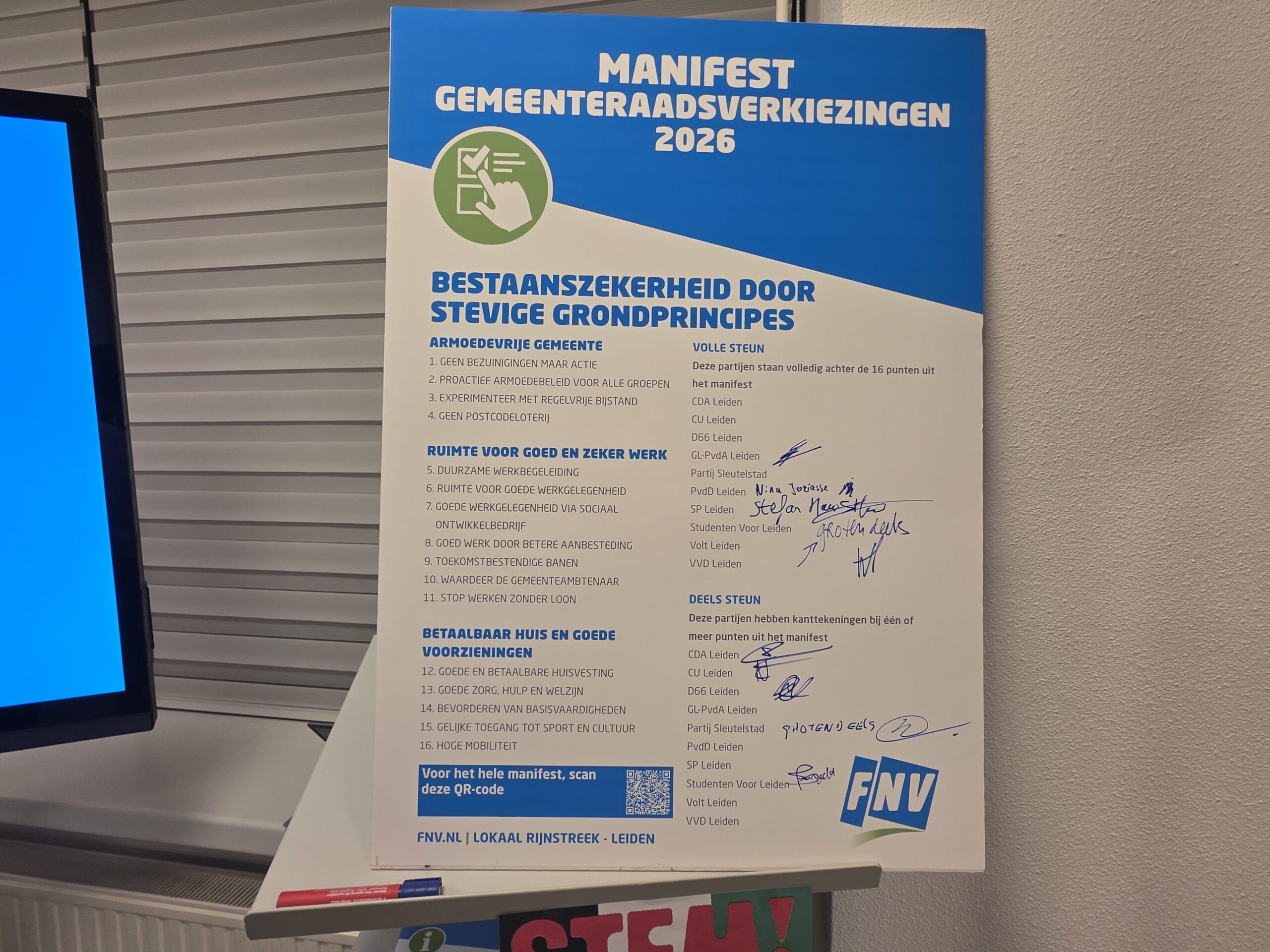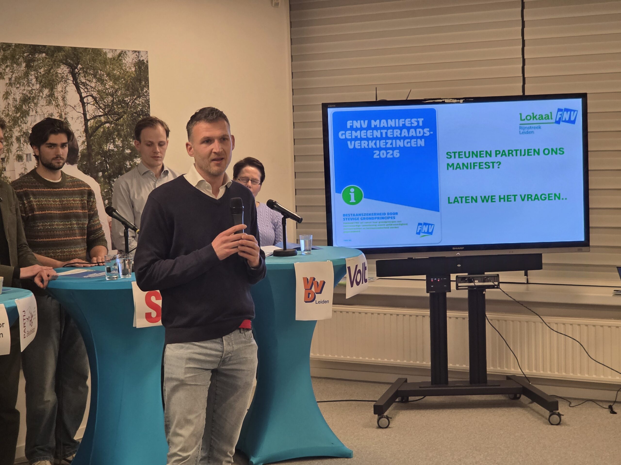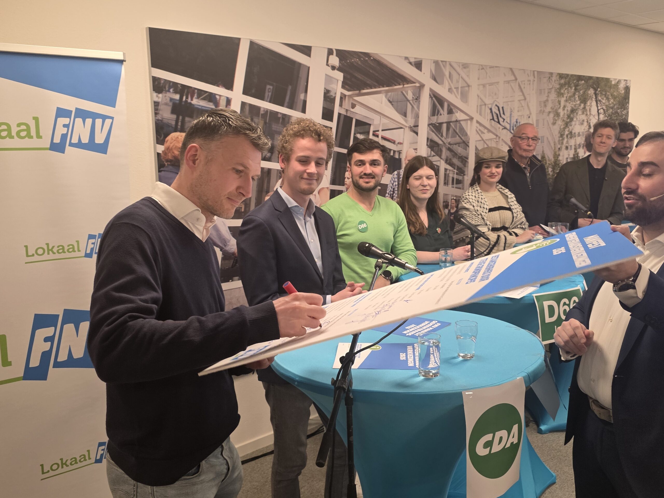 Na een introductie per partij, werd aan alle politici het zestienpuntenplan voorgelegd dat de FNV speciaal voor de gemeenteraadsverkiezingen heeft opgesteld. Veel partijen onderschrijven tenminste een deel van die punten en zetten er een handtekening onder. Alleen de VVD Leiden deed dat niet.