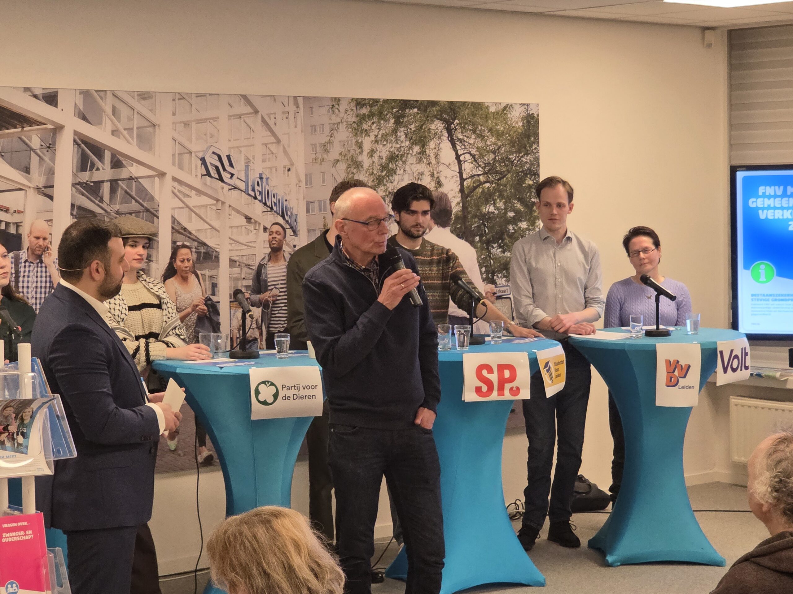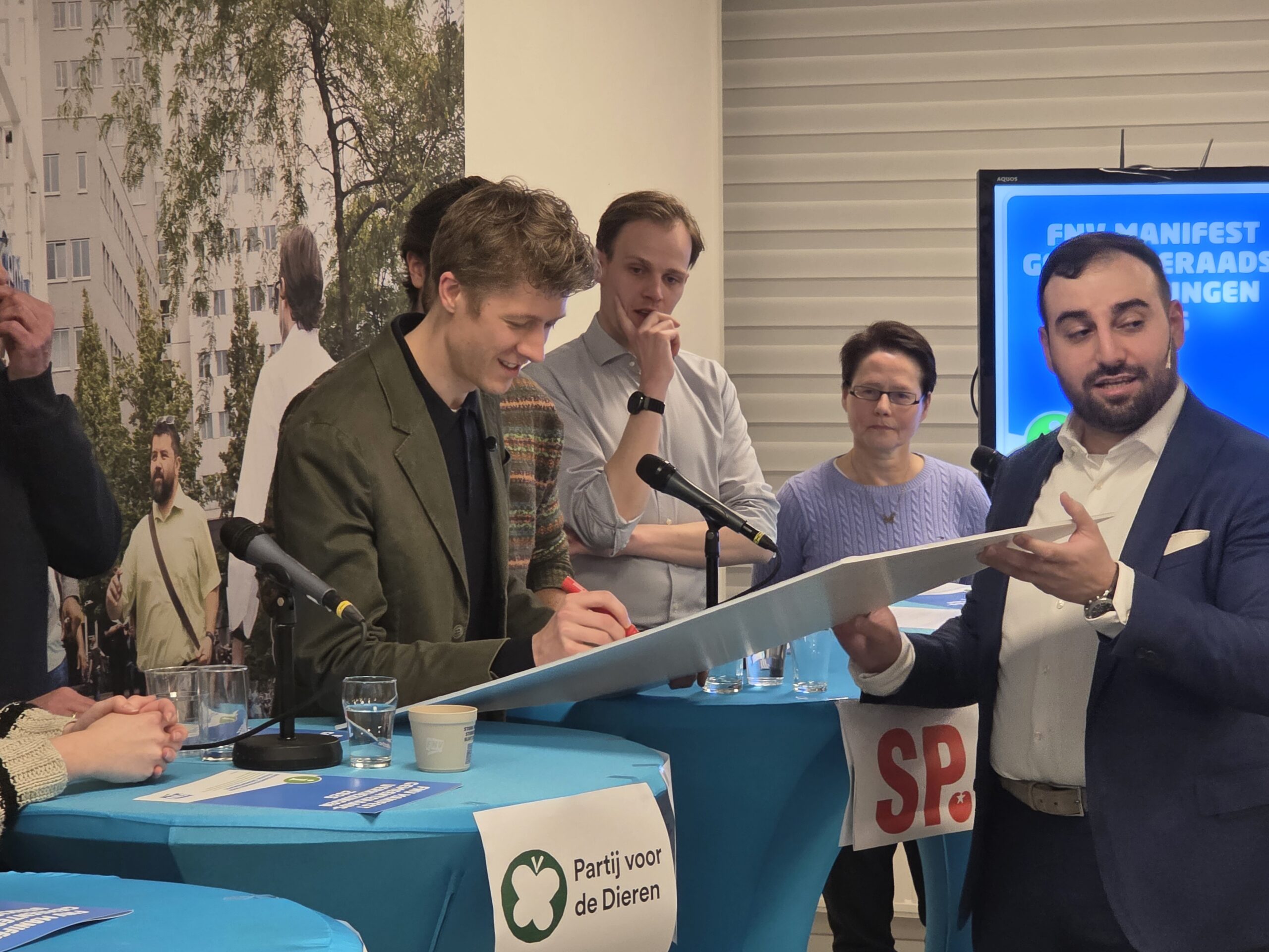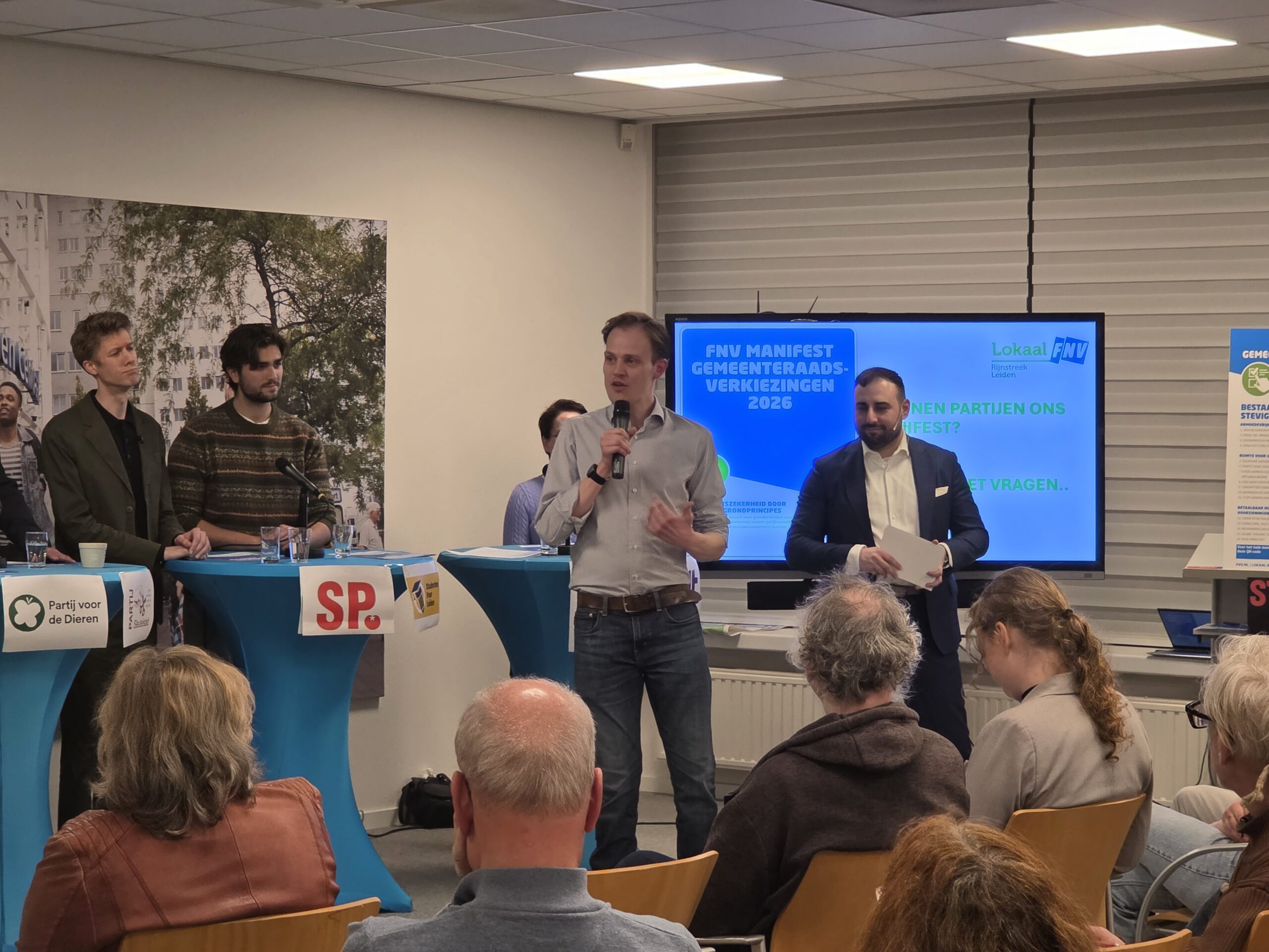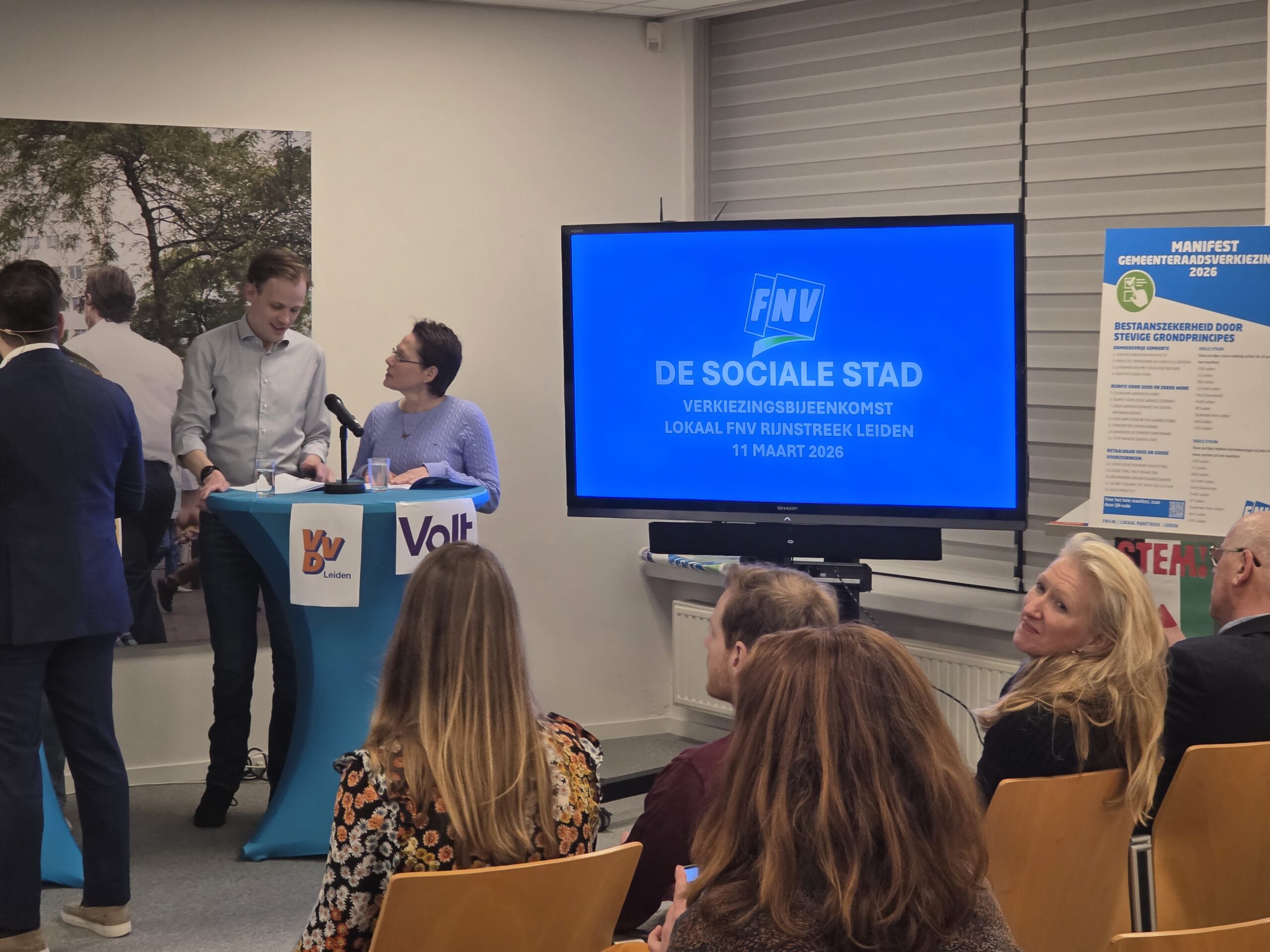 Na een introductie per partij, werd aan alle politici het zestienpuntenplan voorgelegd dat de FNV speciaal voor de gemeenteraadsverkiezingen heeft opgesteld. Veel partijen onderschrijven tenminste een deel van die punten en zetten er een handtekening onder. Alleen de VVD Leiden deed dat niet.