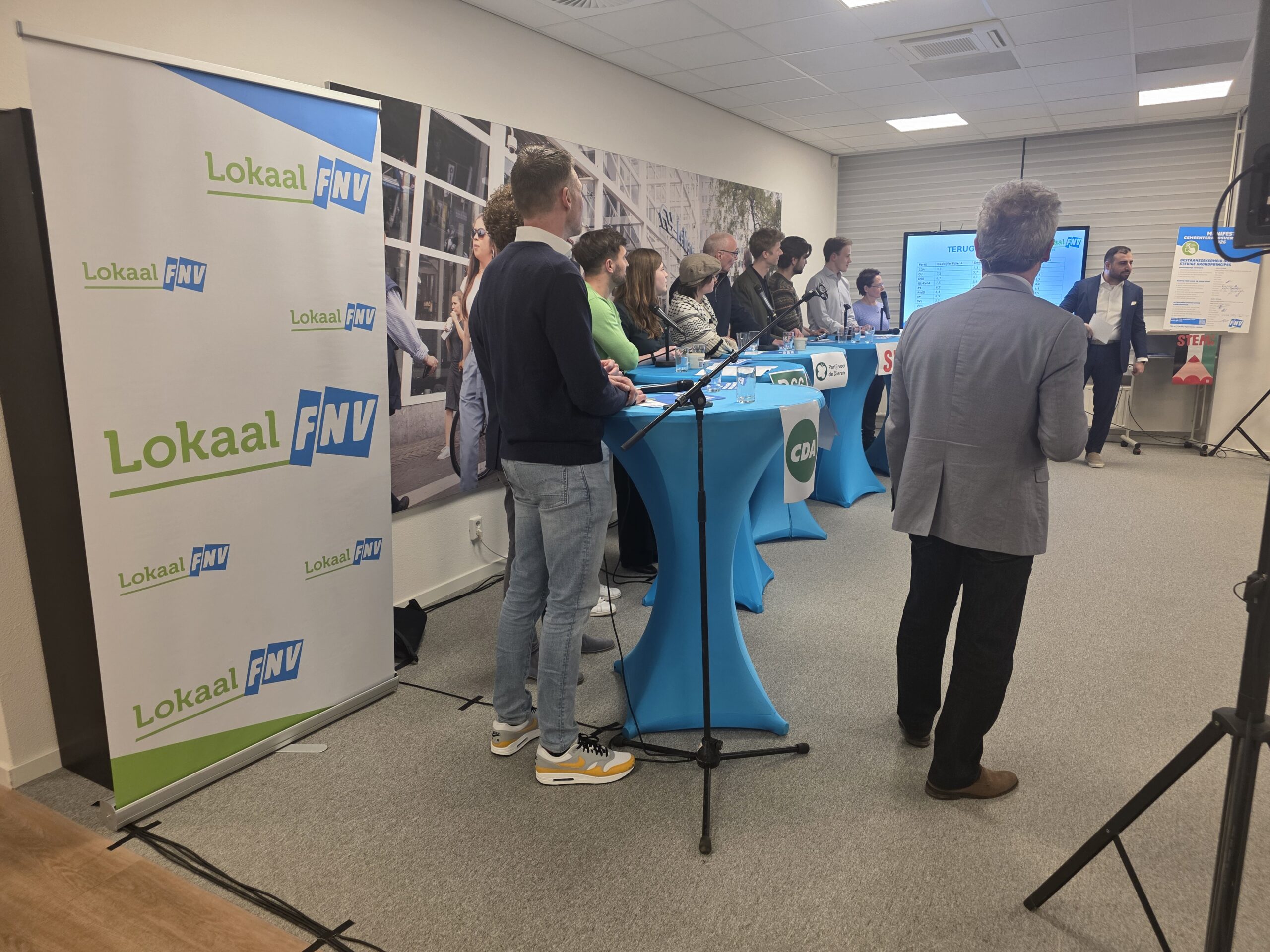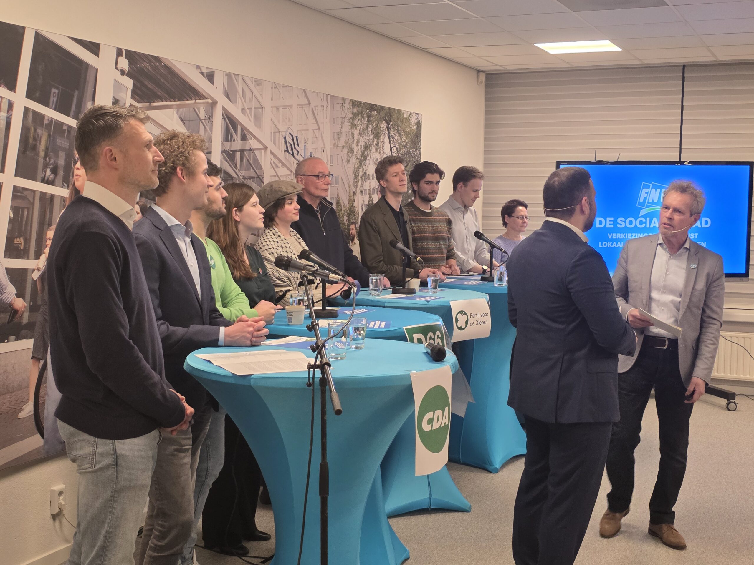 Vertegenwoordigers van tien politieke partijen. FVD ontbrak, gaan in het debat met elkaar in gesprek over zaken als armoede, goed en zeker werk en betaalbare huisvesting en goede voorzieningen. Het debat staat onder leiding van Ebrar Kaya en Thomas van Duin van de FNV.