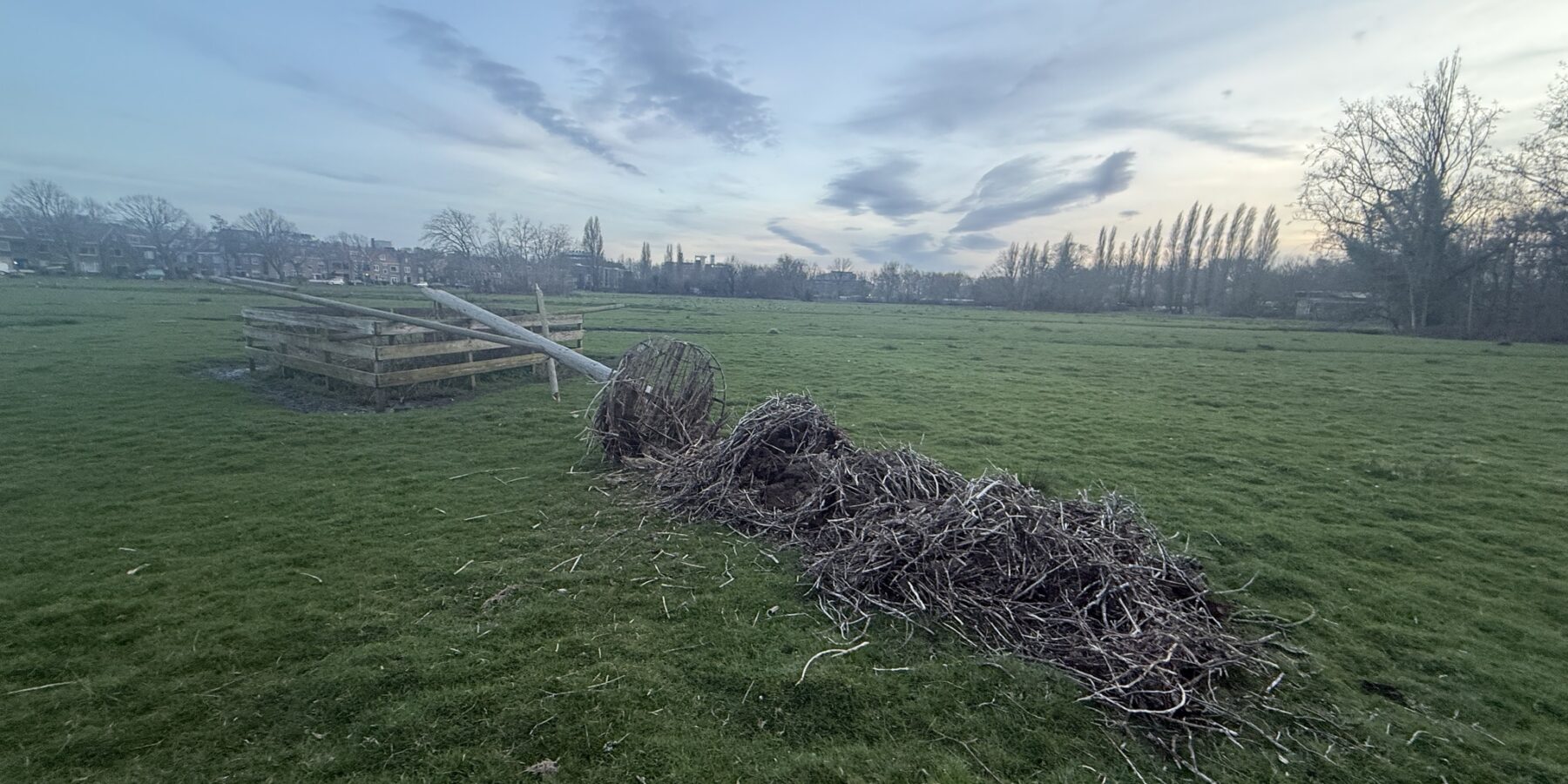 De ooievaarspaal op het Landje van Bremmer op de grens van Leiden en Oegstgeest is donderdag aan het eind van de middag omgewaaid. “We zijn ’s avonds meteen gaan kijken”, vertelt coördinator Liselotte Rambonnet van de Dierenambulance en Vogelasiel Regio Leiden aan Sleutelstad.