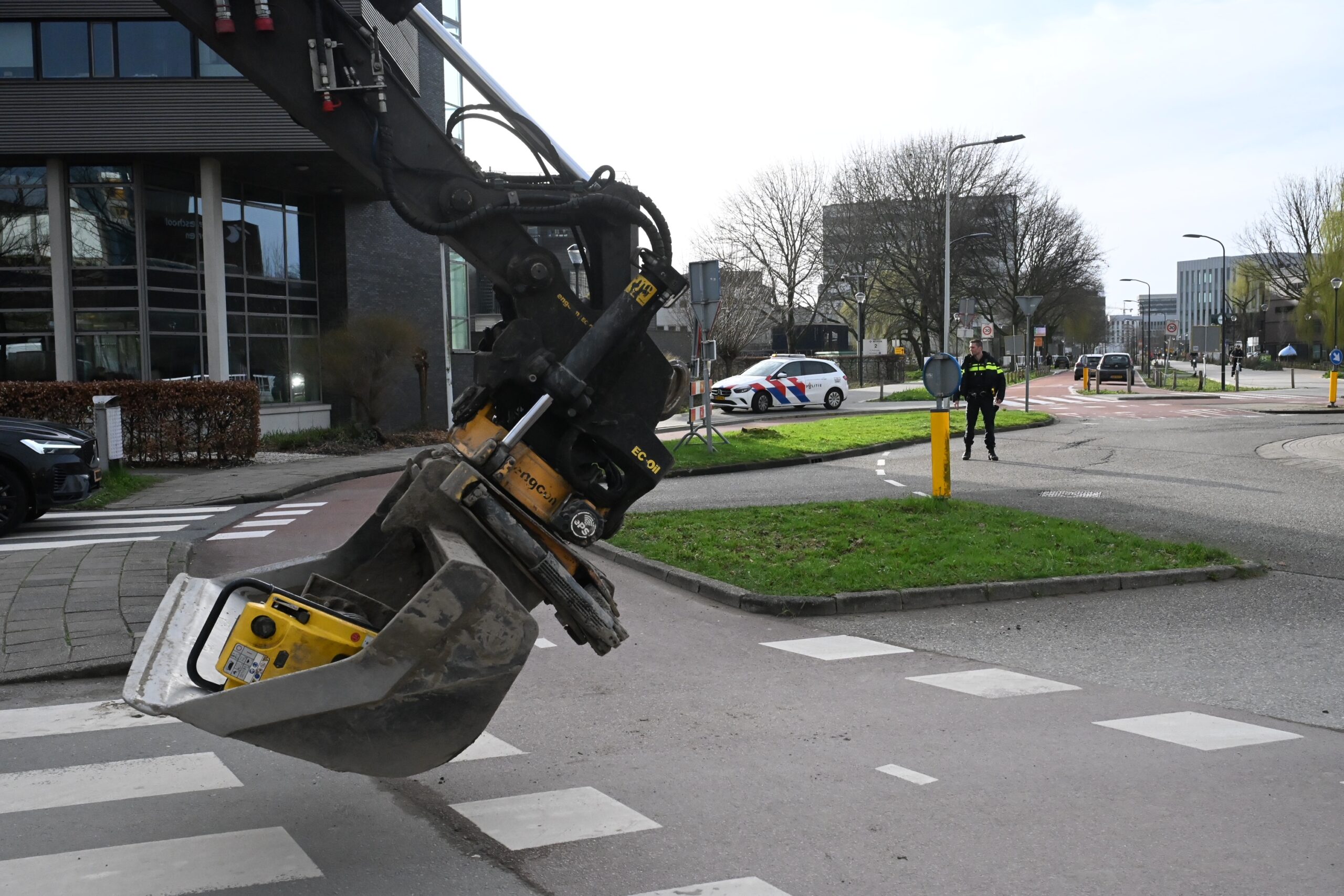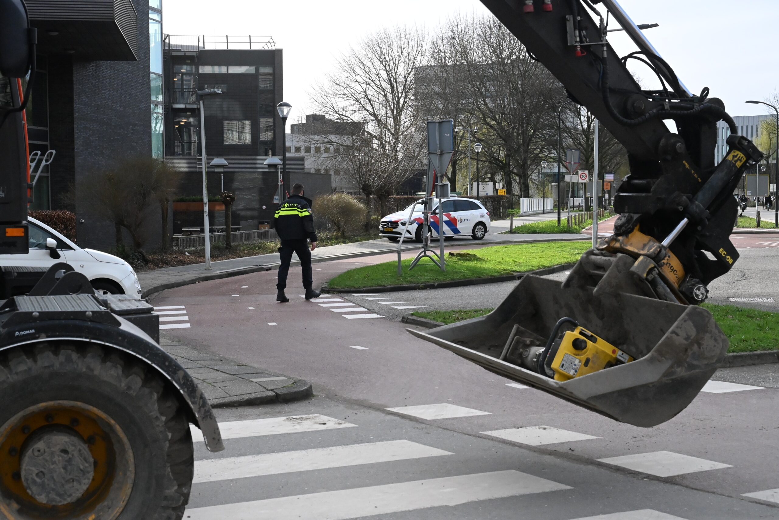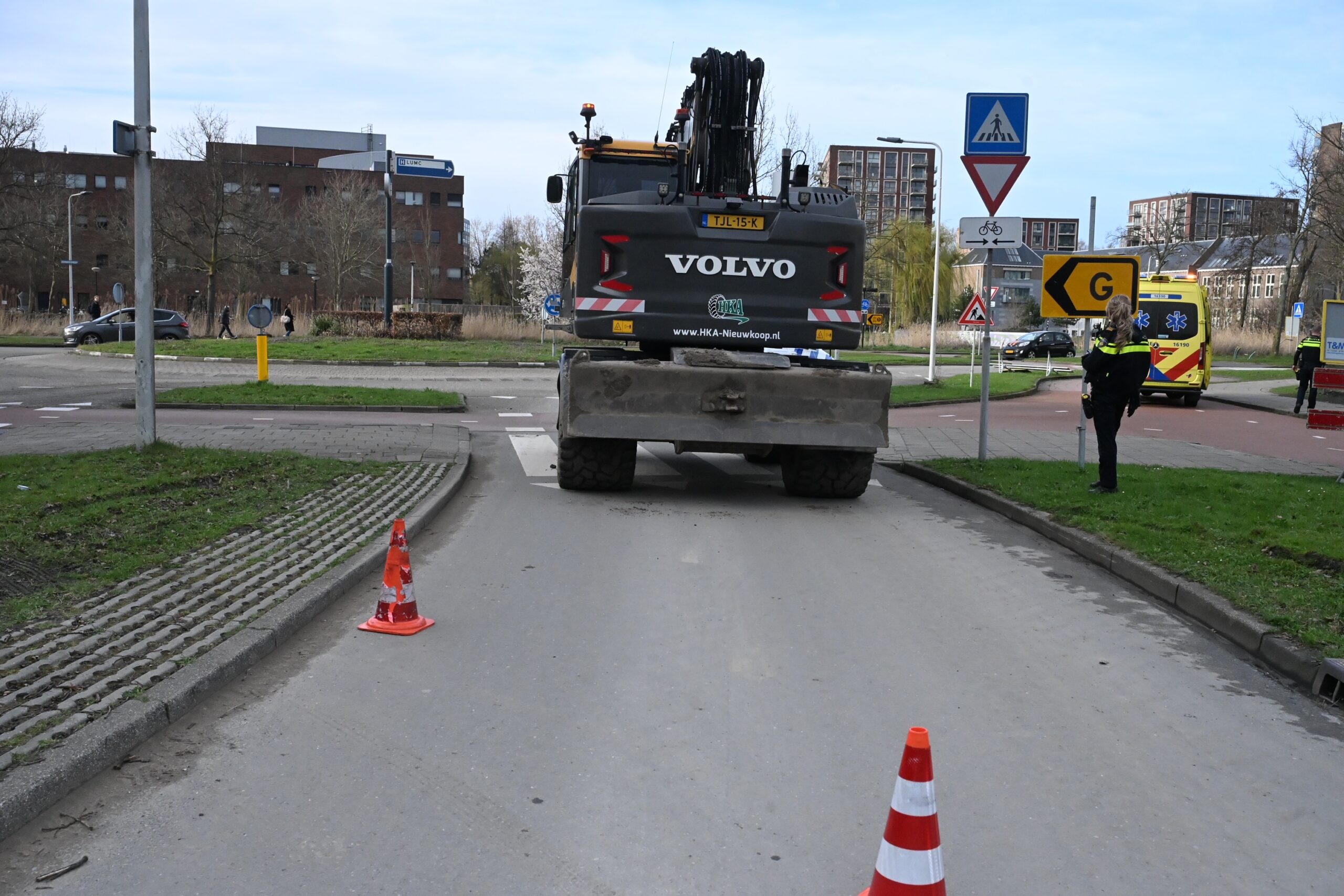 Een overstekende vrouw is vrijdagmiddag rond 16.30 uur op het zebrapad bij de rotonde op de Darwinweg in Leiden aangereden door een graafmachine.