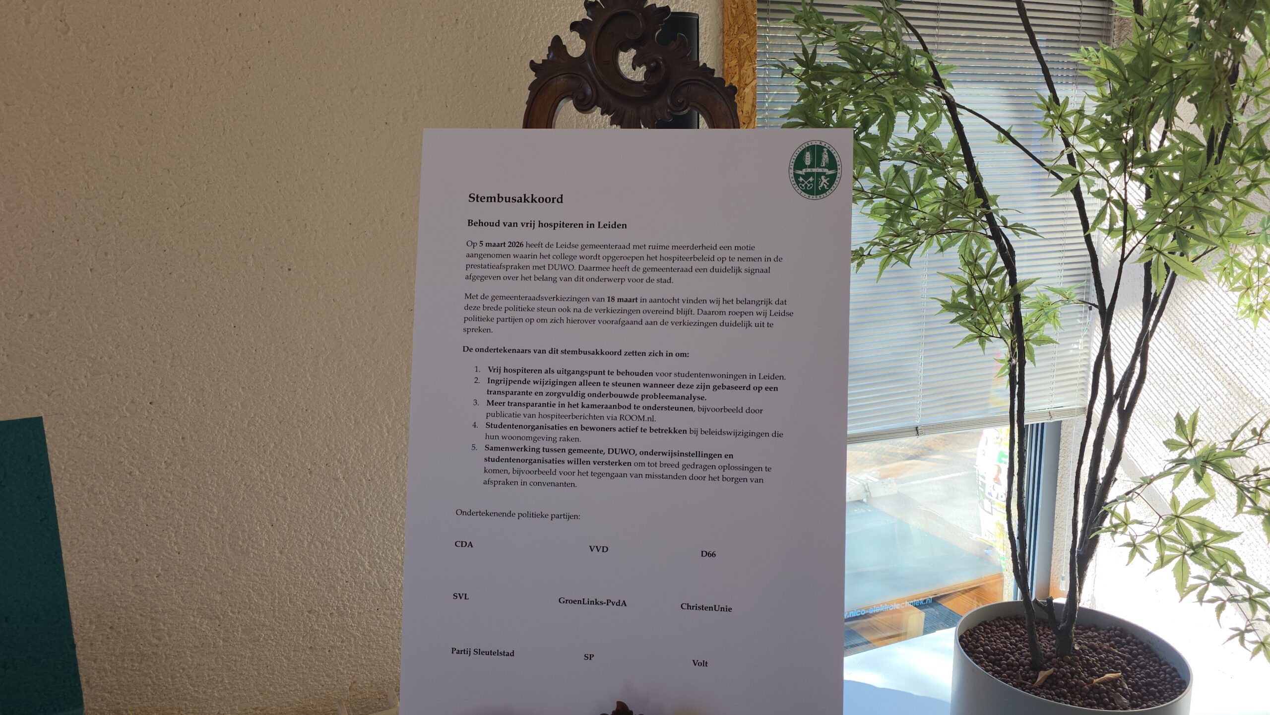Begin deze maand nam de Leidse gemeenteraad een motie aan waarin het college werd opgeroepen om zich maximaal in te zetten om vrij hospiteren in DUWO-huizen te behouden. Woensdagmorgen onderschreven acht van de elf partijen die in Leiden meedoen aan de verkiezingen een soortgelijke oproep in de vorm van een door de Plaatselijke Kamer van Verenigingen (PKvV) opgesteld ‘Stembusakkoord Hospiteren’.