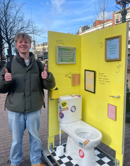 STAD Leiden staat bij het stadhuis met een wc-hokje. “Wil jij nog even je SH*T dumpen over de politiek in Leiden? Dan kun je dit bij ons in de WC gooien”. De jongerenorganisatie roept jongeren ook op om te gaan stemmen. “Want tijdens deze verkiezingen kun je met jouw stem bepalen hoe jouw stad leuker, creatiever en socialer wordt voor jou én je matties.”