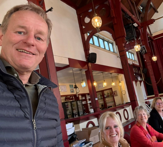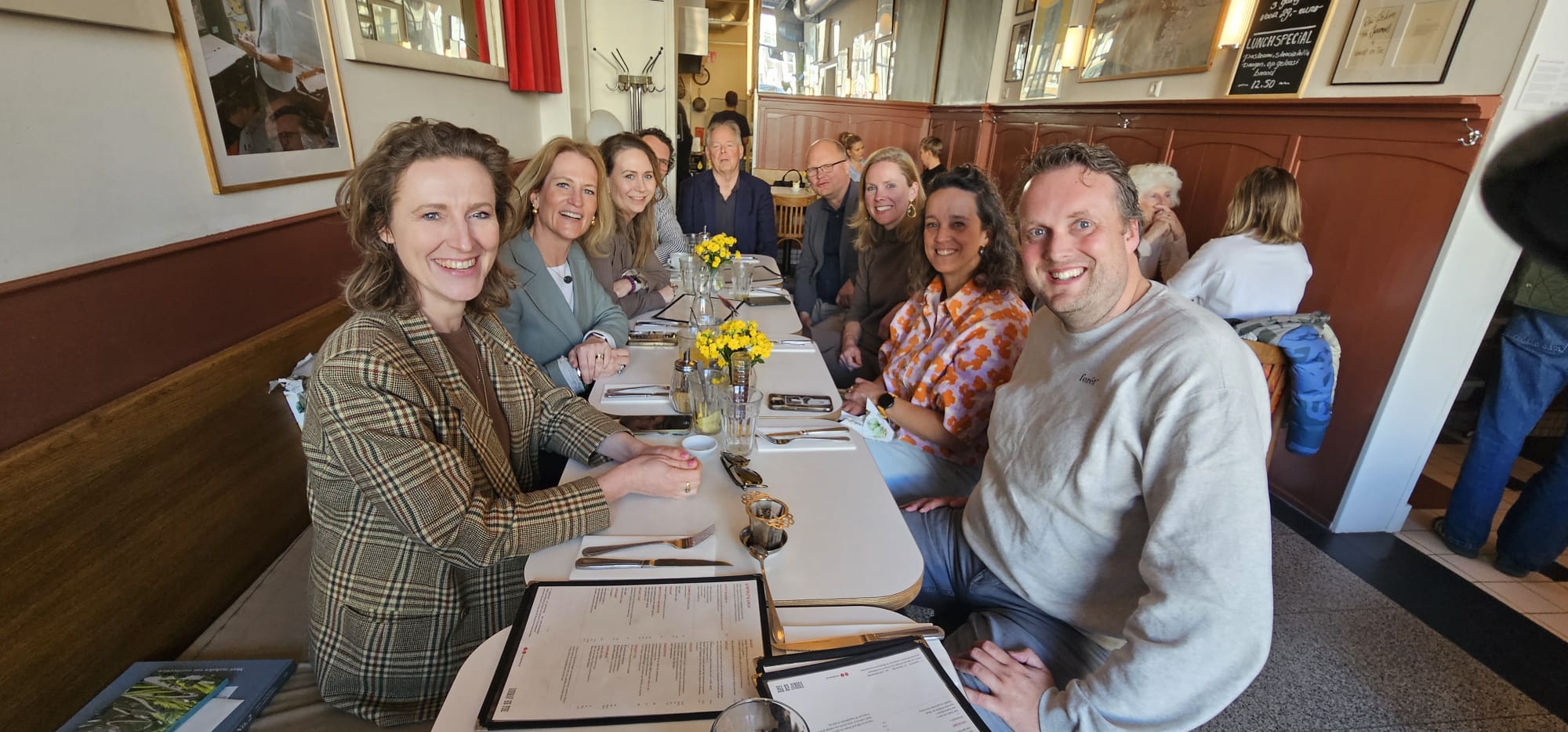 Gespot door Emile ‘Leidse Glibber’ van Aelst. Een lunchtafel bij ‘Vooraf en Toe’ vol met D66 prominenten uit de Leidse regio.