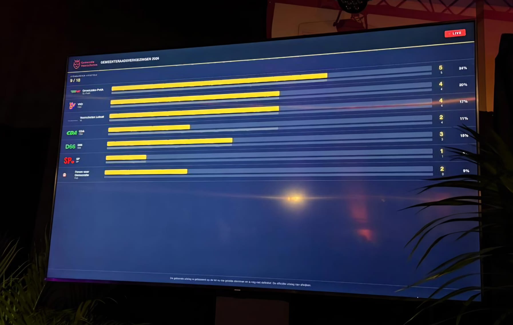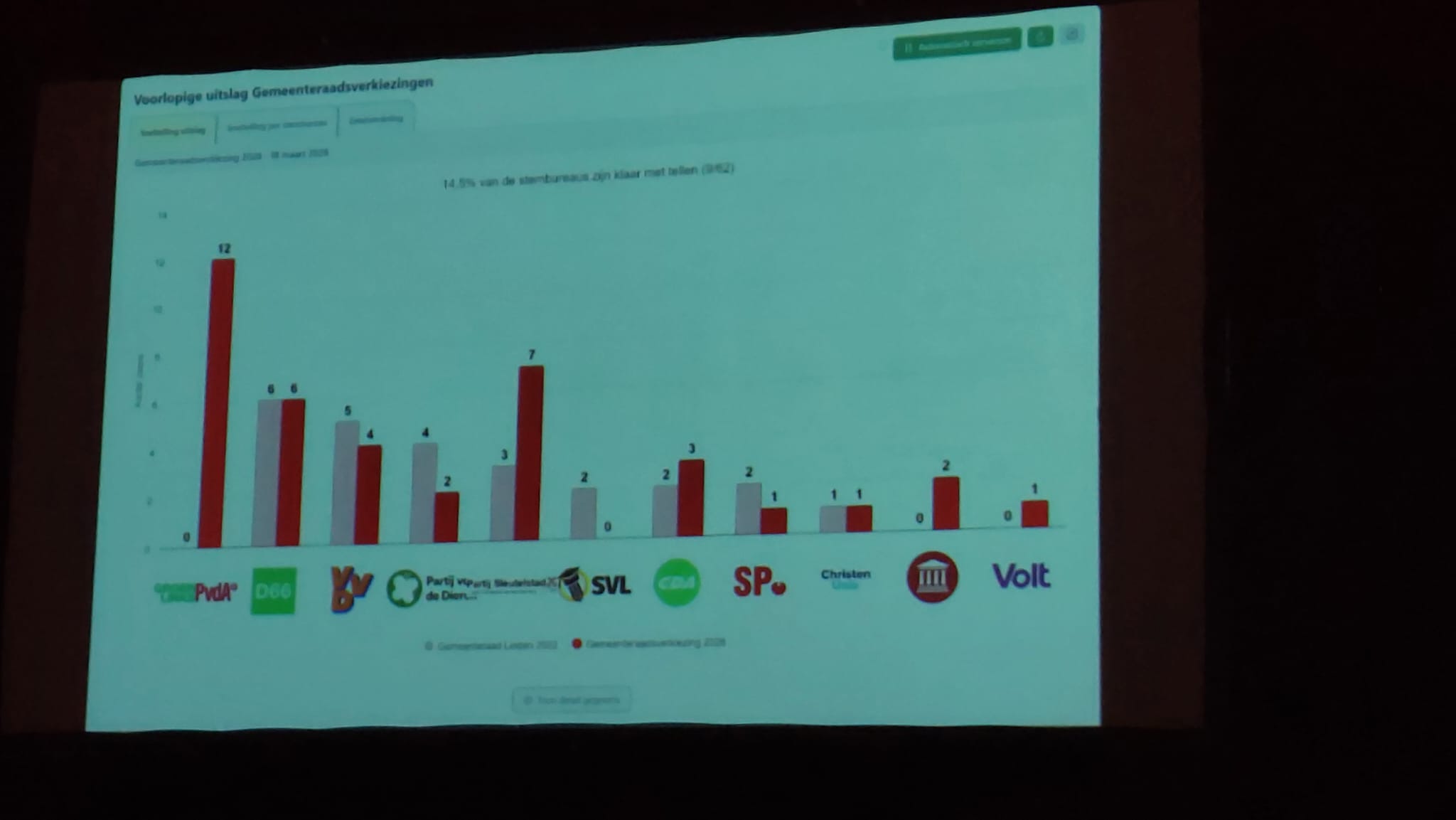 De stemming is bij SvL na de eerste telling gelijk met het aantal zetels, 0.