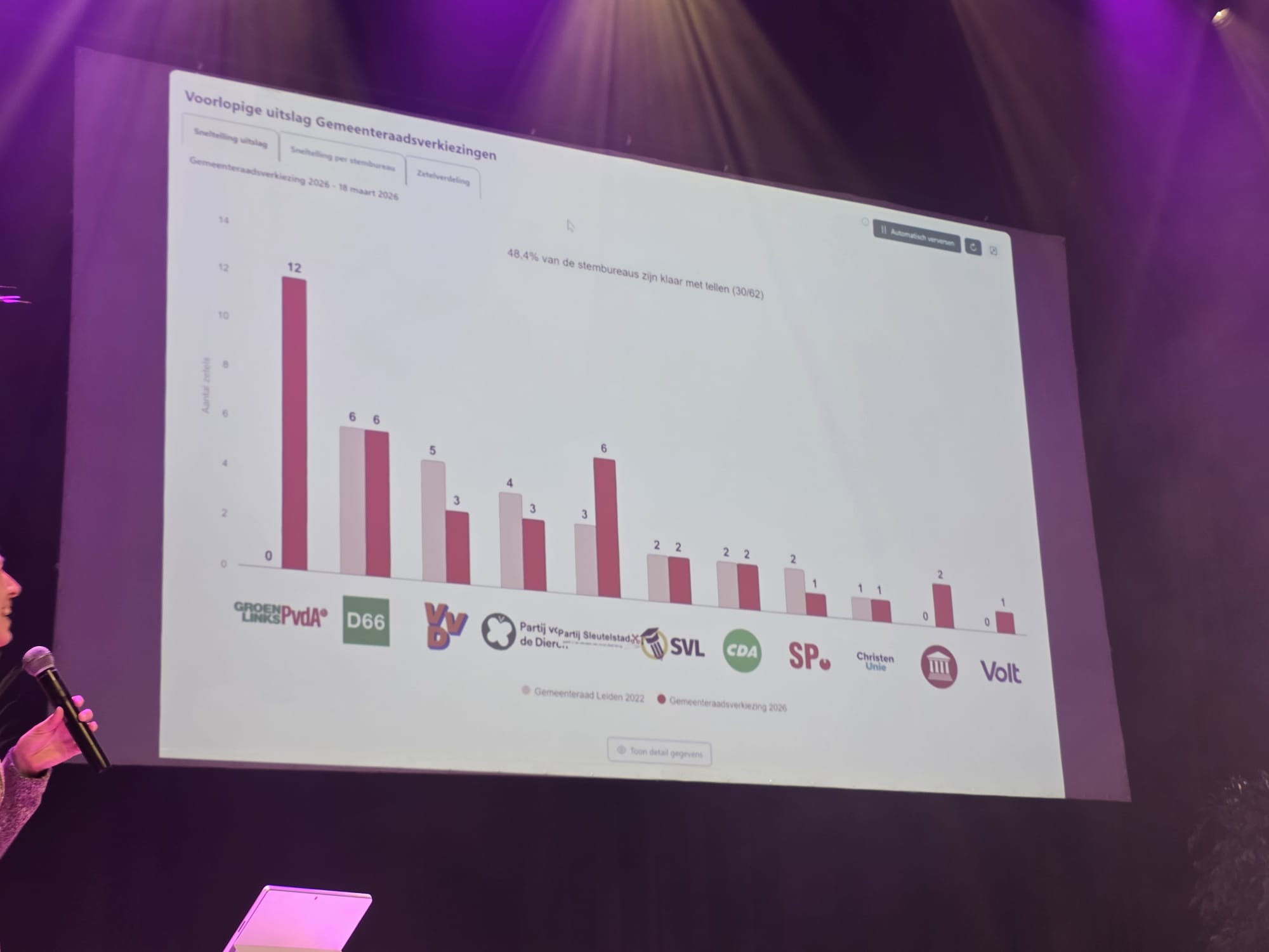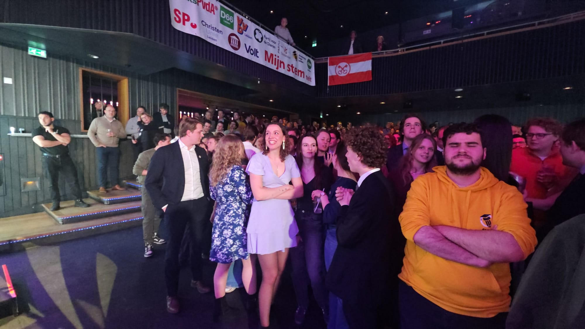 In Leiden is om 23.30 uur zo’n 80 procent van de stemmen geteld. Er zijn ten opzichte van de eerdere tussenstand weinig verschuiving in de zetelverdeling. In de grote zaal van poppodium Nobel stijgt de spanning. De volgende update zal ook gelijk de einduitslag zijn.