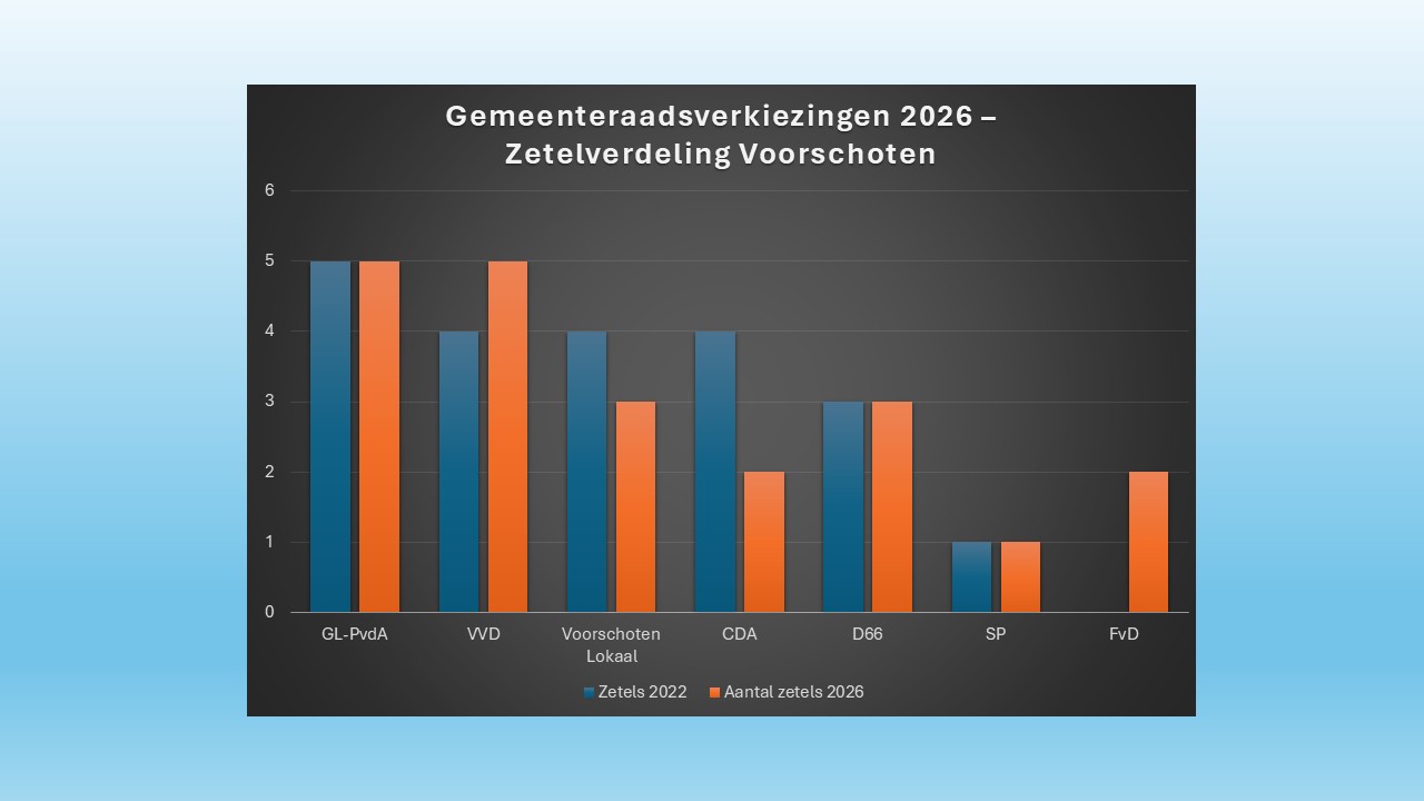 In Voorschoten zijn de stemmen geteld. Er zijn twee winnaars en twee verliezers. CDA en Voorschoten Lokaal verliezen en VVD wint een zetel. Nieuwkomer FvD komt met twee zetels in de raad.