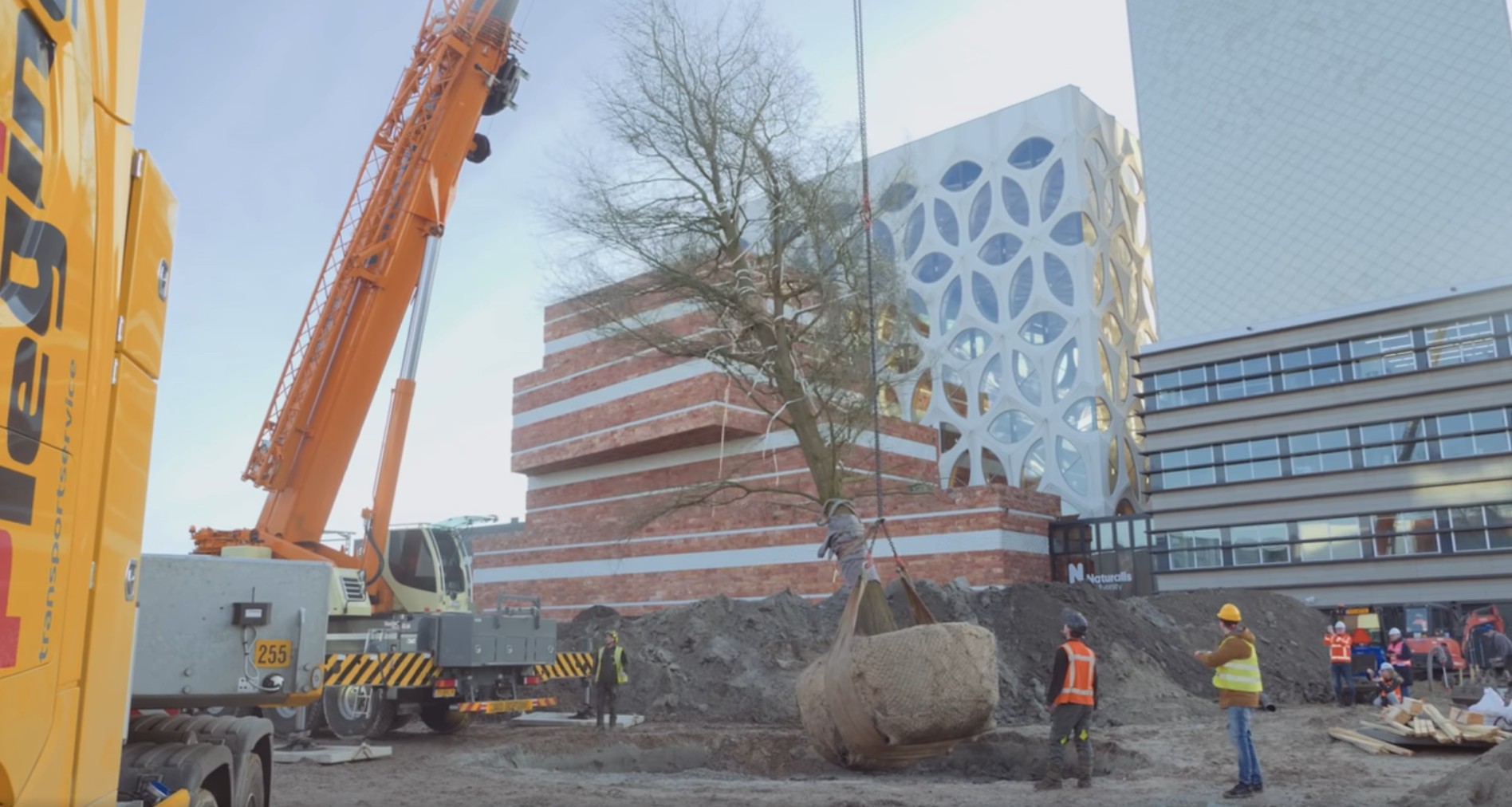 Met een enorme kraan is inmiddels de eerste boom geplant. Het gaat om een zestien meter hoge wilgbladige eik die de blikvanger van de tuin wordt. De komende periode volgen er nog vele soorten, waaronder coniferen, varens, mossen en bloemplanten.