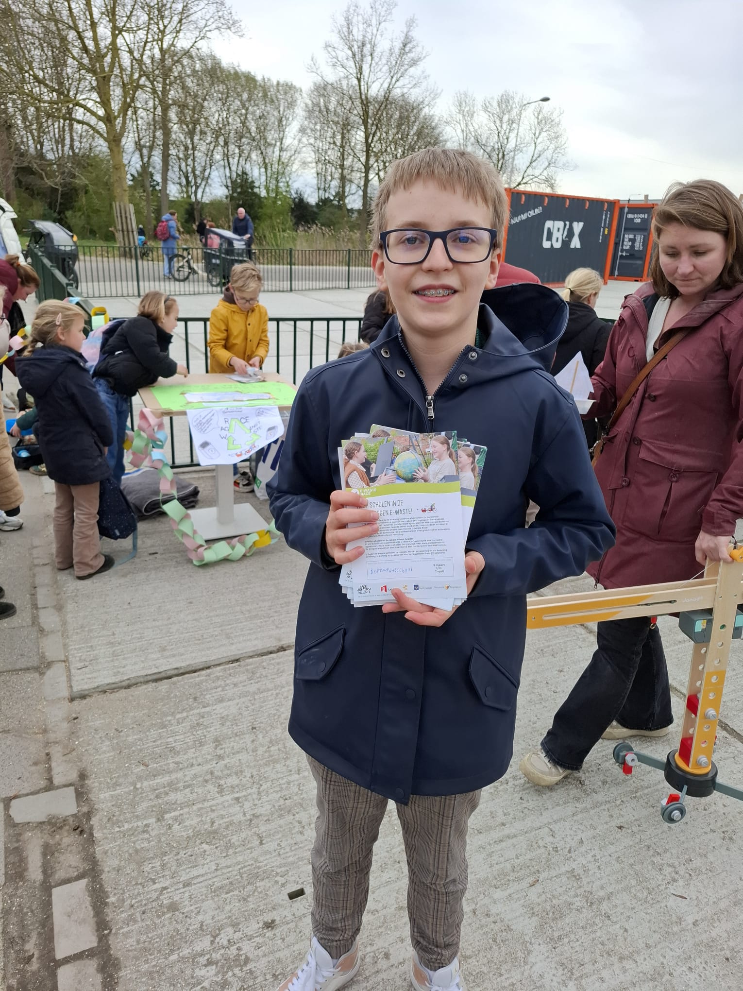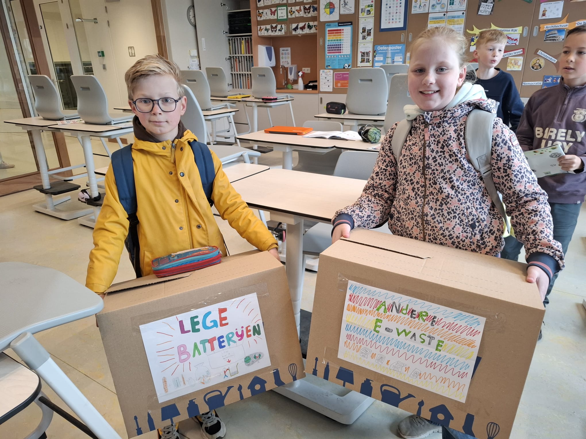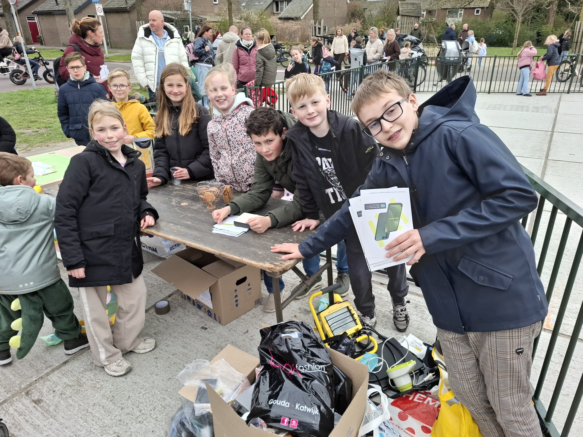 Ze hebben het helemaal zelf geregeld, vertellen Stan, Yara, Yaro, Lily en Noortje uit groep 7. Tussen 14.45 en 15.15 konden ouders afgelopen vrijdag de kapotte spullen inleveren bij de kraam. Daar kregen ze ook een flyer mee, want de e-waste kan ook nog worden aangemeld bij ewasterace.nl. Dan komen de scholieren het zelf ophalen. De actie loopt tot de ochtend van 1 april.