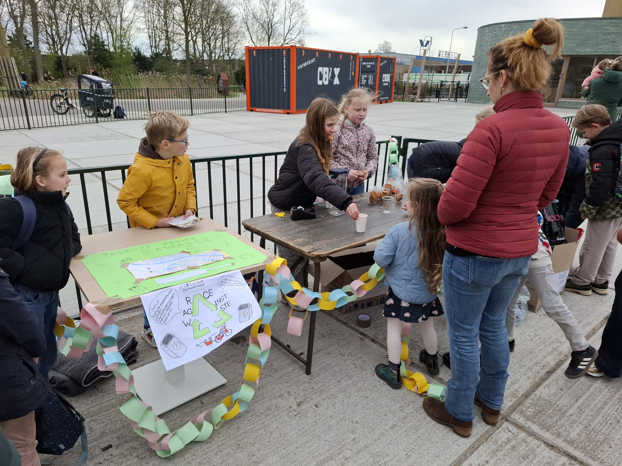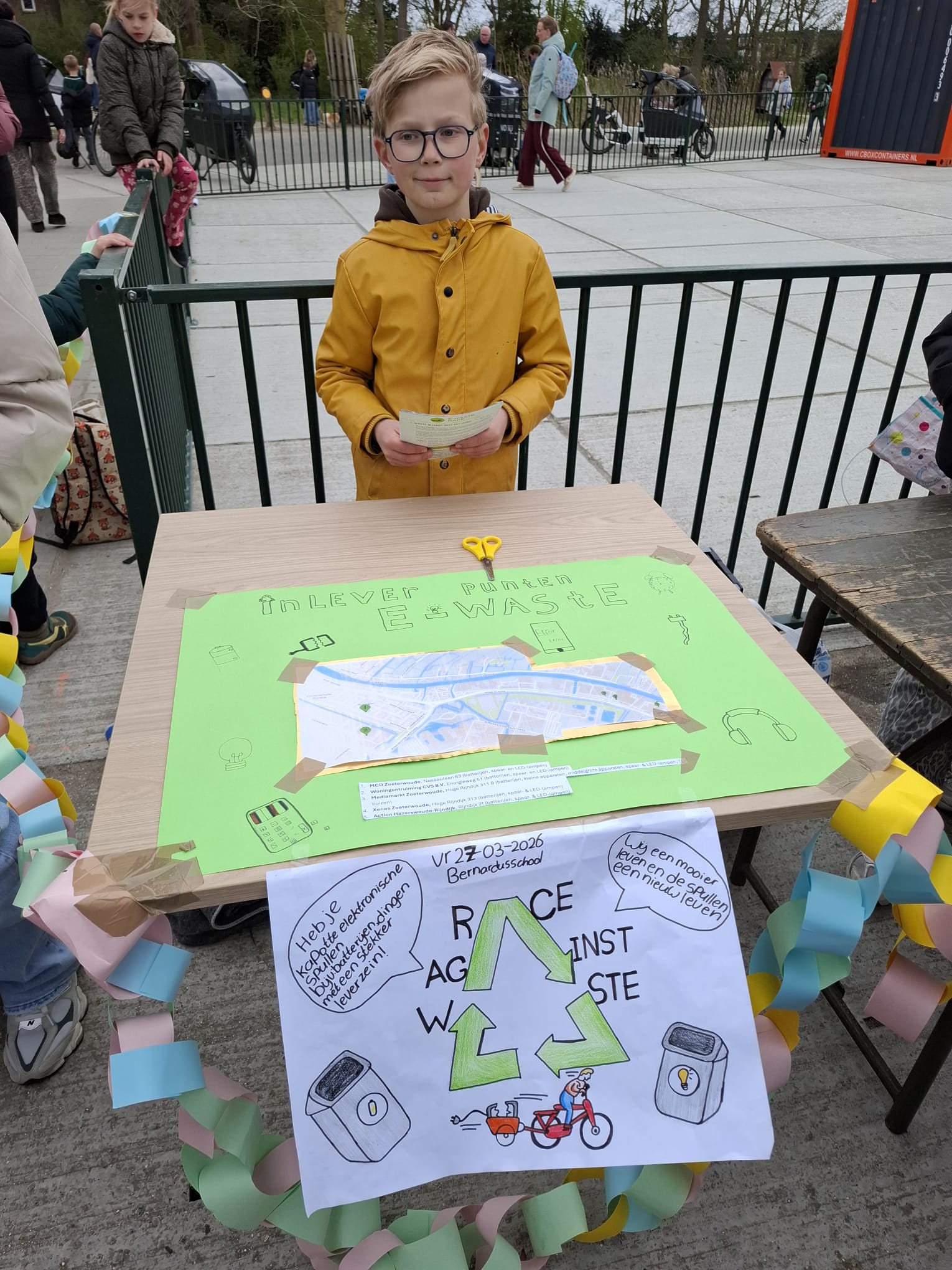 Groep 7 en 8 van de Bernardusschool in Zoeterwoude-Rijndijk hebben afgelopen vrijdag een kraam op hun schoolplein neergezet. In ruil voor een koekje en limonade konden daar kapotte batterijen, kabels en batterijen worden ingeleverd. Ze doen mee aan een wedstrijd om zo veel mogelijk e-waste in te zamelen.