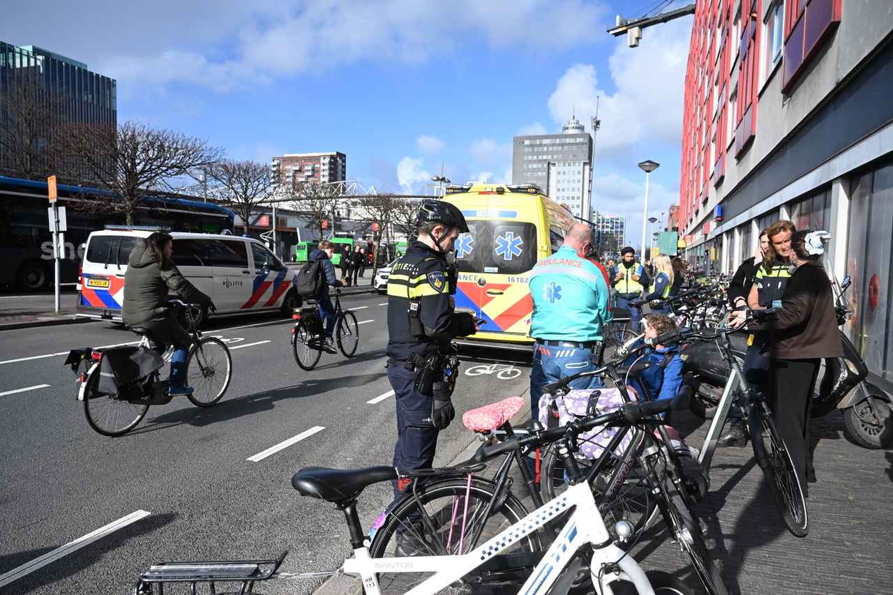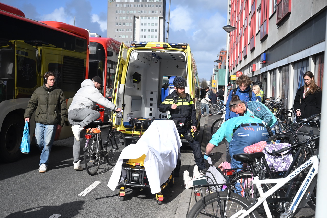 De vrouw is door de ambulance opgehaald en naar het ziekenhuis vervoerd. Het ongeluk gebeurde op het Stationsplein in Leiden ter hoogte van de supermarkten.