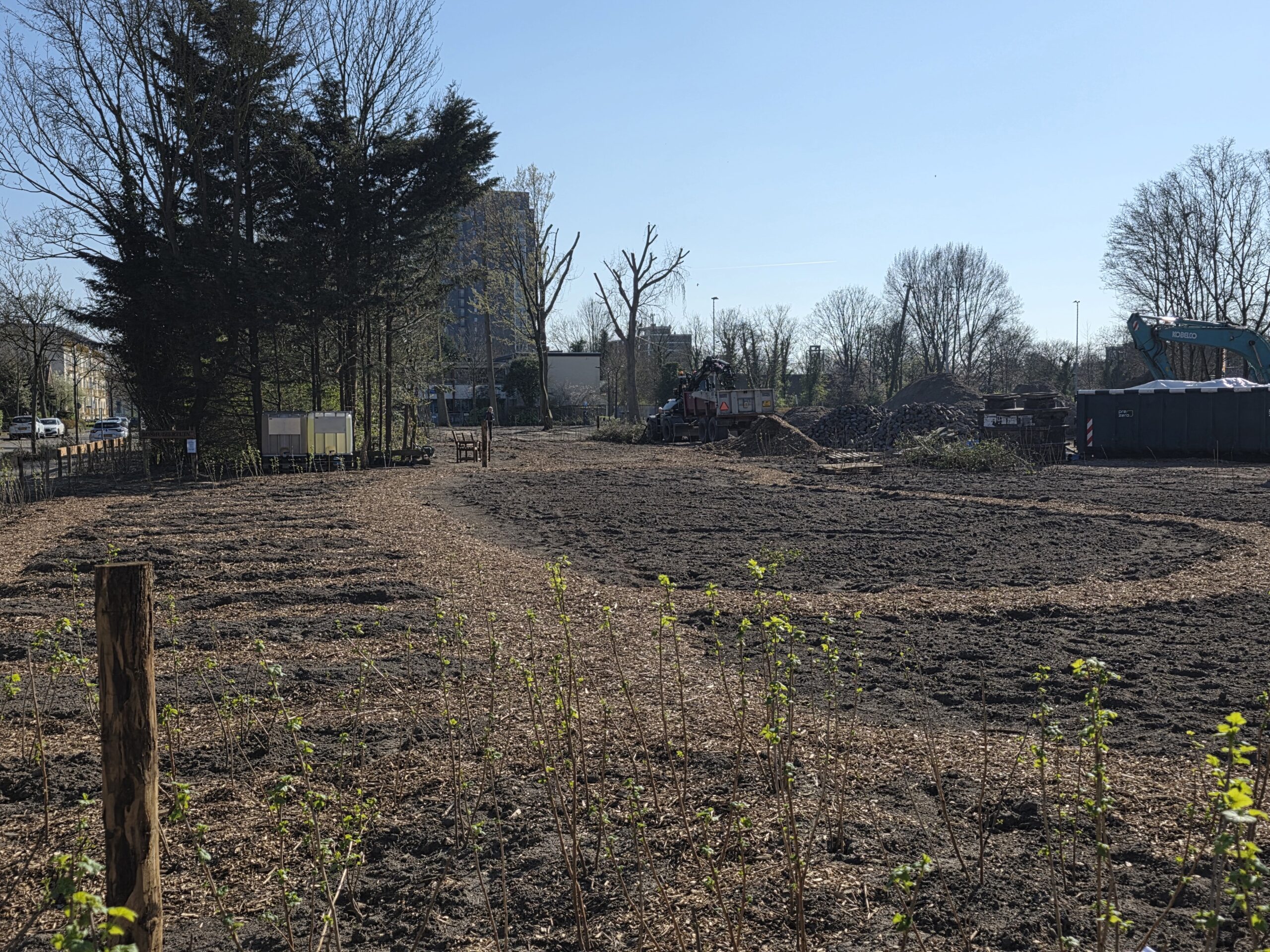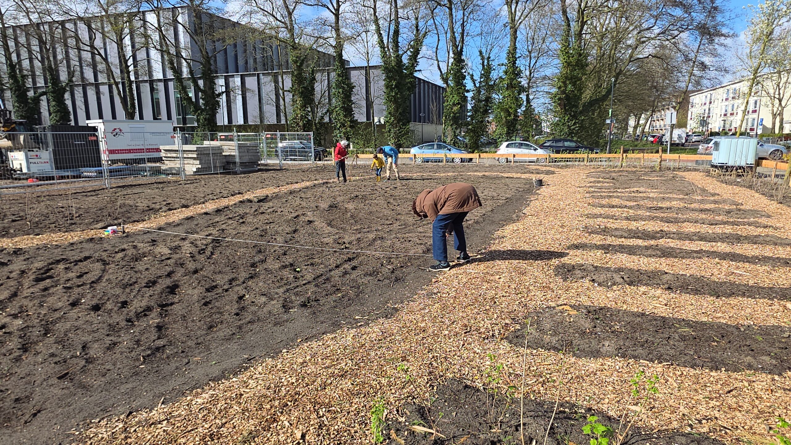 Op de plek waar tot voor kort de Vijf Meihal, het gelijknamige zwembad en Sauna Thermen Vijf Mei stonden, is zaterdag een tijdelijke buurttuin in gebruik genomen.