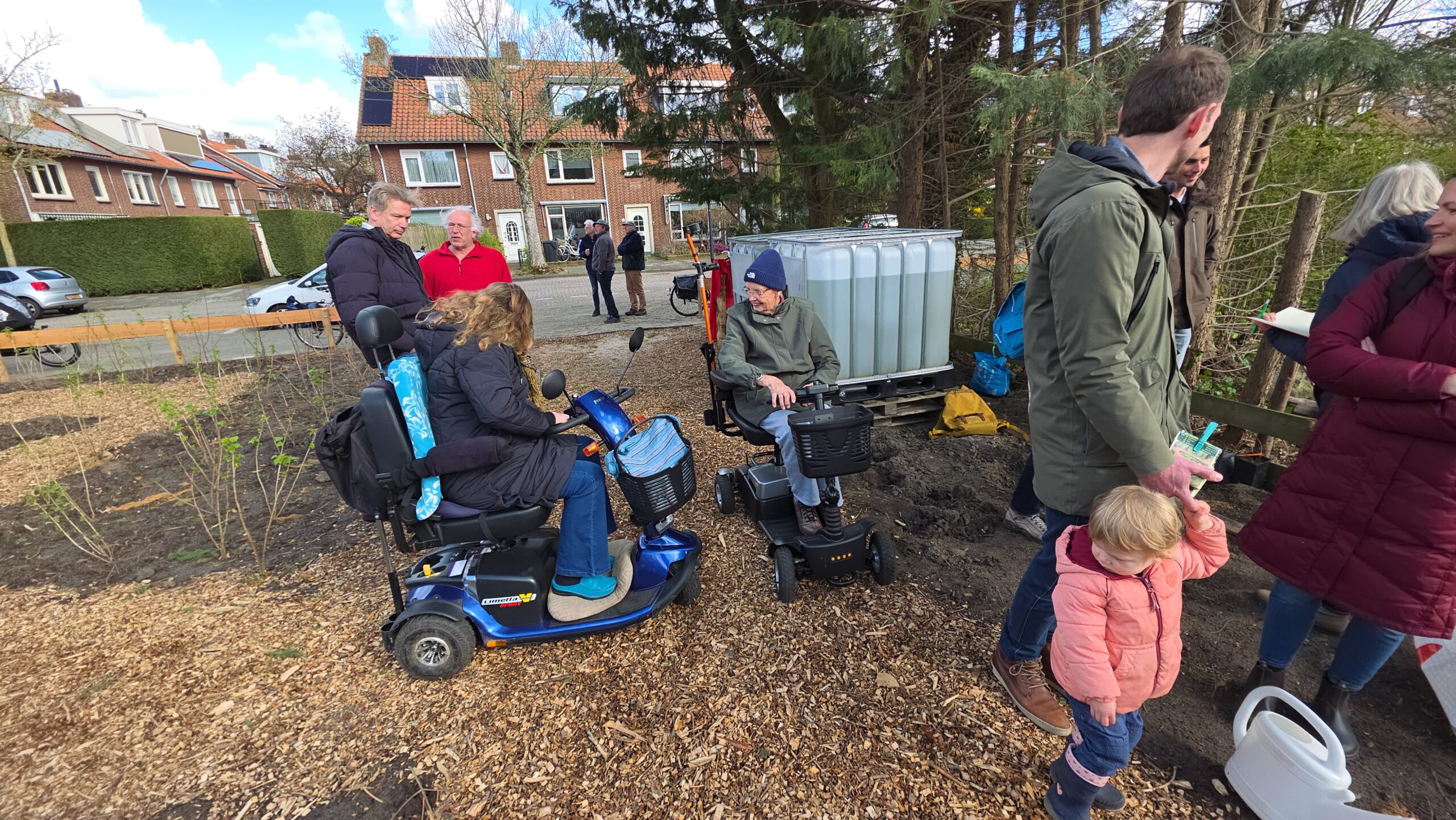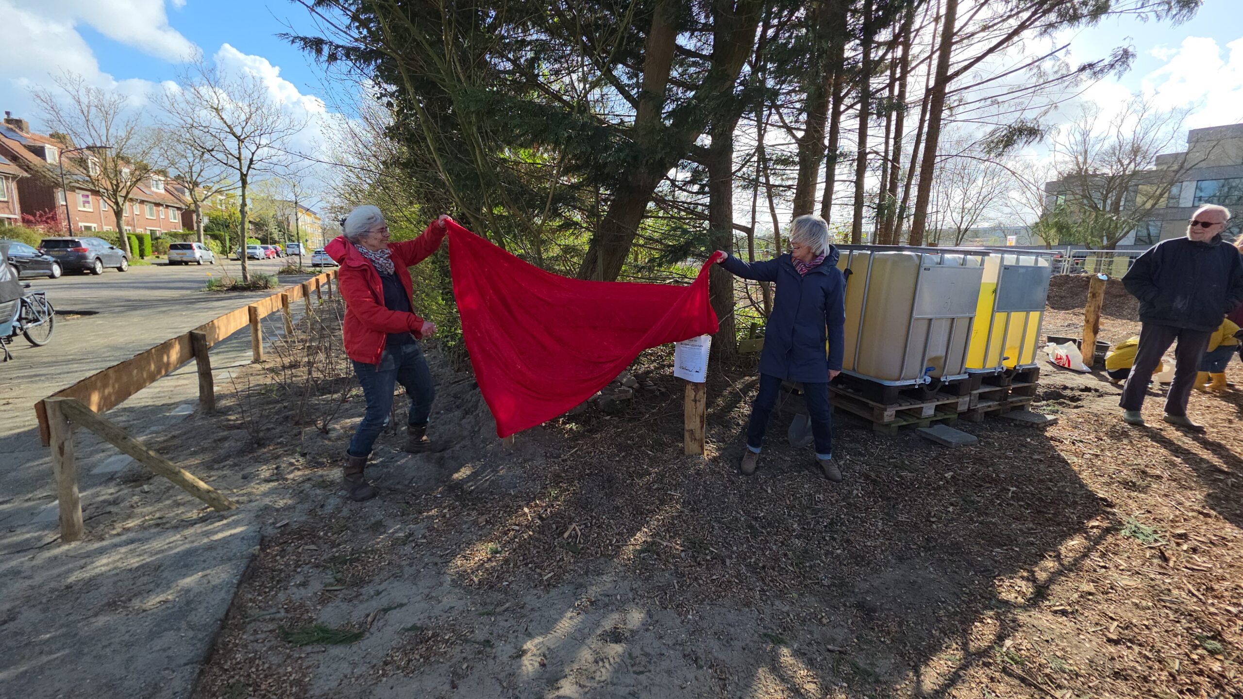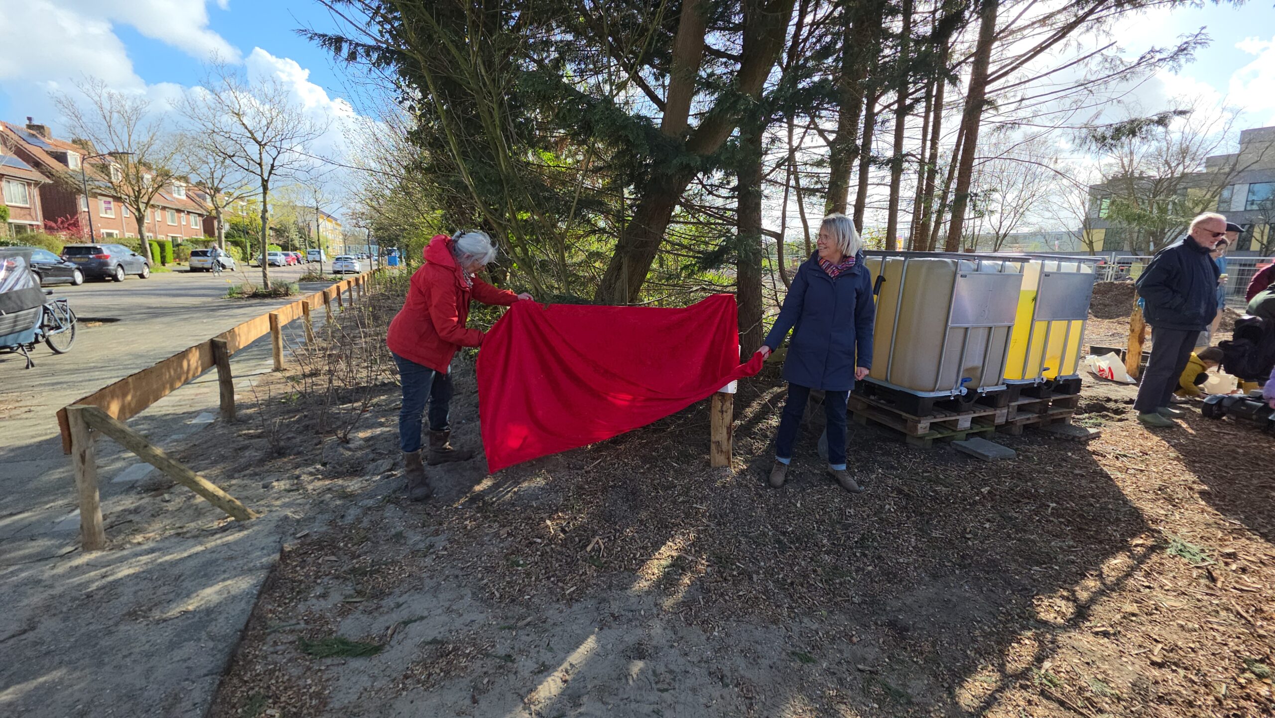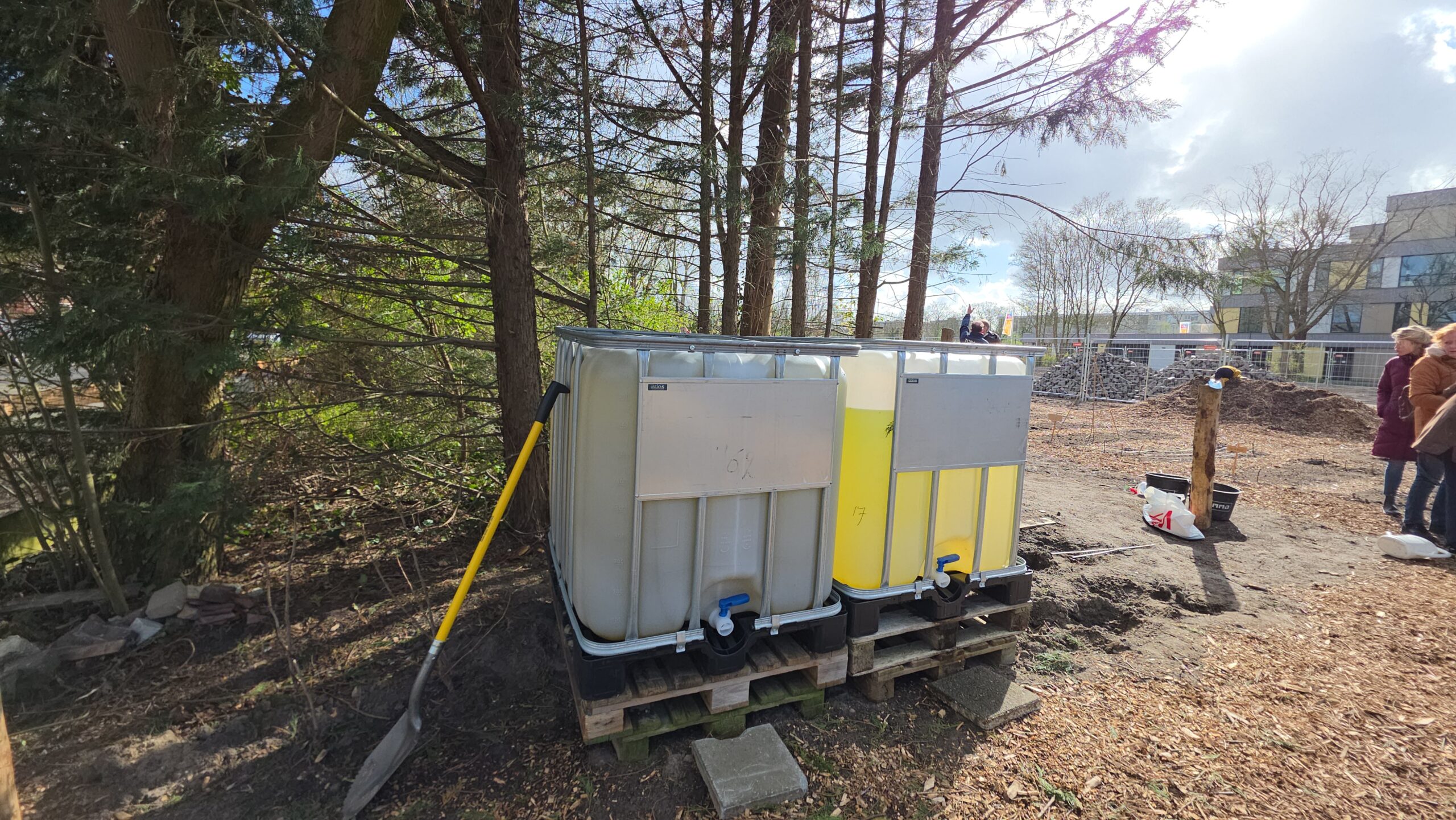 In een hoek van de tuin komt nog een schuurtje voor zaken als tuingereedschap en gieters. De wijk heeft van Fonds 1818 subsidie gekregen om dat soort materialen aan te schaffen. De gemeente Leiden heeft enorme vaten met water neergezet, zodat de nieuwe aanplant niet verdroogt. “Maar het is geloof ik wel slootwater”, lacht Van der Steen. “Dus ik zou het maar niet opdrinken.”