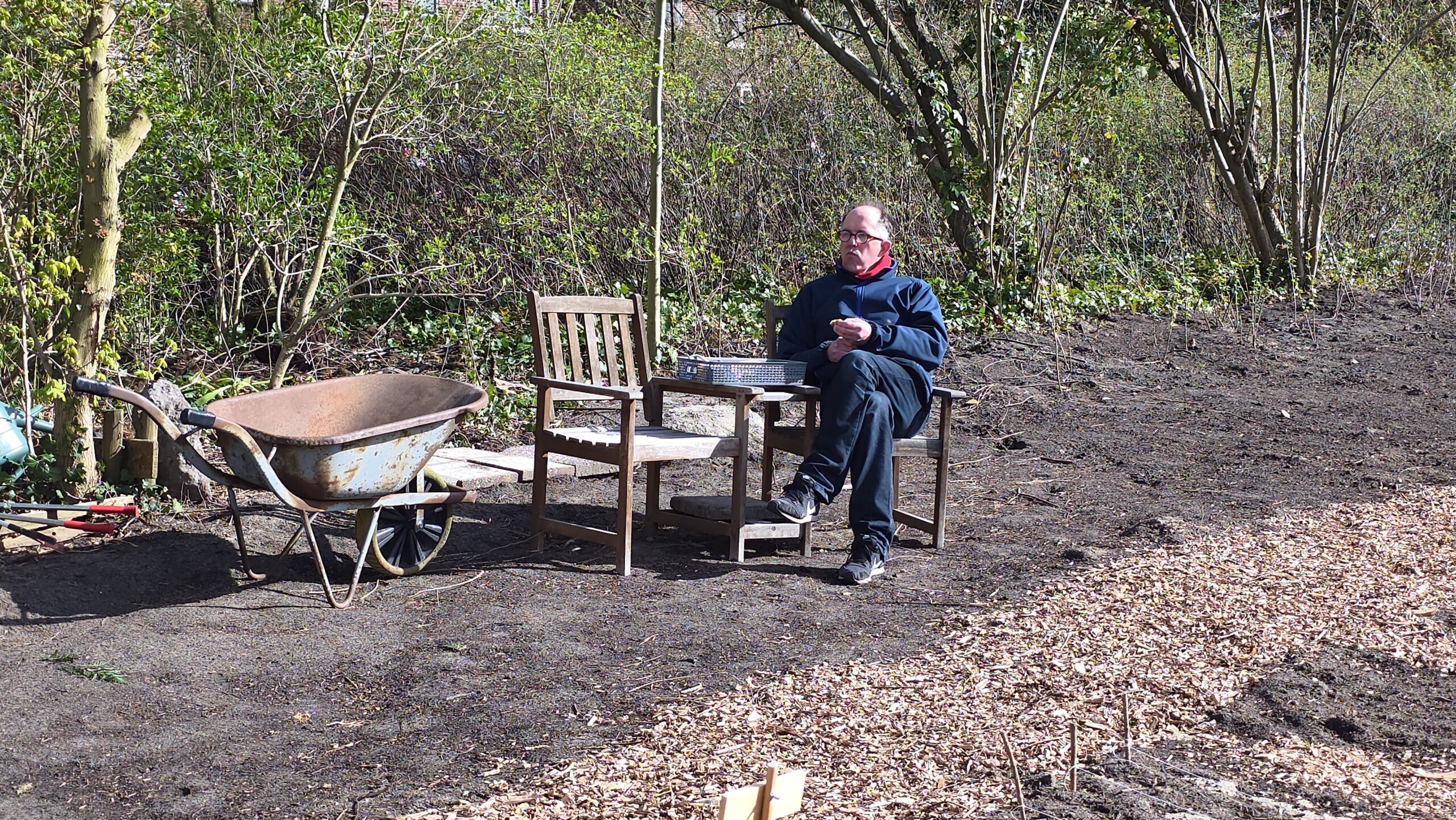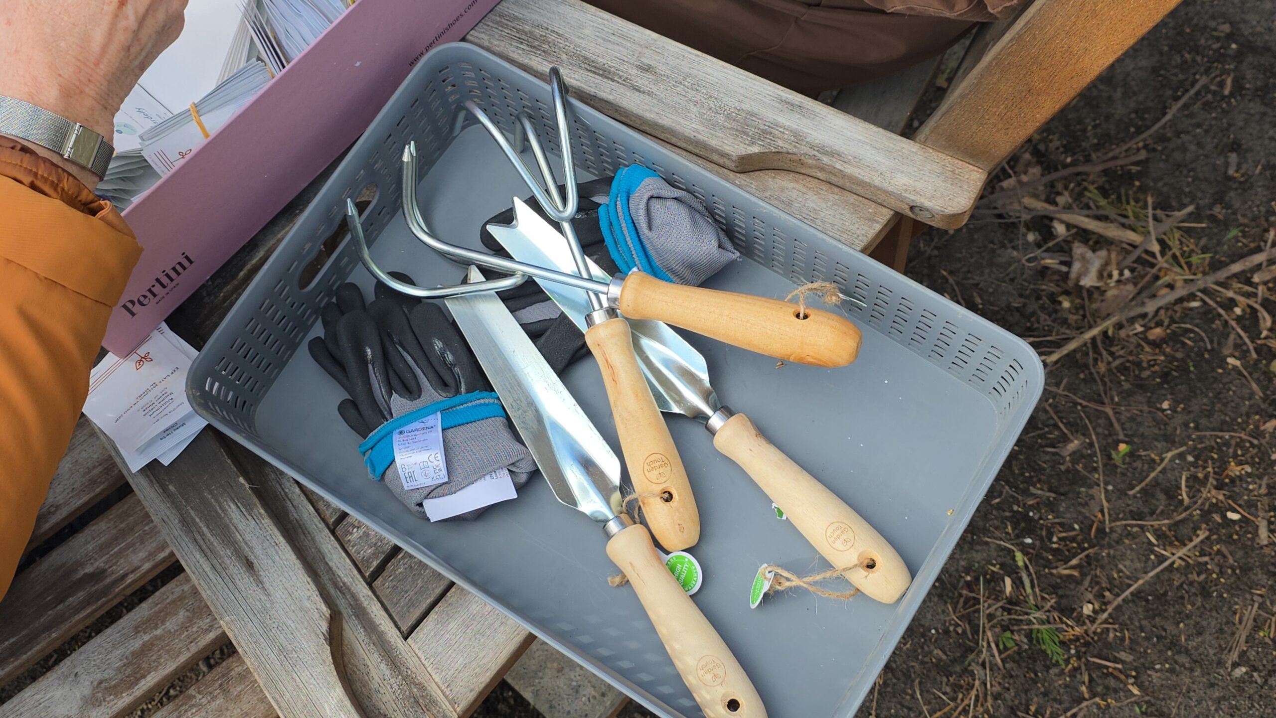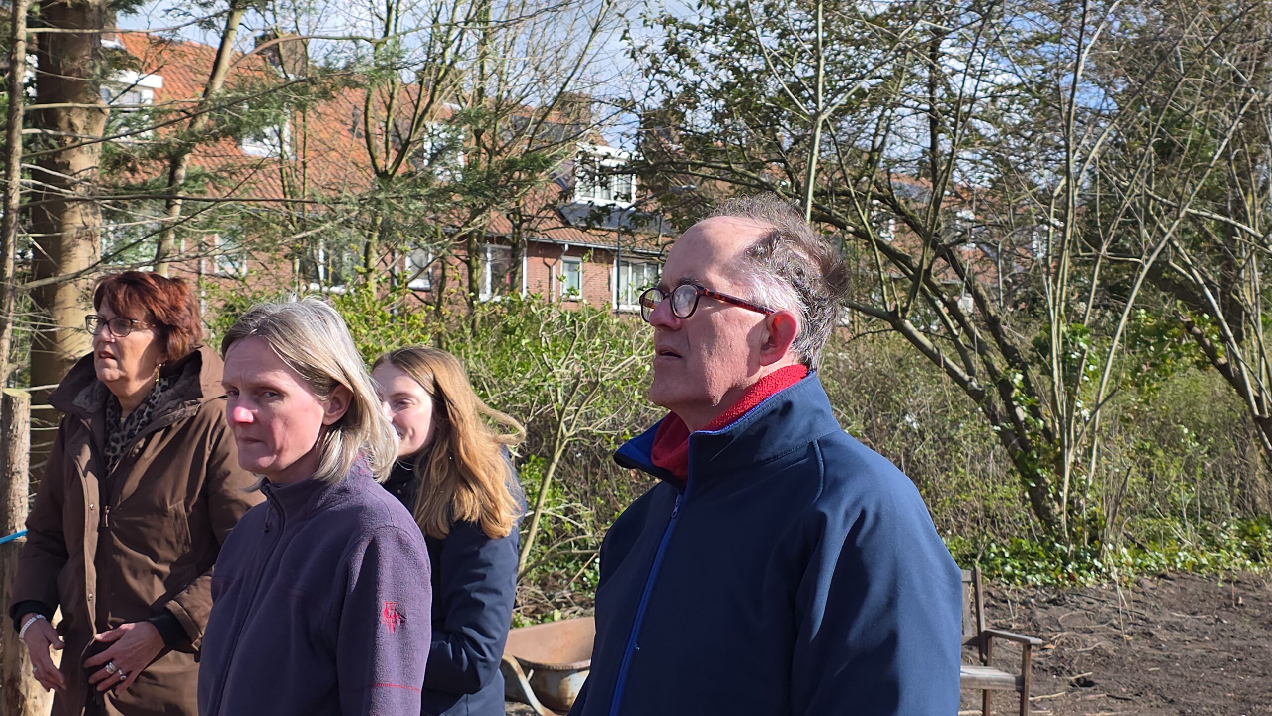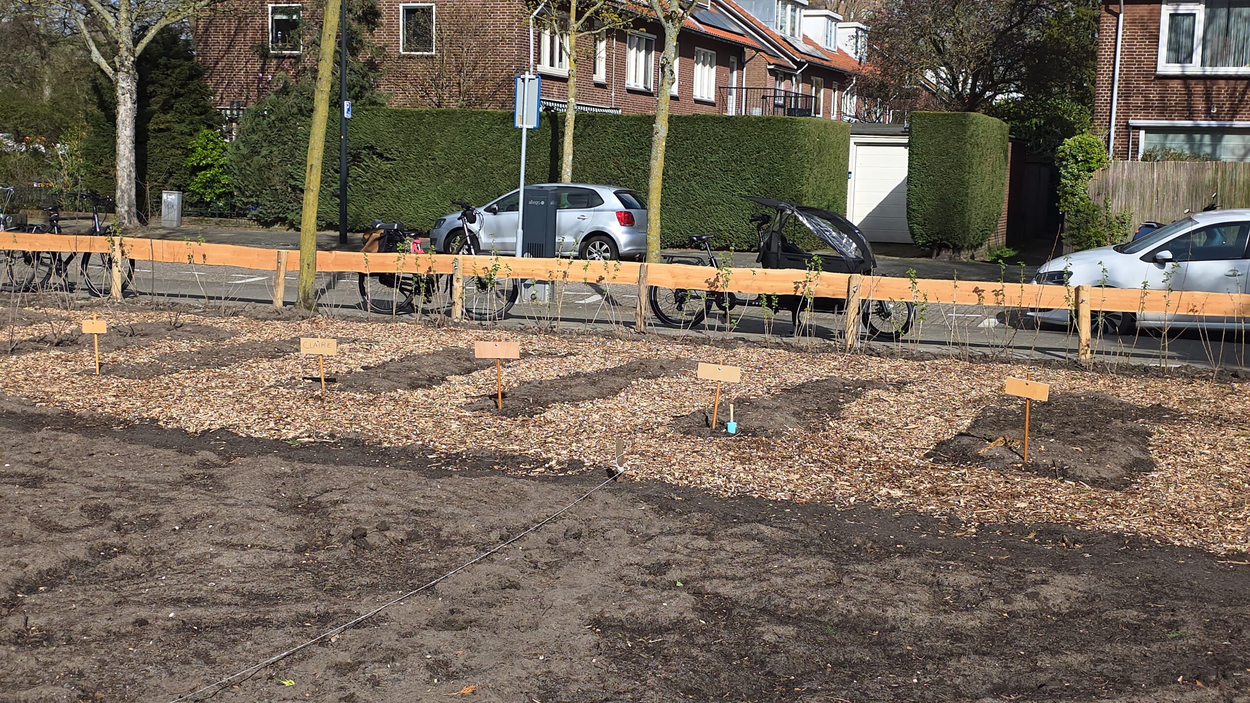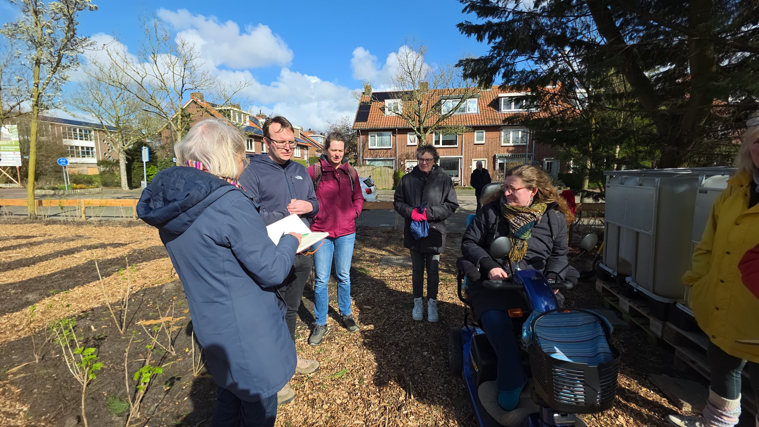 In een hoek van de tuin komt nog een schuurtje voor zaken als tuingereedschap en gieters. De wijk heeft van Fonds 1818 subsidie gekregen om dat soort materialen aan te schaffen. De gemeente Leiden heeft enorme vaten met water neergezet, zodat de nieuwe aanplant niet verdroogt. “Maar het is geloof ik wel slootwater”, lacht Van der Steen. “Dus ik zou het maar niet opdrinken.”