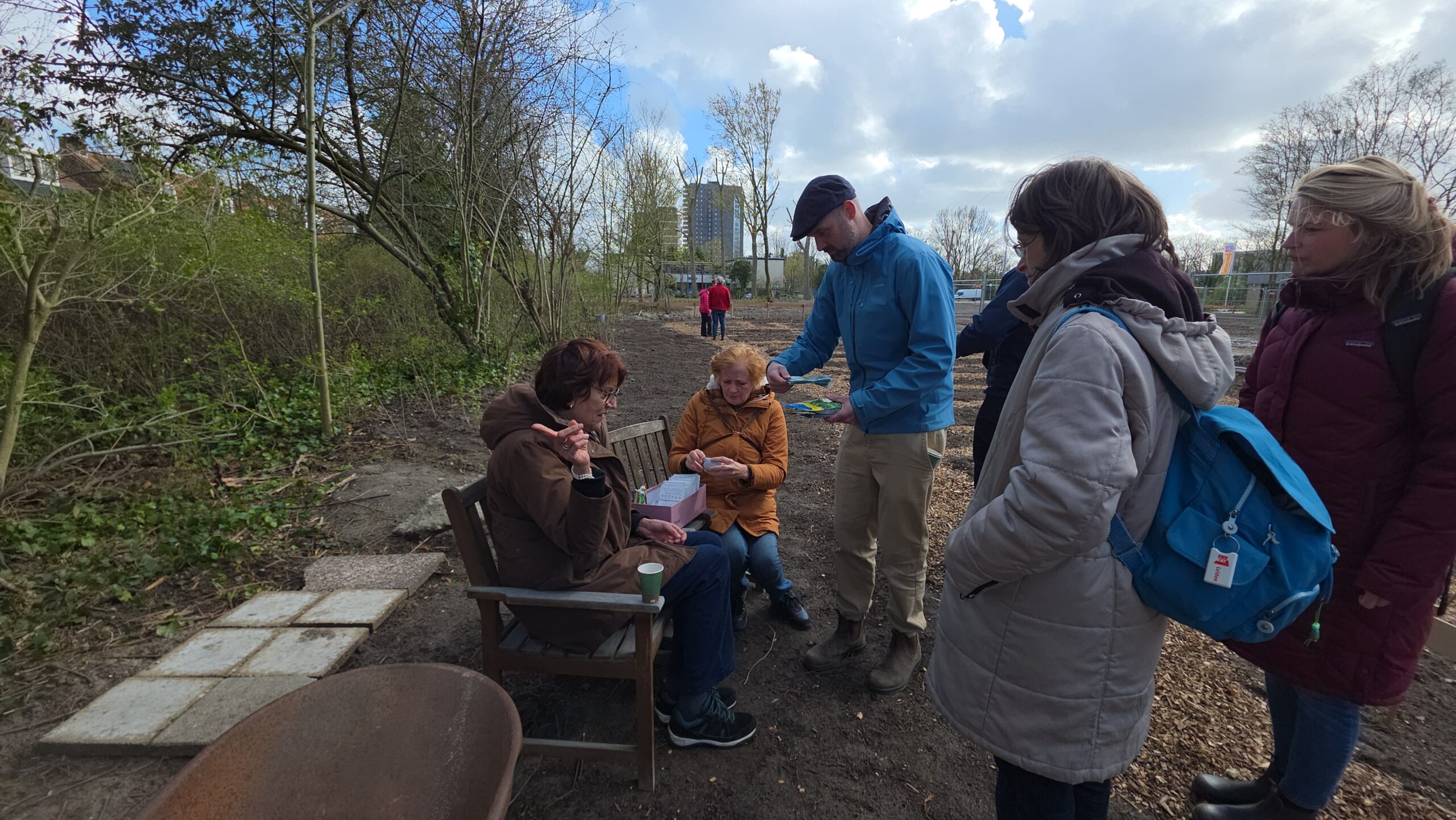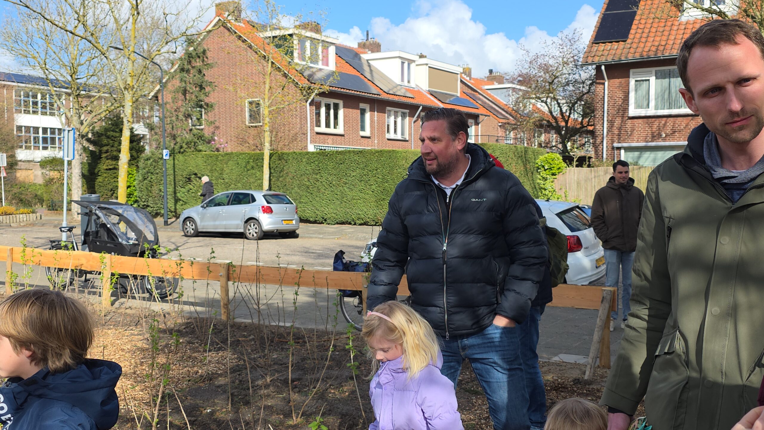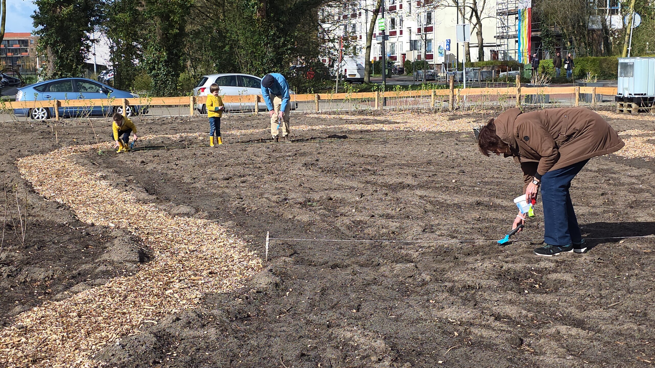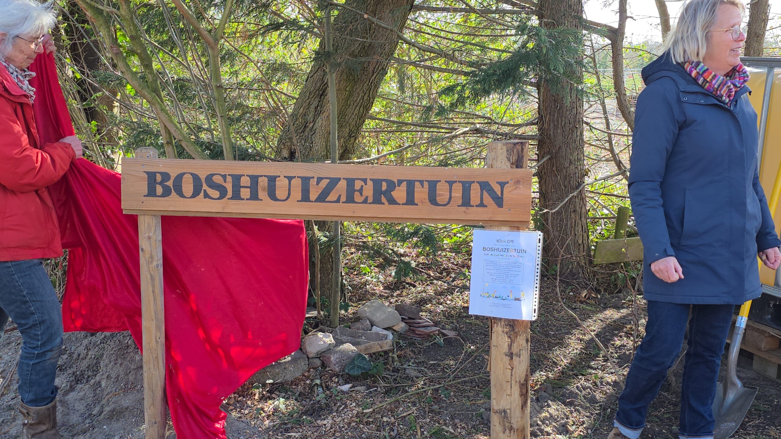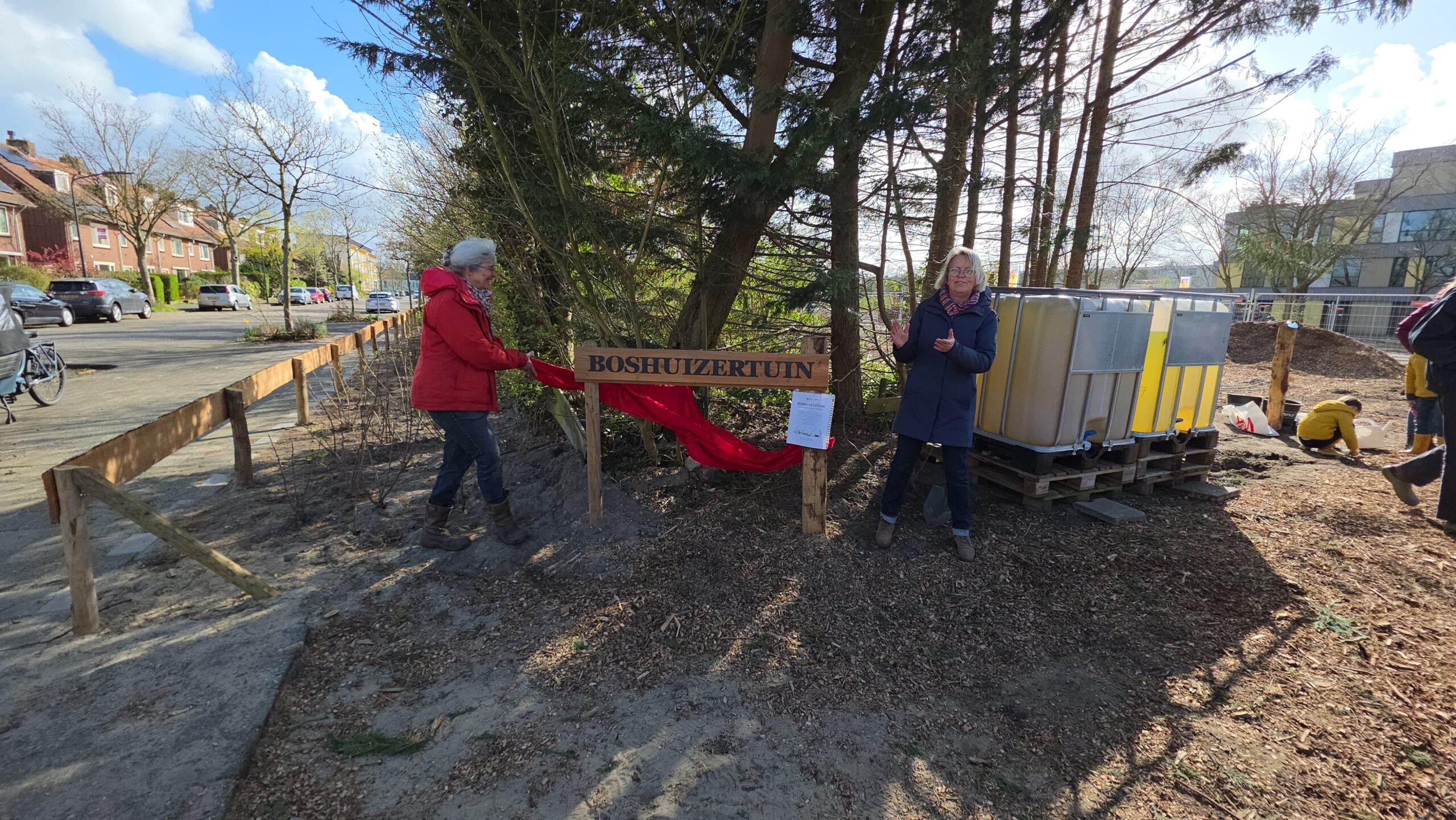 “Maar zet er geen boom neer, want die moet dan over een paar jaar weg en dat is zonde”, zegt Helma van der Steen. Ze is een van de enthousiaste initiatiefnemers van de buurttuin die afgelopen zaterdagmiddag door de buurt in gebruik werd genomen. Dat begon met een officieel momentje: de onthulling van de naam op een door een van de buurtbewoners gemaakt houten bord bij de ingang: Boshuizertuin.