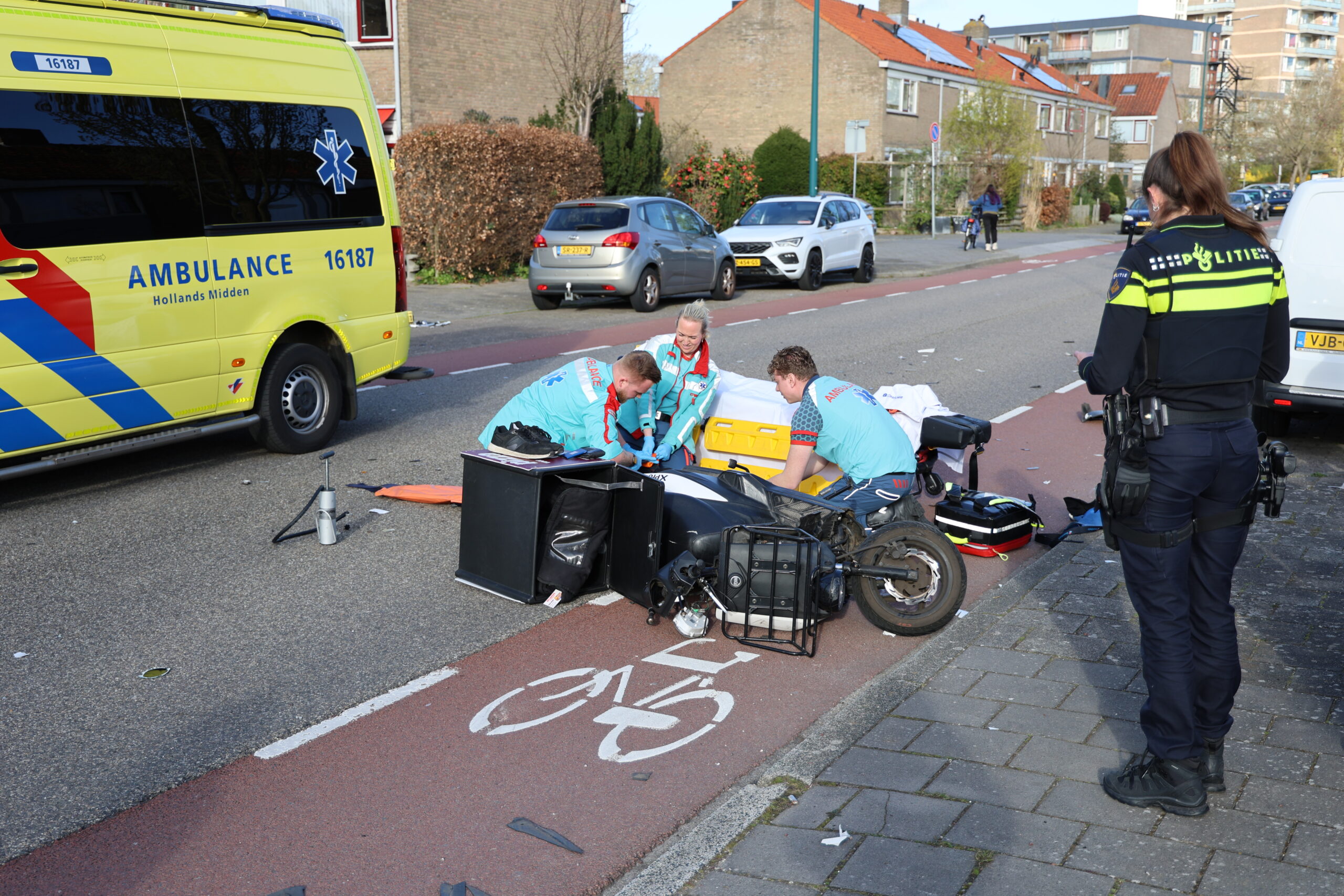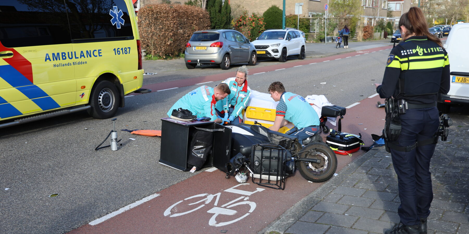Bij een flinke aanrijding tussen een personenauto en een bezorgscooter op de President Kennedylaan in Oegstgeest is de scooterrijder dinsdag aan het einde van de middag gewond geraakt en met spoed overgebracht naar het ziekenhuis.