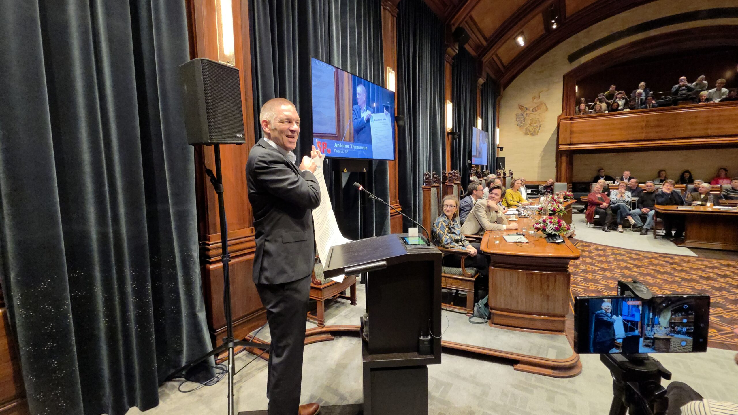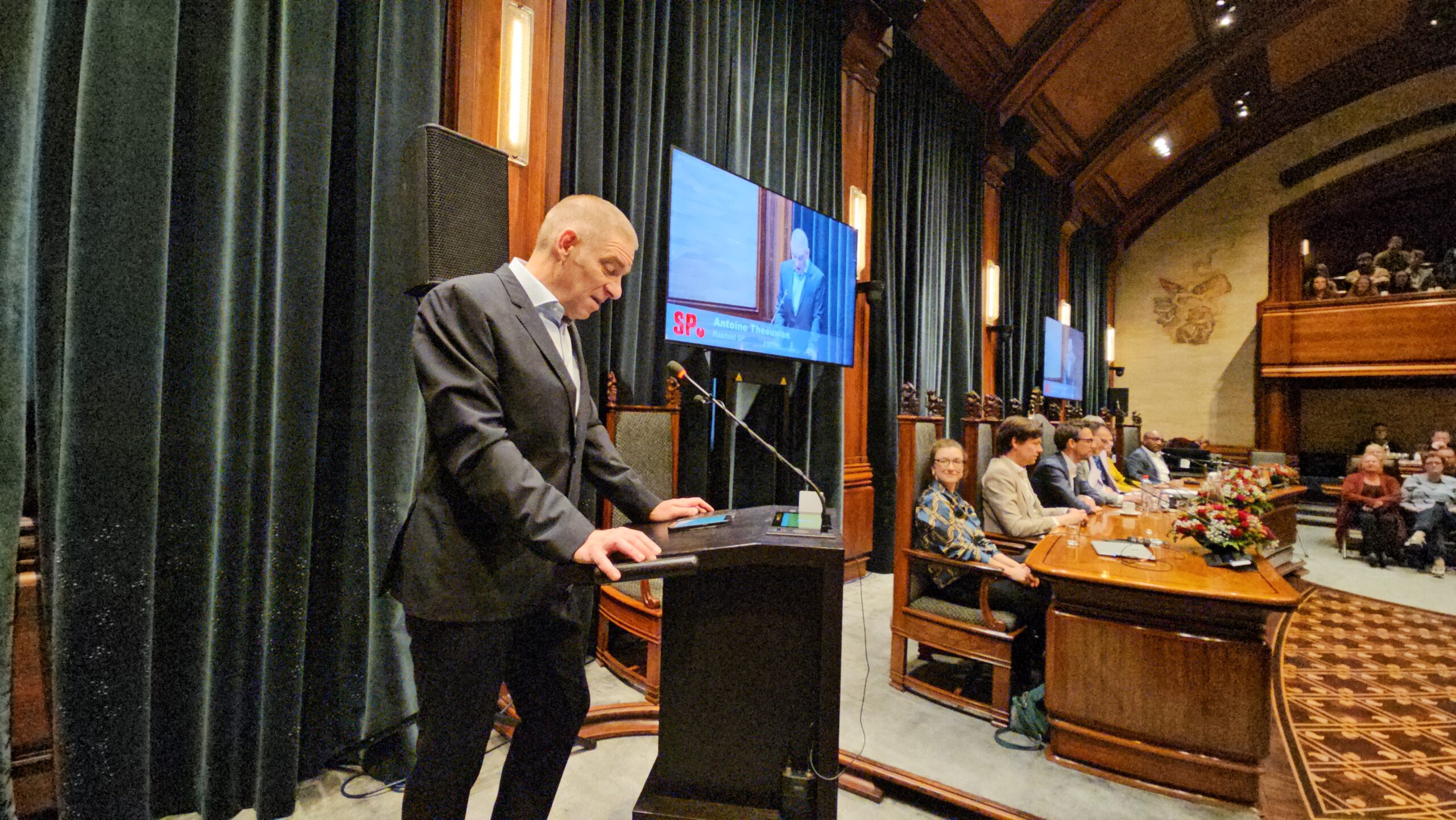Nadat alle mooie woorden waren uitgesproken tikte de klok middernacht aan en was het tijd voor een informeel afscheid in de stadsfoyer. Daar werd ook al flink gespeculeerd over de komende coalitieonderhandelingen in Leiden. Wie gaan er met elkaar om tafel om een nieuw college te vormen. Steeds meer mensen lijken daarbij hun geld te zetten op een samenwerking tussen PRO Leiden, D66 en de VVD. Naar verluidt voelt PRO wel voor het voortzetten van de bestaande samenwerking met het CDA en D66, maar wil die laatste partij wat meer tegenwicht nu PRO twee keer zoveel zetels heeft als D66. Ook vindt D66 al langer dat met name GroenLinks de afgelopen jaren te snel ging met het steeds verder terugdringen van de auto in Leiden. Dat kwam ook wel tot uitdrukking in de verkiezingsuitslag waar ‘Parkeerpartij Sleutelstad’ (PS) in omvang verdubbelde van drie naar zes zetels.
