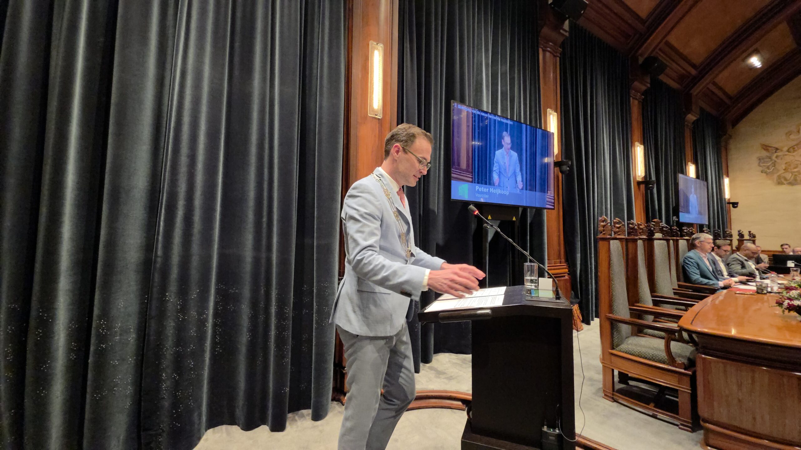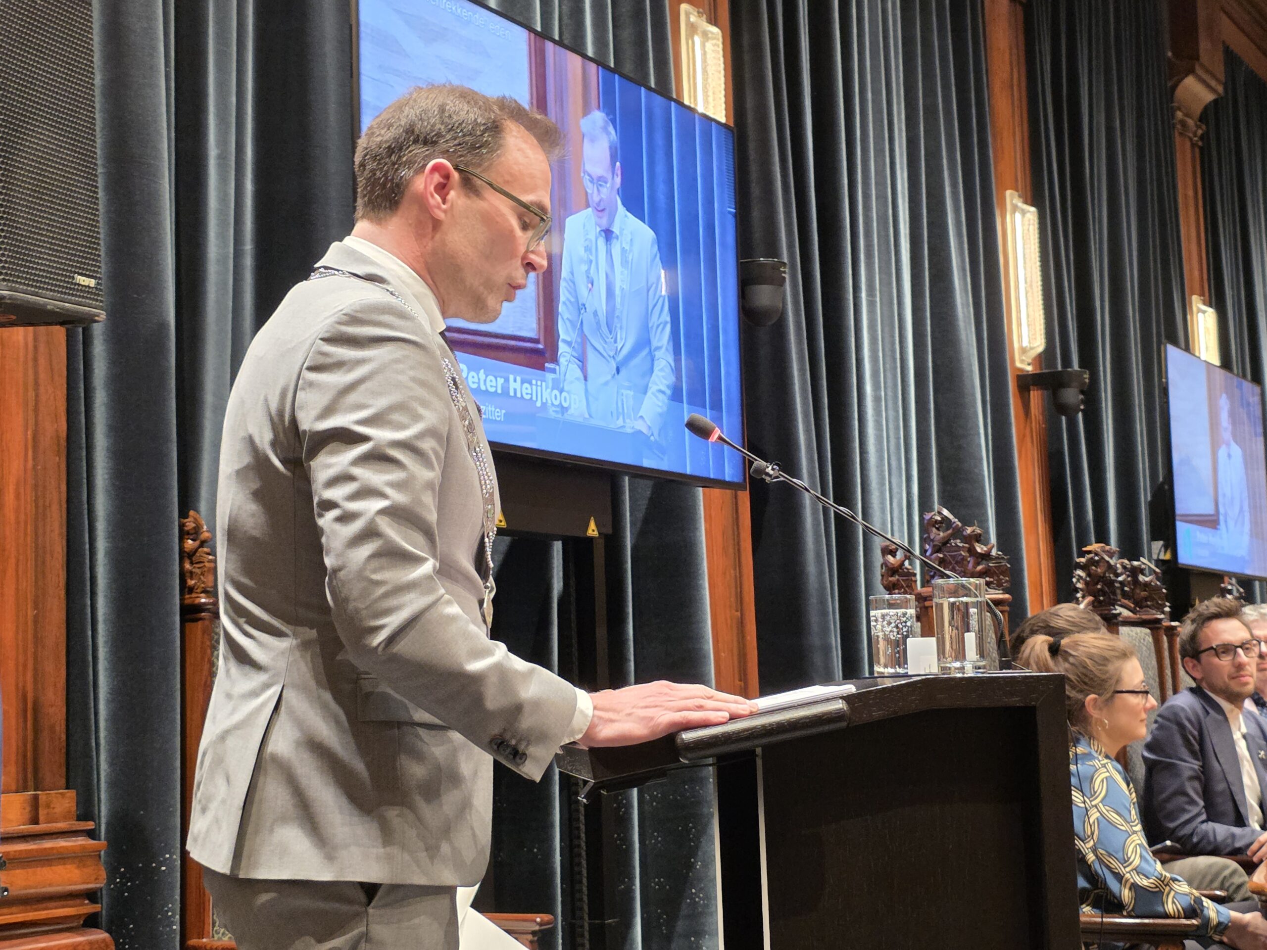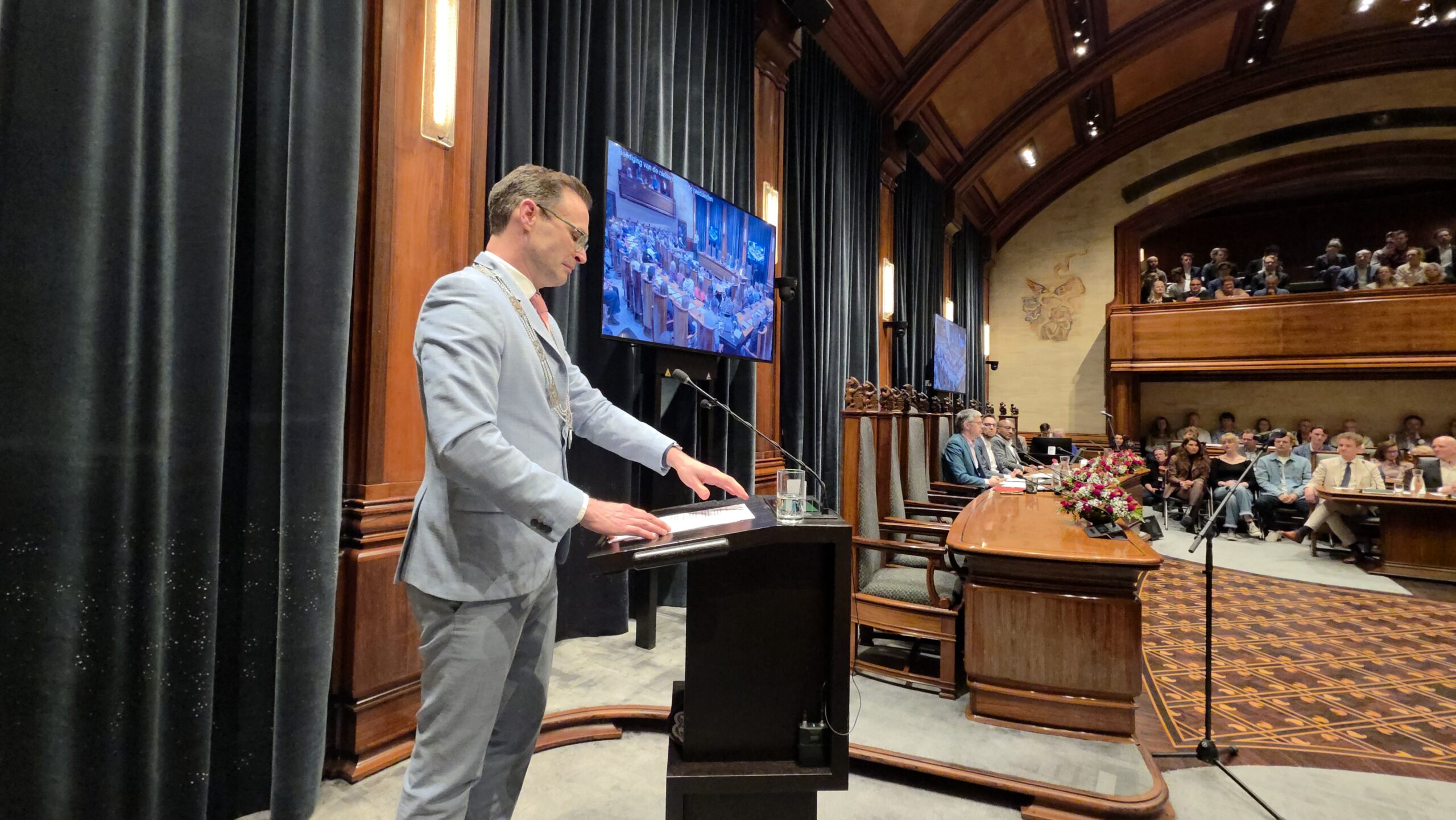 Donderdagavond trad de nieuwe Leidse gemeenteraad aan. Per fractie werden de leden benoemd, nadat ze de eed of de belofte hadden afgelegd. “Zegt u mij zo na”, hield burgemeester Peter Heijkoop de 39 in te zweren raadsleden voor: “Als u de eed aflegt, zegt u ‘Zo waarlijk helpe mij God almachtig’ en bij de belofte luidt de tekst: ‘Dat verklaar en beloof ik’.”
