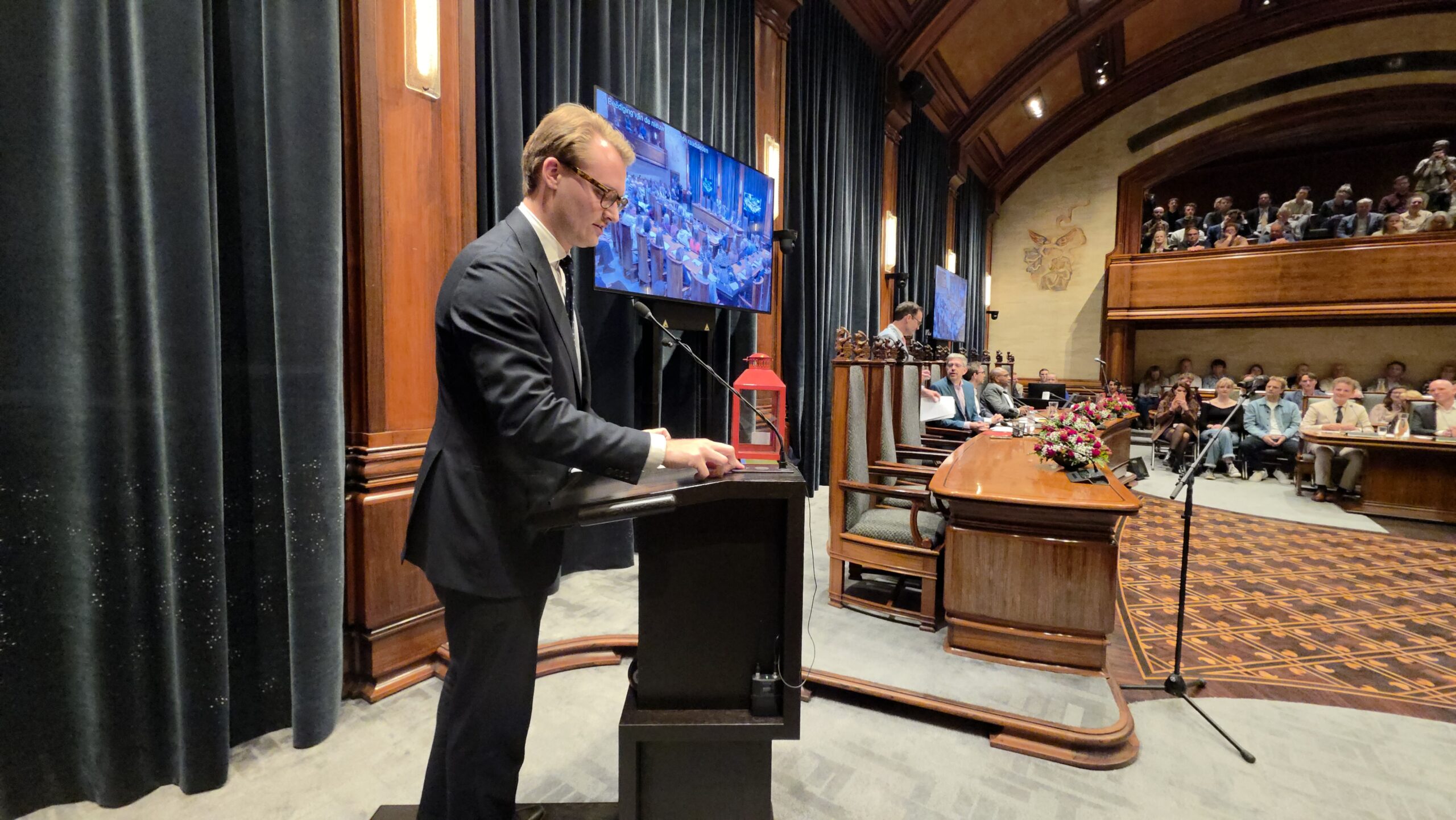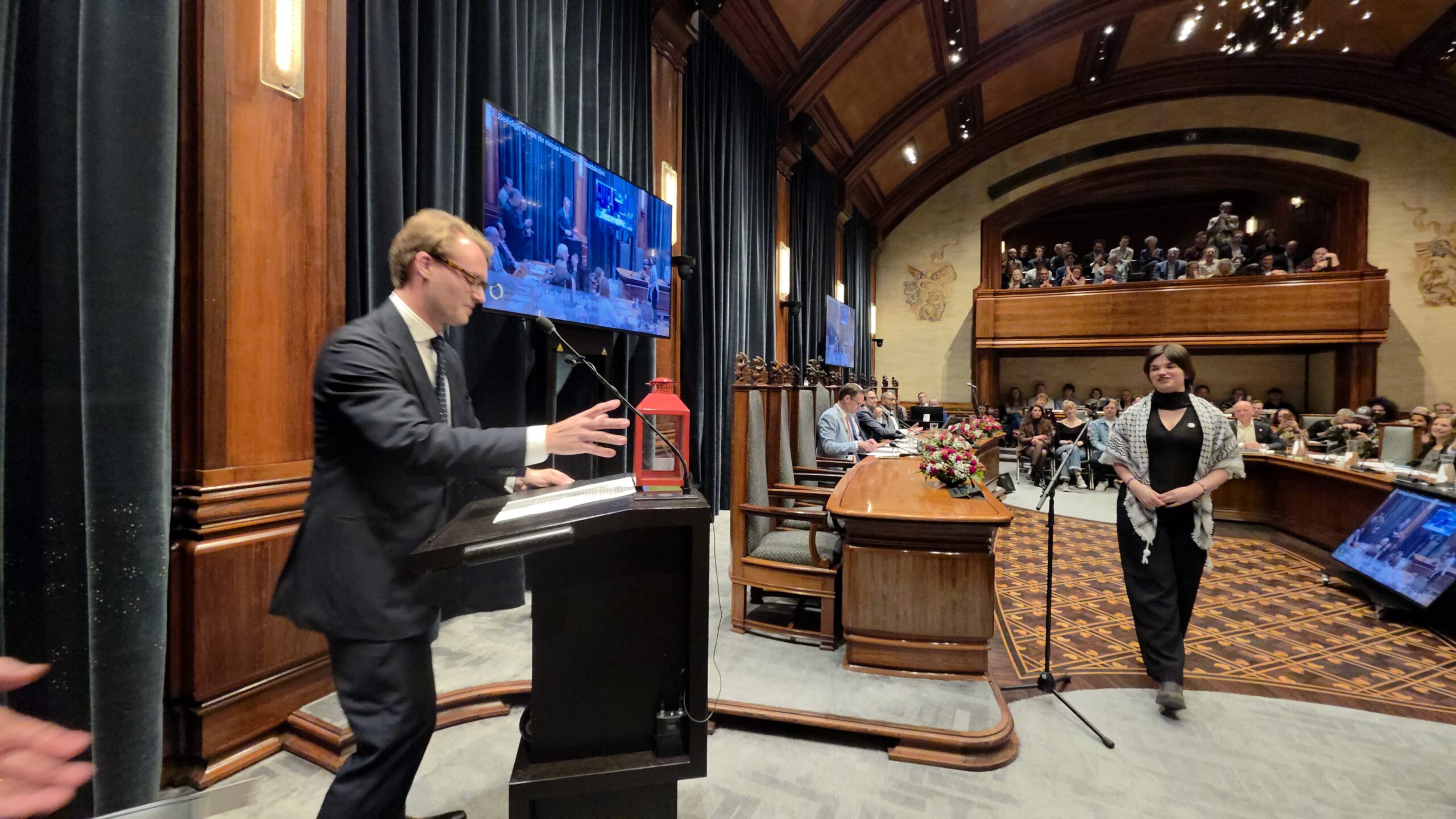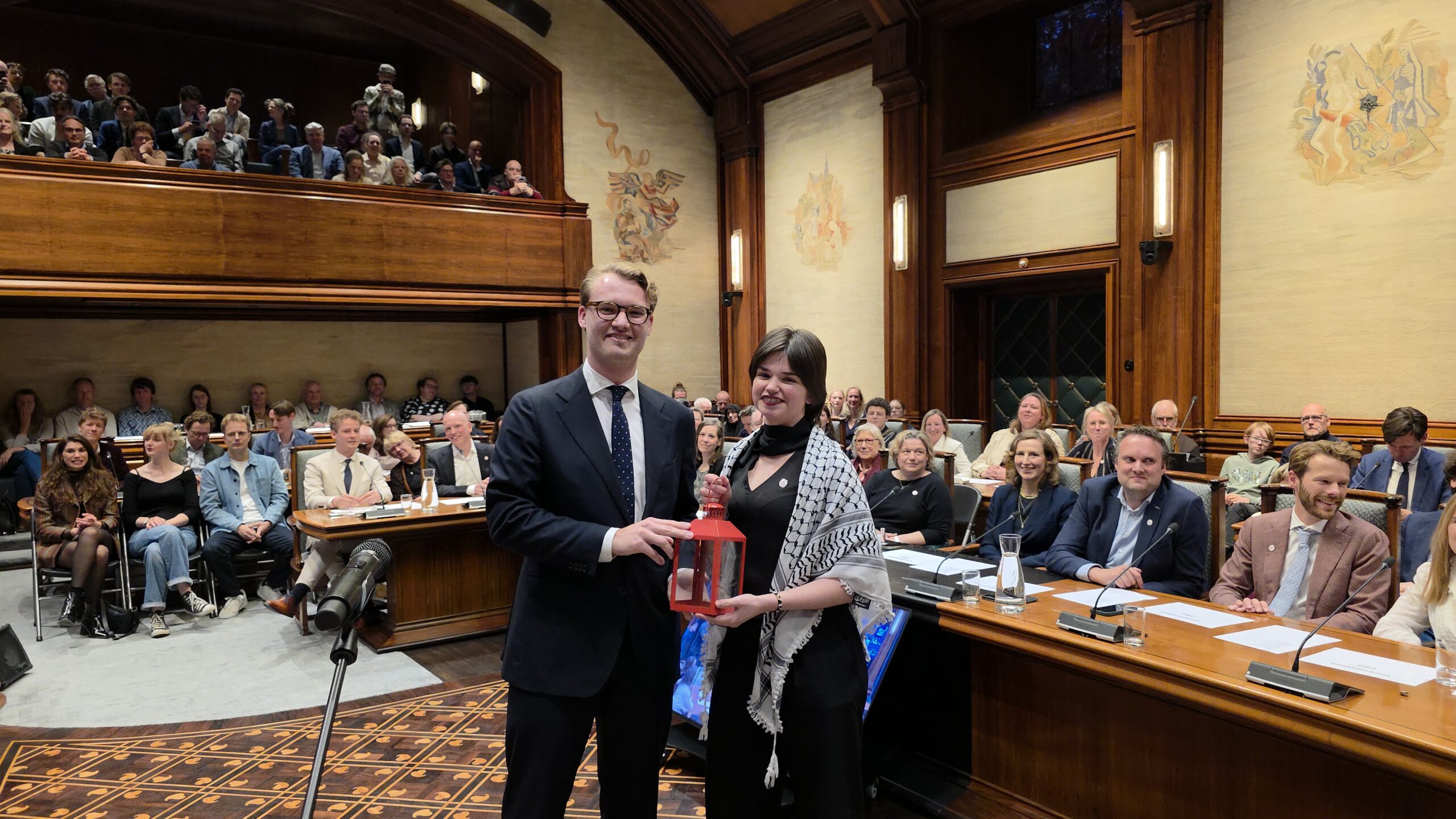 De installatieraad werd vrolijk afgesloten met twee tradities. Mitchell Wiegand Bruss die vier jaar geleden namens Studenten voor Leiden (SVL) als jongste raadslid werd benoemd, kreeg daarbij de ‘Rode Lantaarn’ overhandigd. Nu was het zijn beurt om hem door te geven aan het raadslid dat dit keer het jongste is. Dat is Nina Joziasse van de Partij voor de Dieren. Voordat burgemeester Heijkoop de bijzondere raadsvergadering met een klap van de hamer sloot, werd nog gezamenlijk het Leidse volkslied ‘Leiden, Stad van mijn Hart’ gezongen.