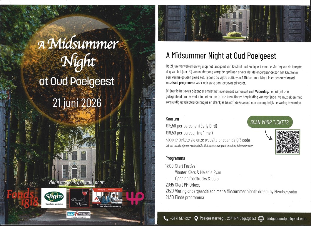 De jubileumeditie van ‘A Midsummer Night at Oud Poelgeest’ in Oegstgeest belooft volgens de organisatoren dit jaar nog uitgebreider en sfeervoller dan andere jaren te worden.
