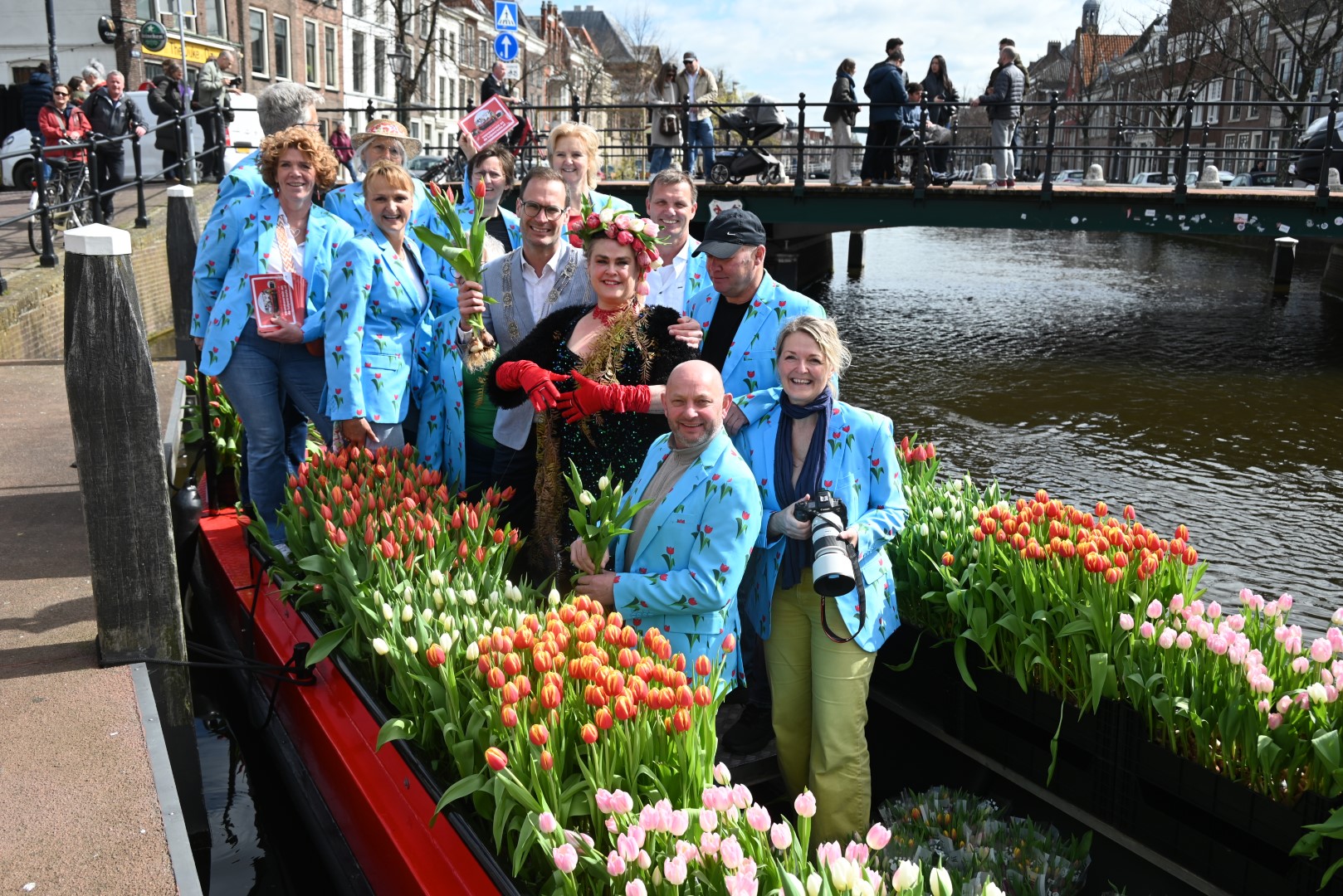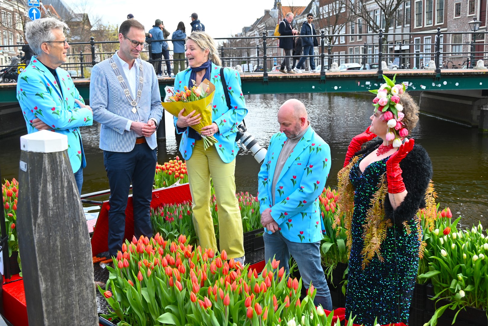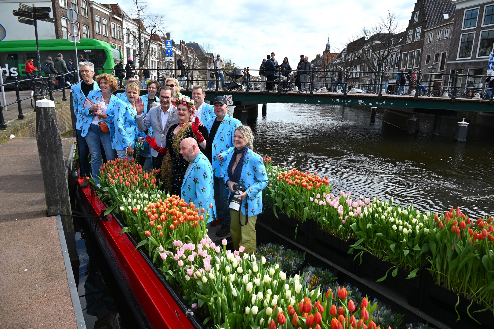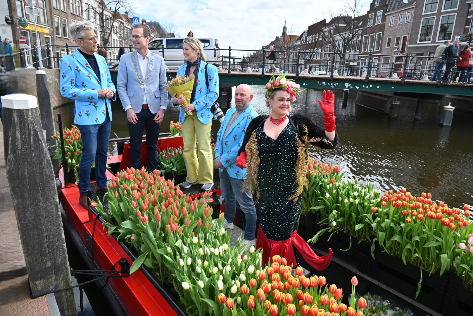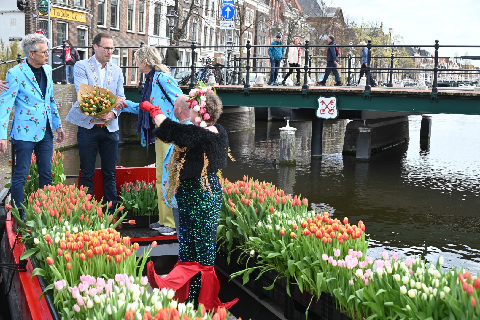 De Tulpenboot legde aan bij de Beestenmarkt, waar Burgemeester Peter Heijkoop de Veenmeermin welkom heette en niet alleen het eerste bosje tulpen in ontvangst nam, maar ook het eerste exemplaar van de puzzel ‘Leidse Tulpendag’. Uitgegeven door uitgeverij Puzzelstreken. Op de puzzel staan diverse bekende Leidenaren zoals; Rembrandt, Armin van Buuren, Peter Labrujere en Barry Badpak. Nadat Barry Badpak de puzzel had onthuld, voer de boot verder het centrum in en deelden hostessen de bosjes tulpen uit.