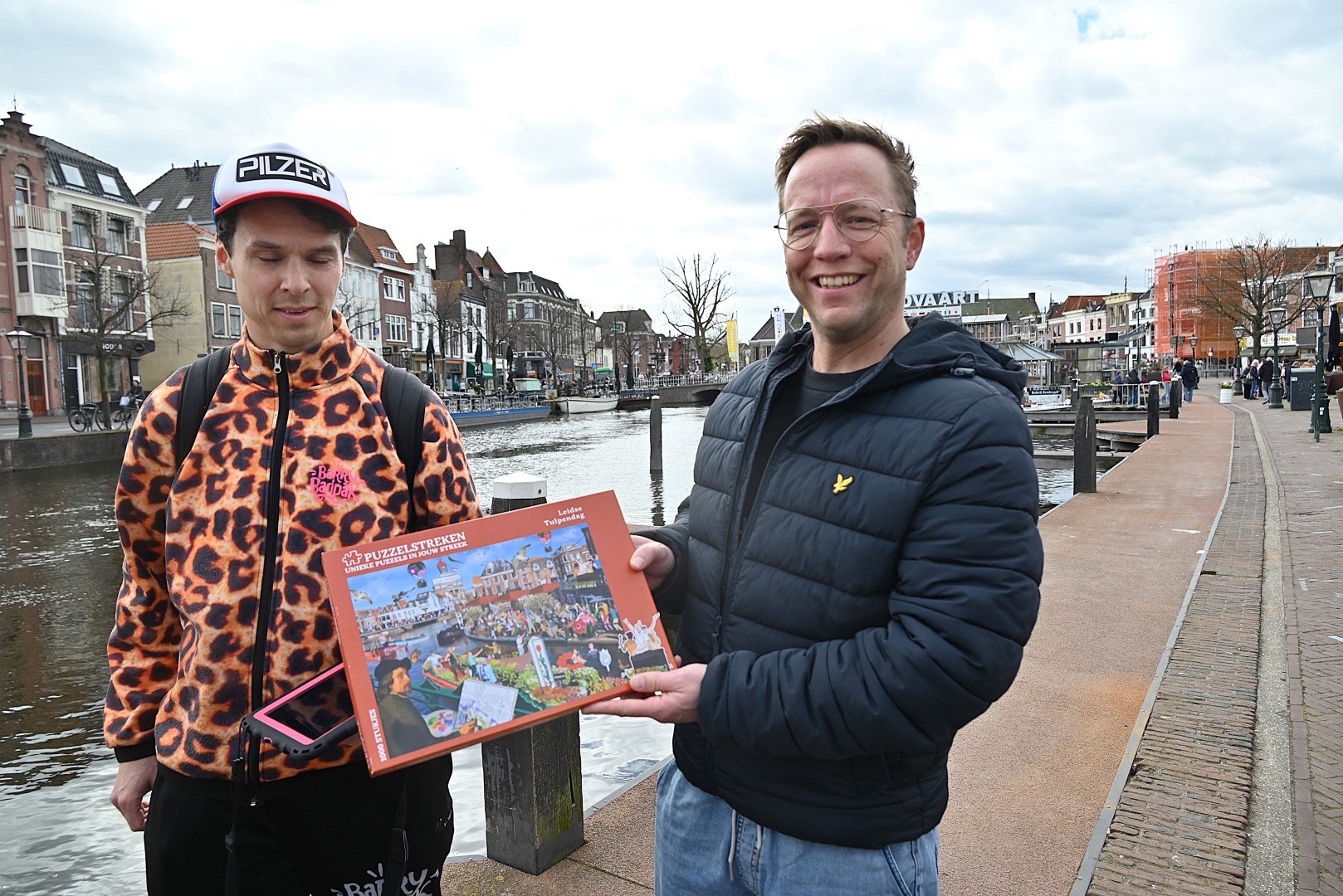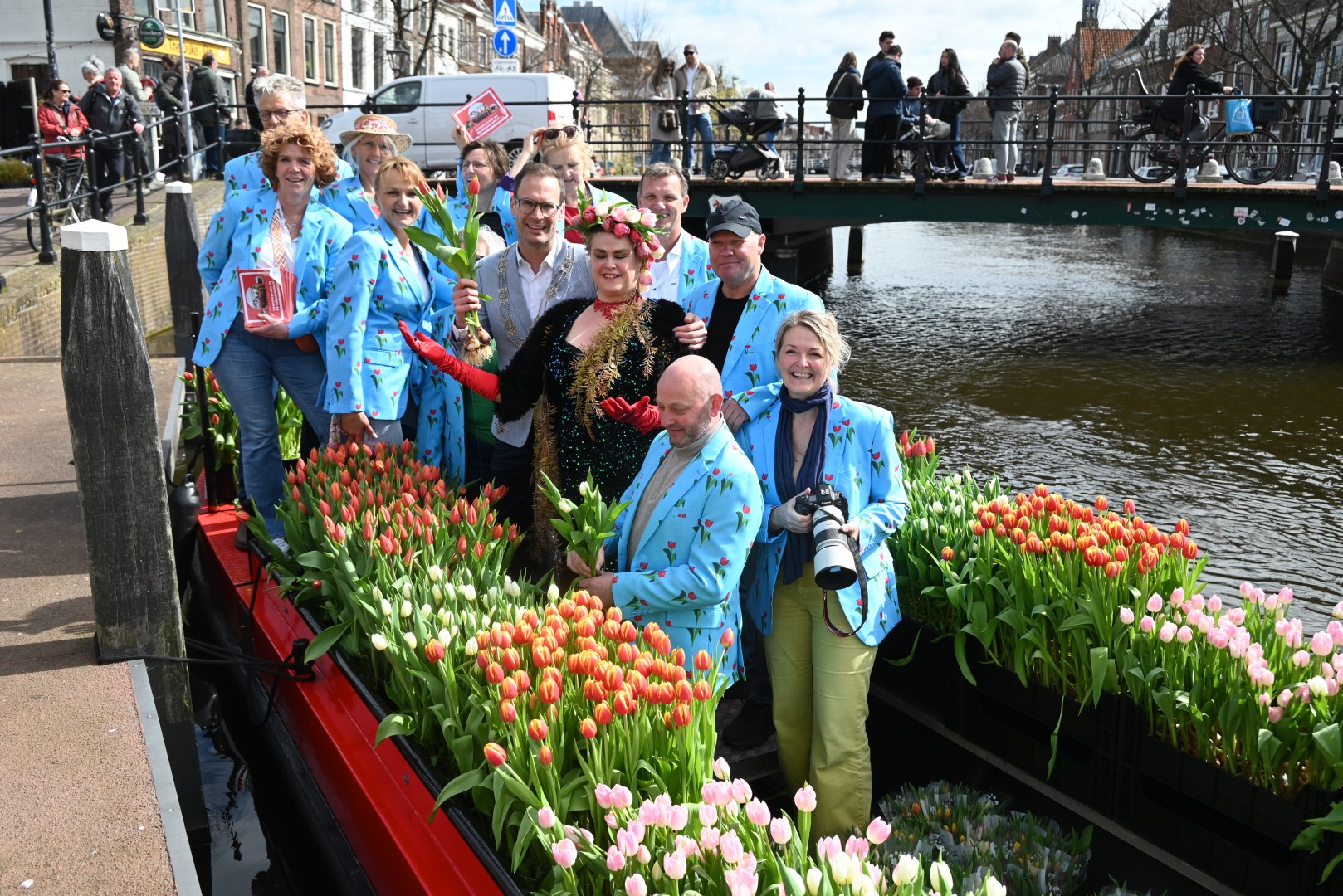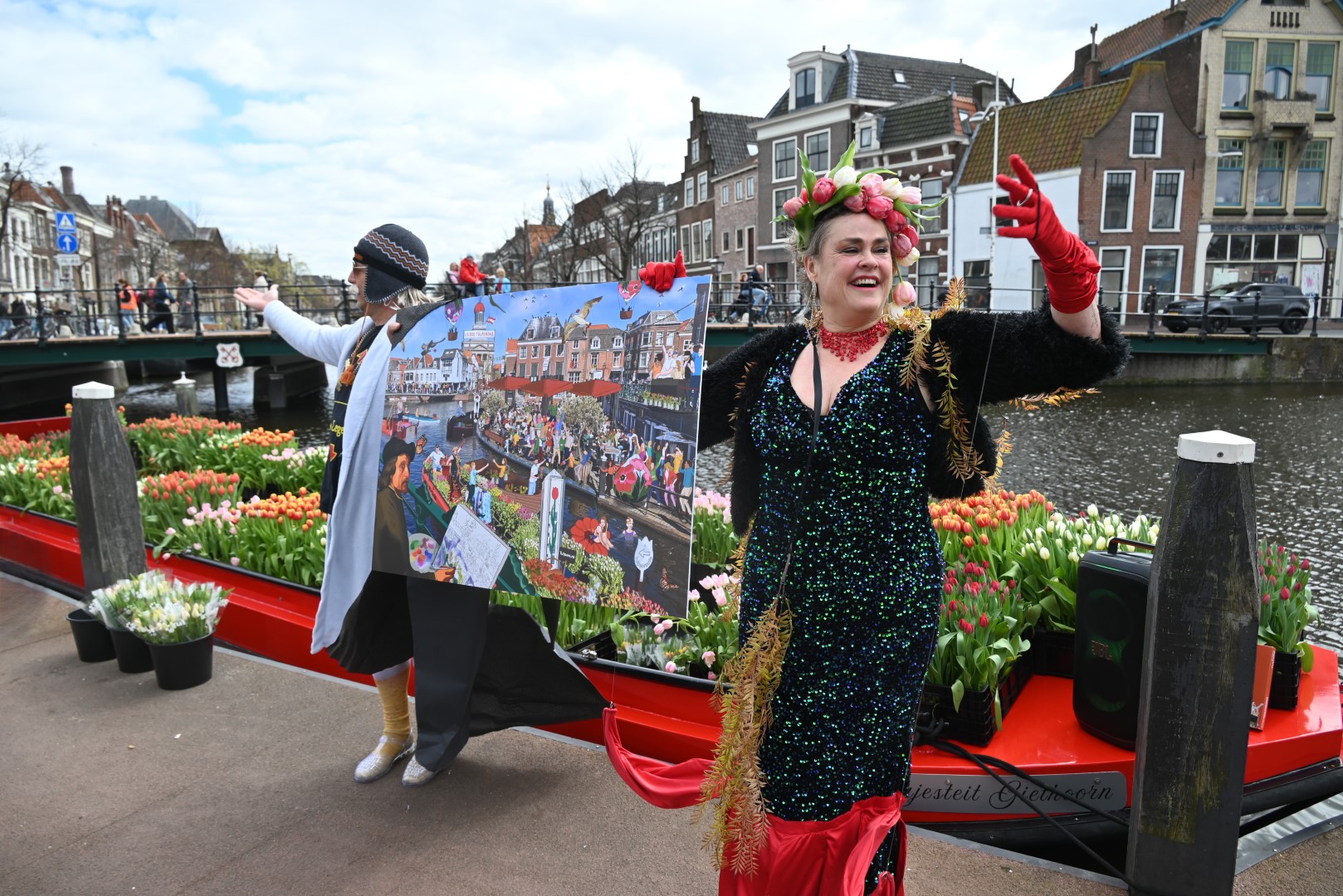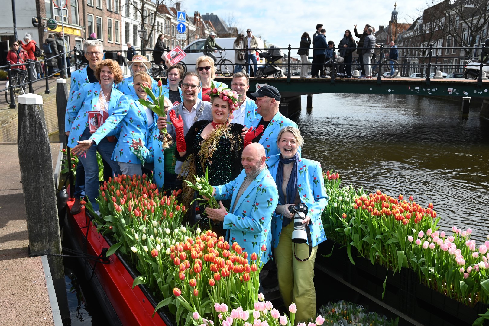 De Tulpenboot legde aan bij de Beestenmarkt, waar Burgemeester Peter Heijkoop de Veenmeermin welkom heette en niet alleen het eerste bosje tulpen in ontvangst nam, maar ook het eerste exemplaar van de puzzel ‘Leidse Tulpendag’. Uitgegeven door uitgeverij Puzzelstreken. Op de puzzel staan diverse bekende Leidenaren zoals; Rembrandt, Armin van Buuren, Peter Labrujere en Barry Badpak. Nadat Barry Badpak de puzzel had onthuld, voer de boot verder het centrum in en deelden hostessen de bosjes tulpen uit.