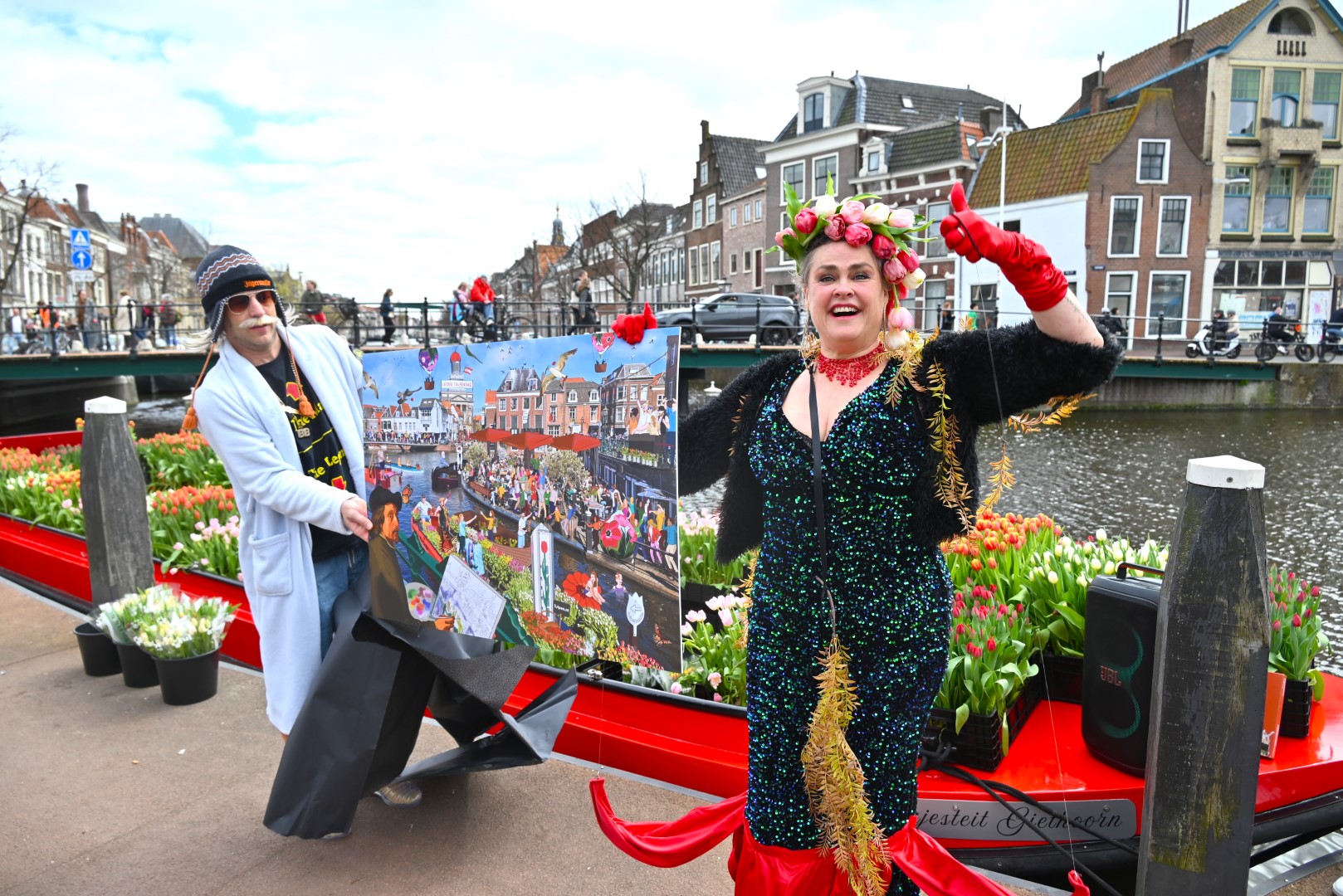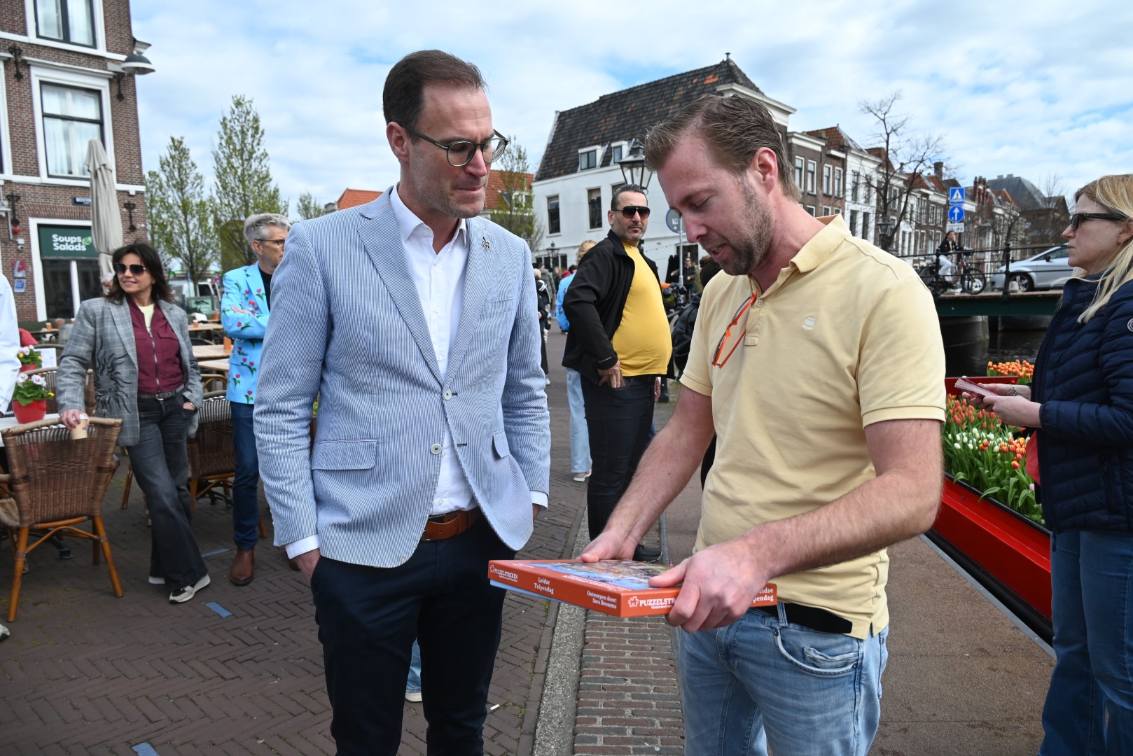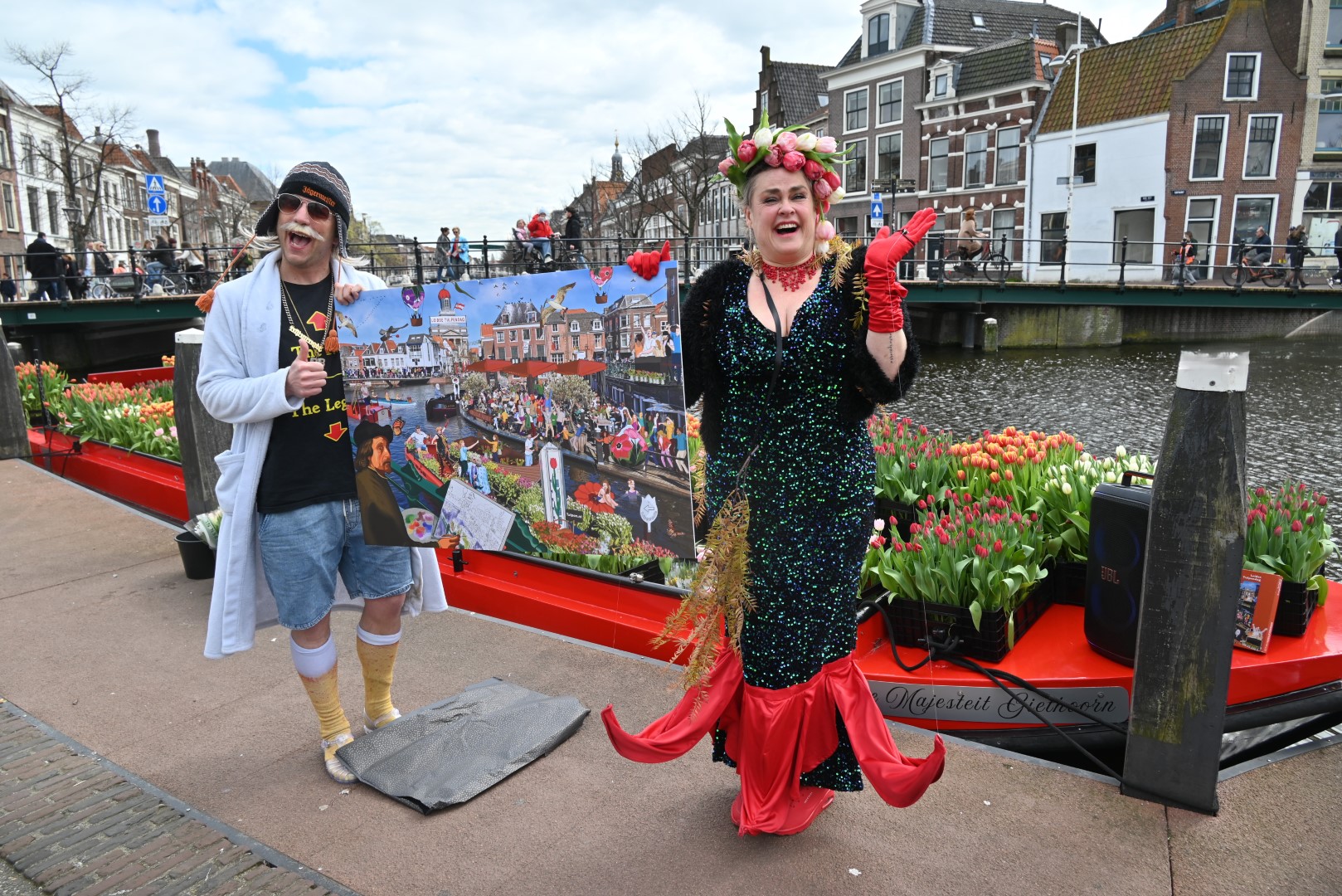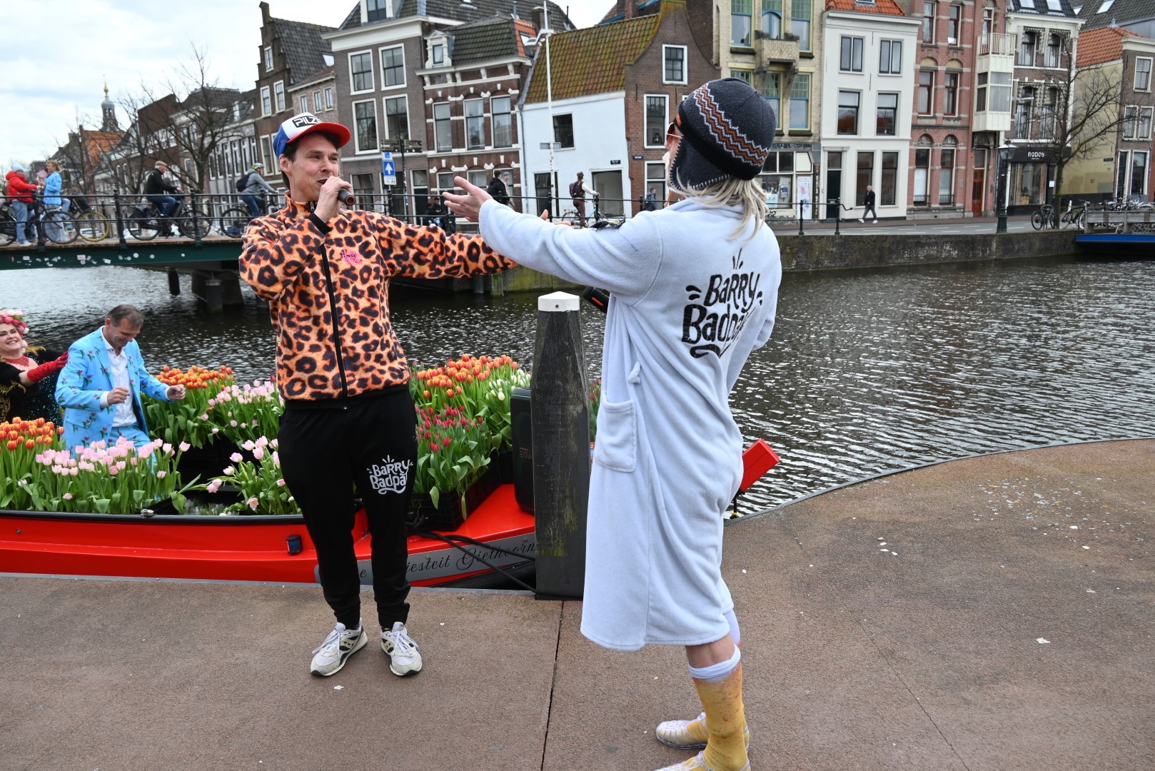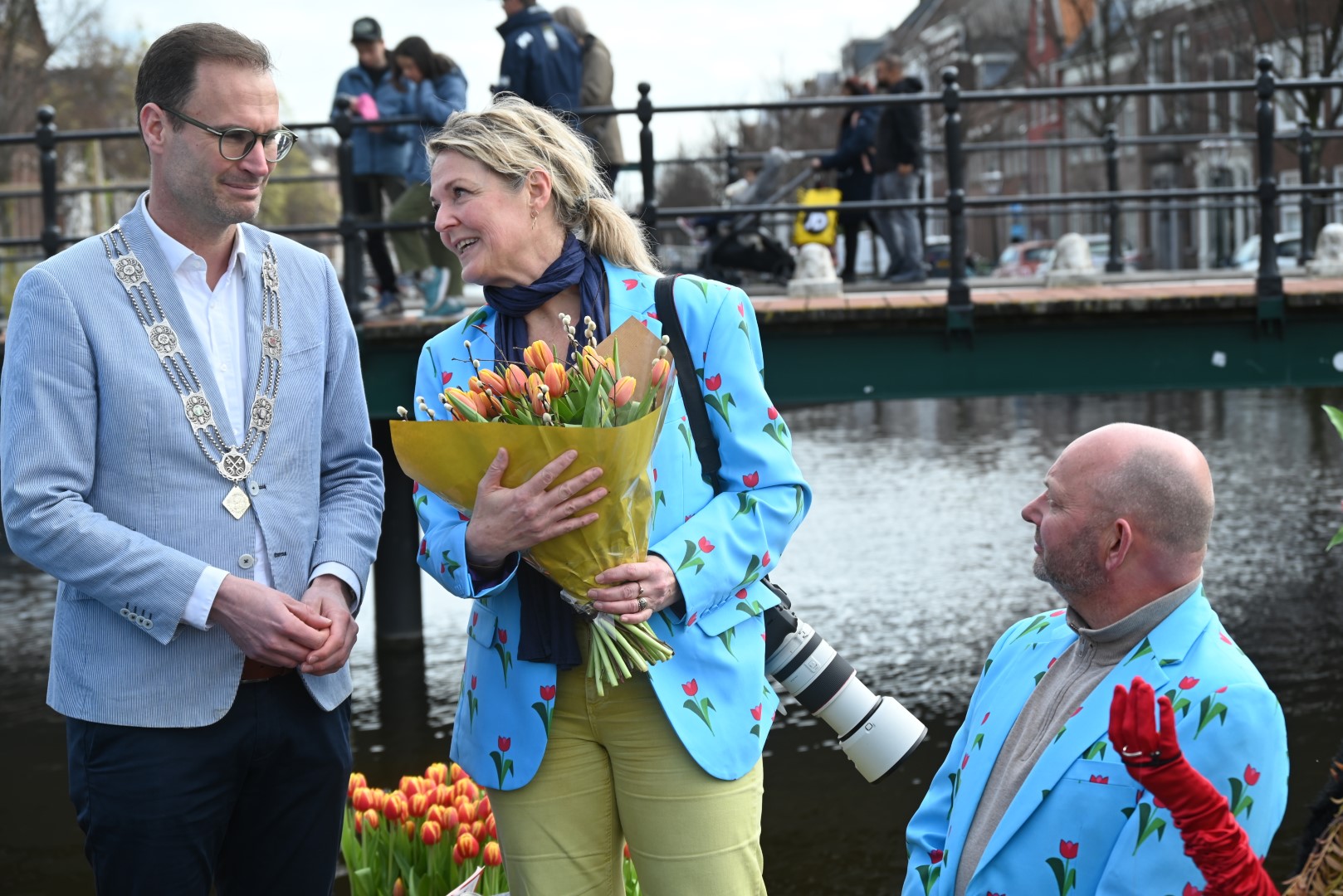 De Tulpenboot legde aan bij de Beestenmarkt, waar Burgemeester Peter Heijkoop de Veenmeermin welkom heette en niet alleen het eerste bosje tulpen in ontvangst nam, maar ook het eerste exemplaar van de puzzel ‘Leidse Tulpendag’. Uitgegeven door uitgeverij Puzzelstreken. Op de puzzel staan diverse bekende Leidenaren zoals; Rembrandt, Armin van Buuren, Peter Labrujere en Barry Badpak. Nadat Barry Badpak de puzzel had onthuld, voer de boot verder het centrum in en deelden hostessen de bosjes tulpen uit.