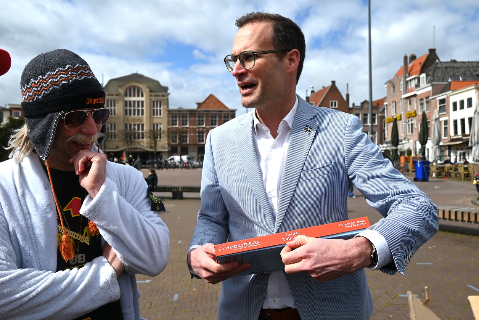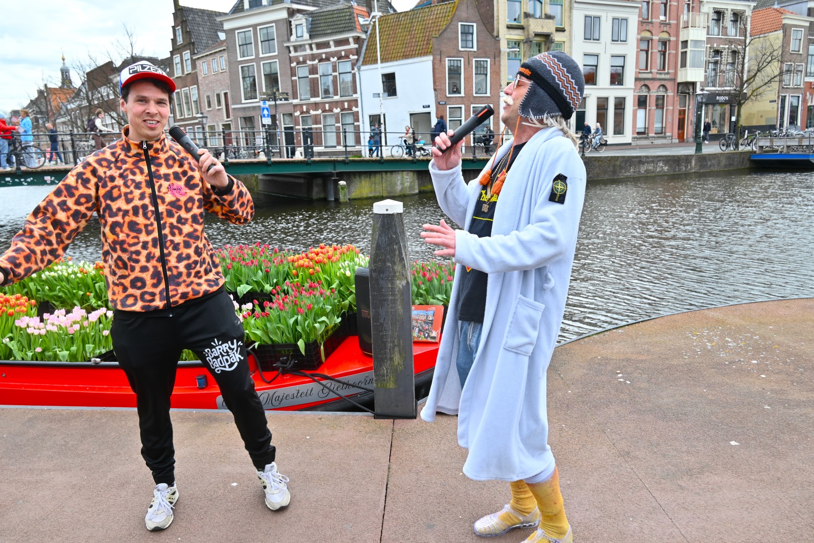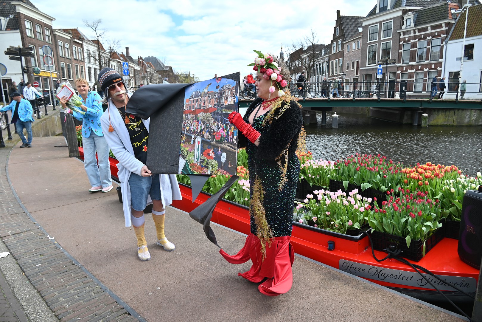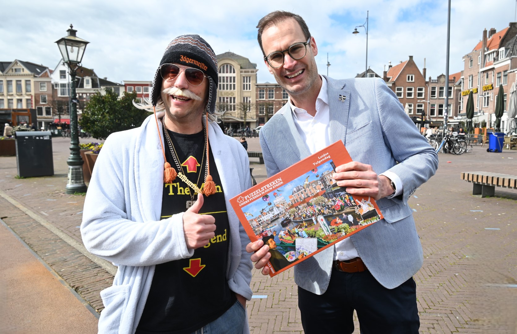 De Tulpenboot legde aan bij de Beestenmarkt, waar Burgemeester Peter Heijkoop de Veenmeermin welkom heette en niet alleen het eerste bosje tulpen in ontvangst nam, maar ook het eerste exemplaar van de puzzel ‘Leidse Tulpendag’. Uitgegeven door uitgeverij Puzzelstreken. Op de puzzel staan diverse bekende Leidenaren zoals; Rembrandt, Armin van Buuren, Peter Labrujere en Barry Badpak. Nadat Barry Badpak de puzzel had onthuld, voer de boot verder het centrum in en deelden hostessen de bosjes tulpen uit.